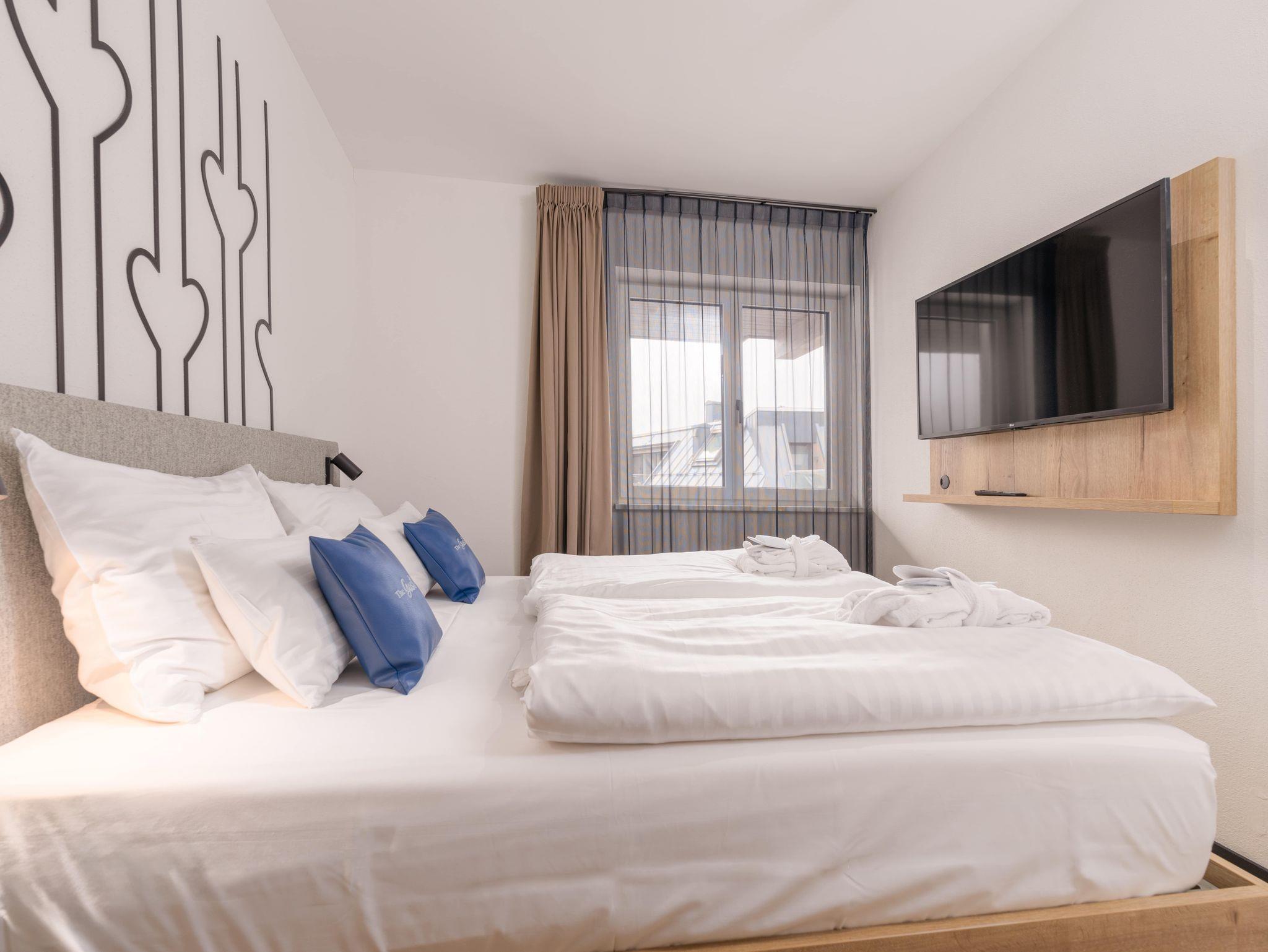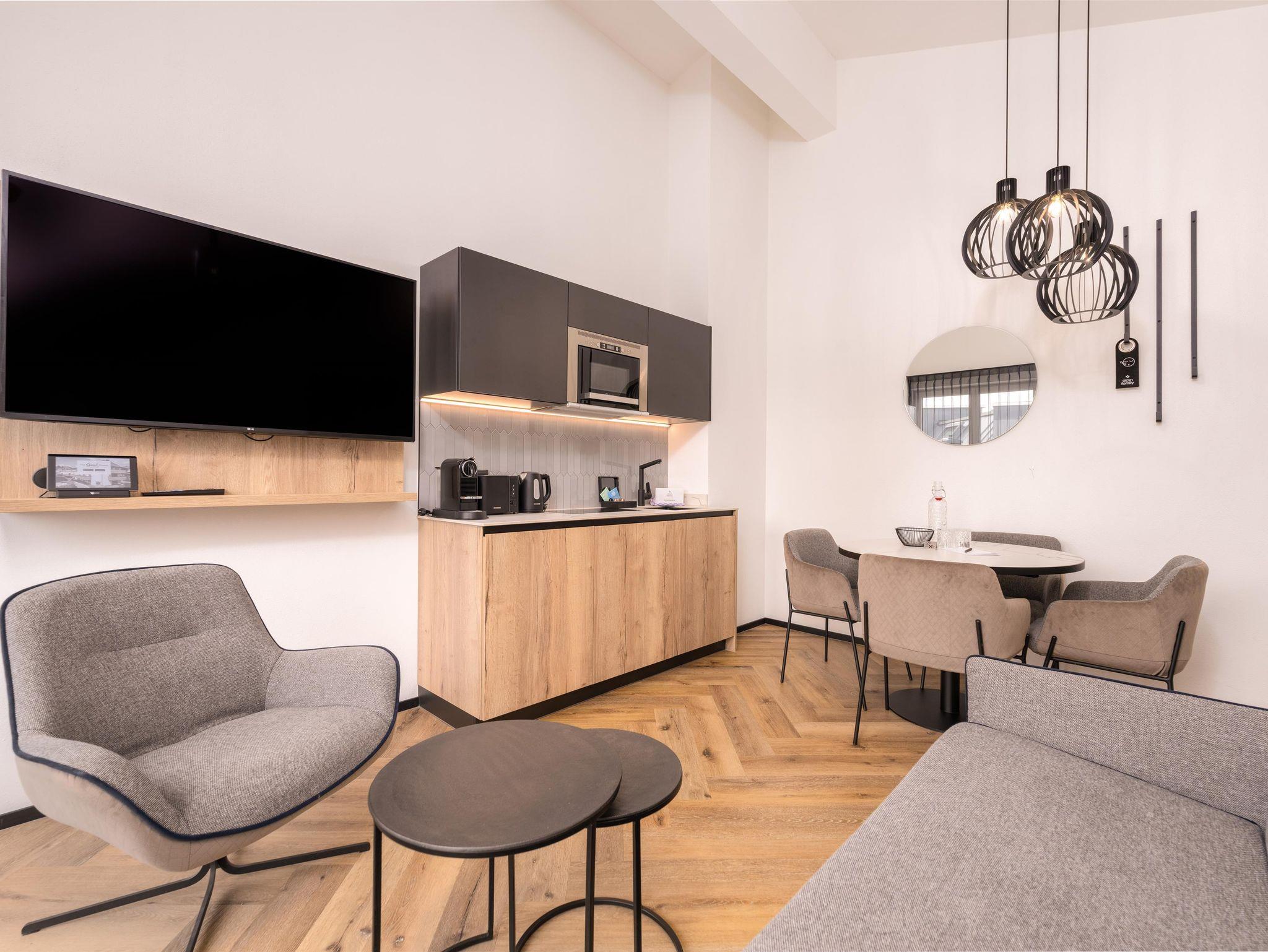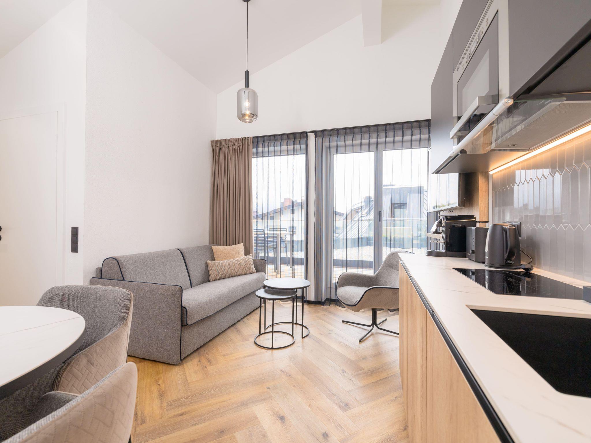 Die Superior Family Suite verfügt über ein separates Schlafzimmer mit Doppelbett, ein Bad mit Dusche und WC, ein separates WC, sowie eine voll ausgestattete Küche mit Sitzgelegenheiten. Von dort aus erreichen Sie die Terrasse. Eine Schlafcouch bietet Platz für weitere Personen.