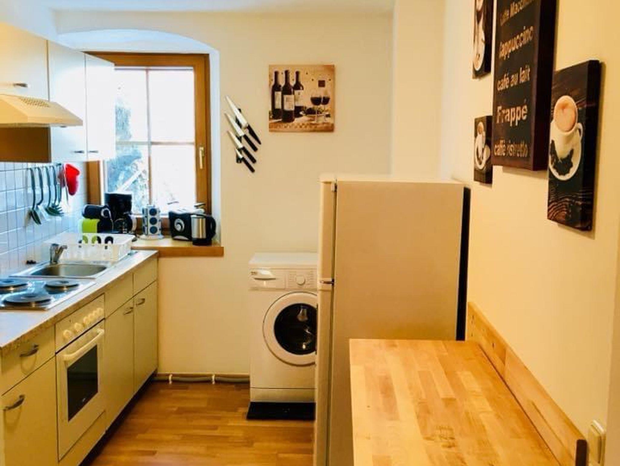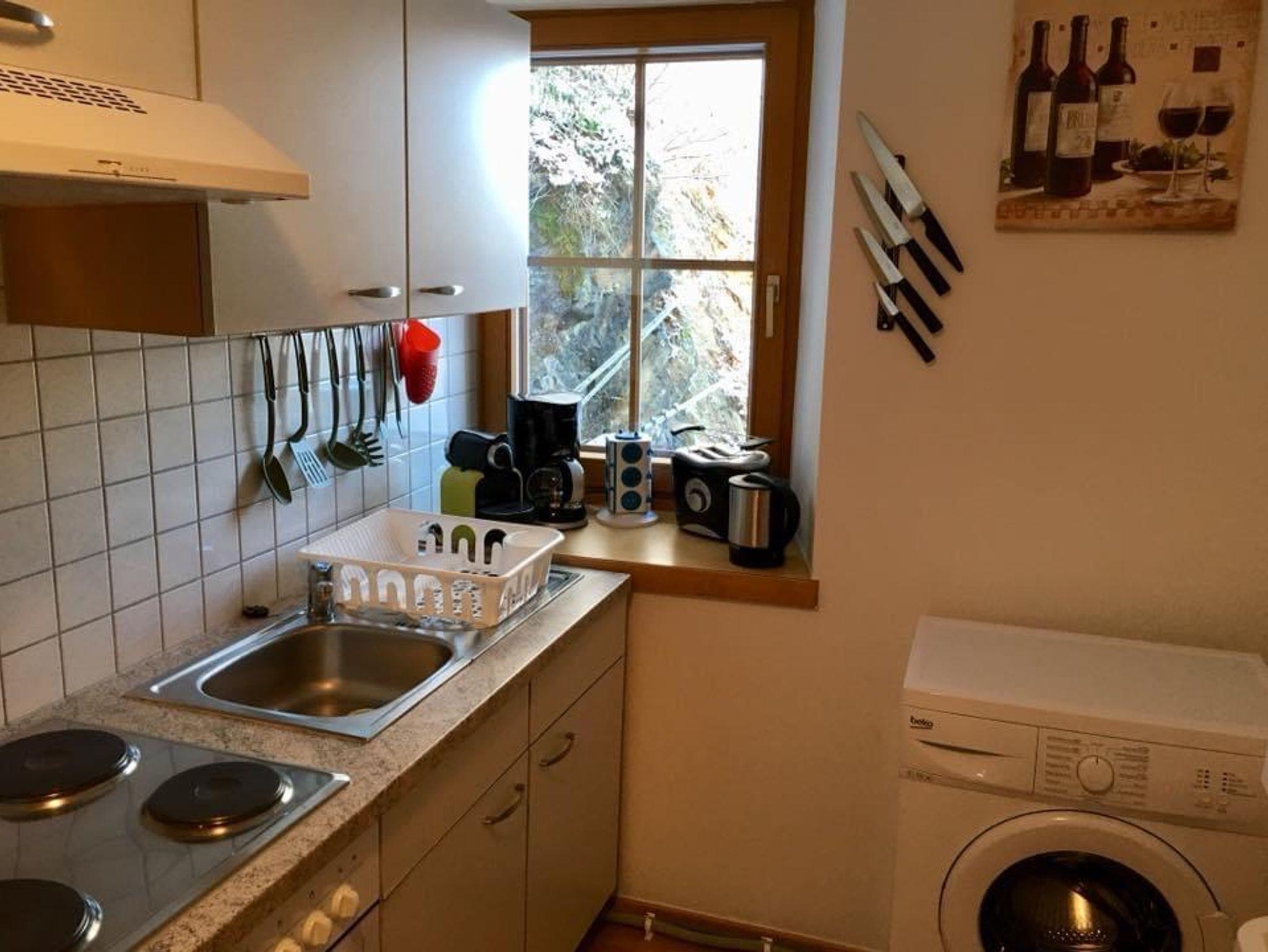 ? Voll ausgestattete Küche (Elektroherd, Backofen, Kühlschrank, Mikrowellenherd, Wasserkocher, Kaffeemaschine, Toaster, Geschirr)