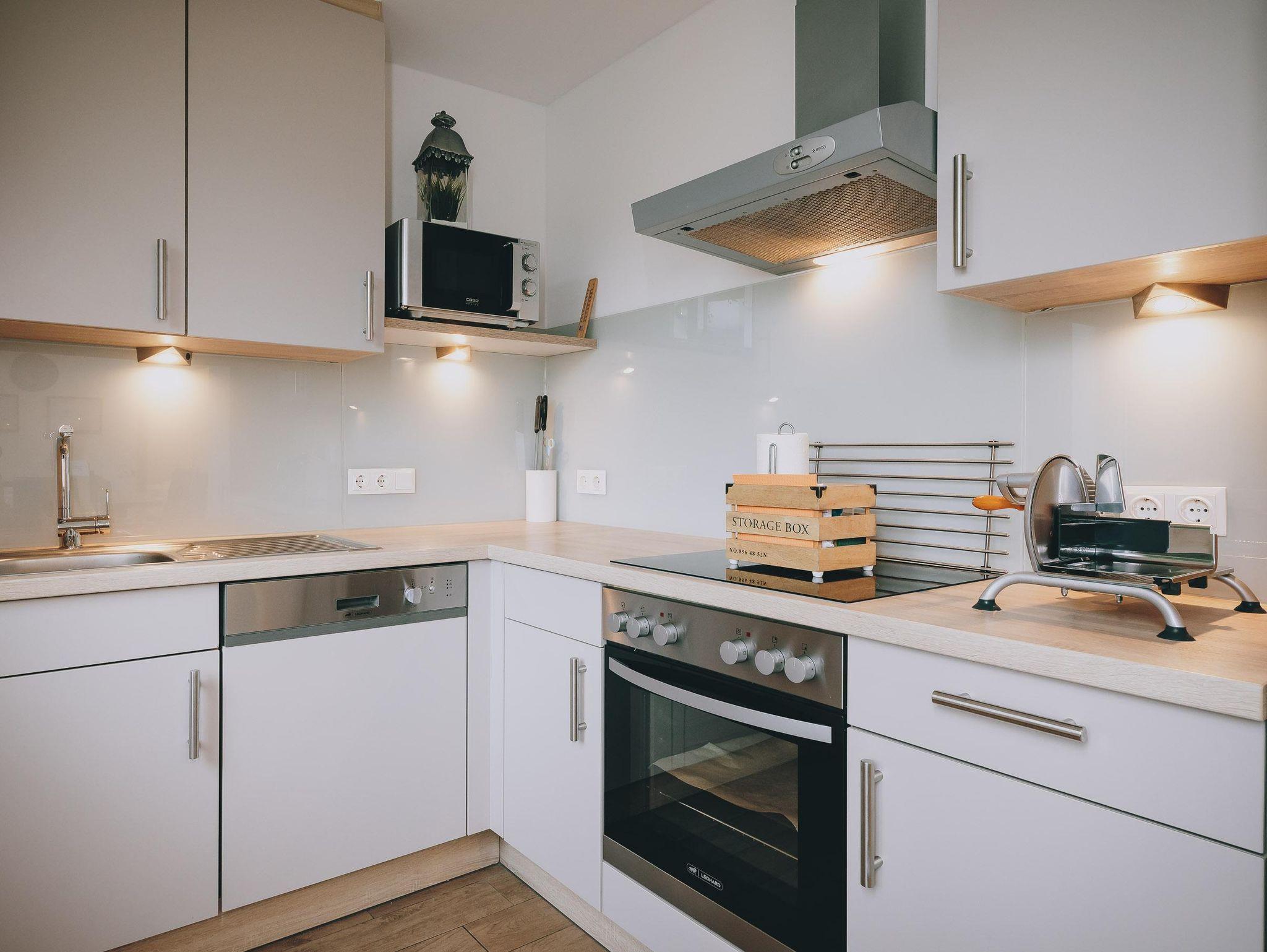 • voll ausgestattete Küche inklusive Backofen, Mikrowelle und Geschirrspüler