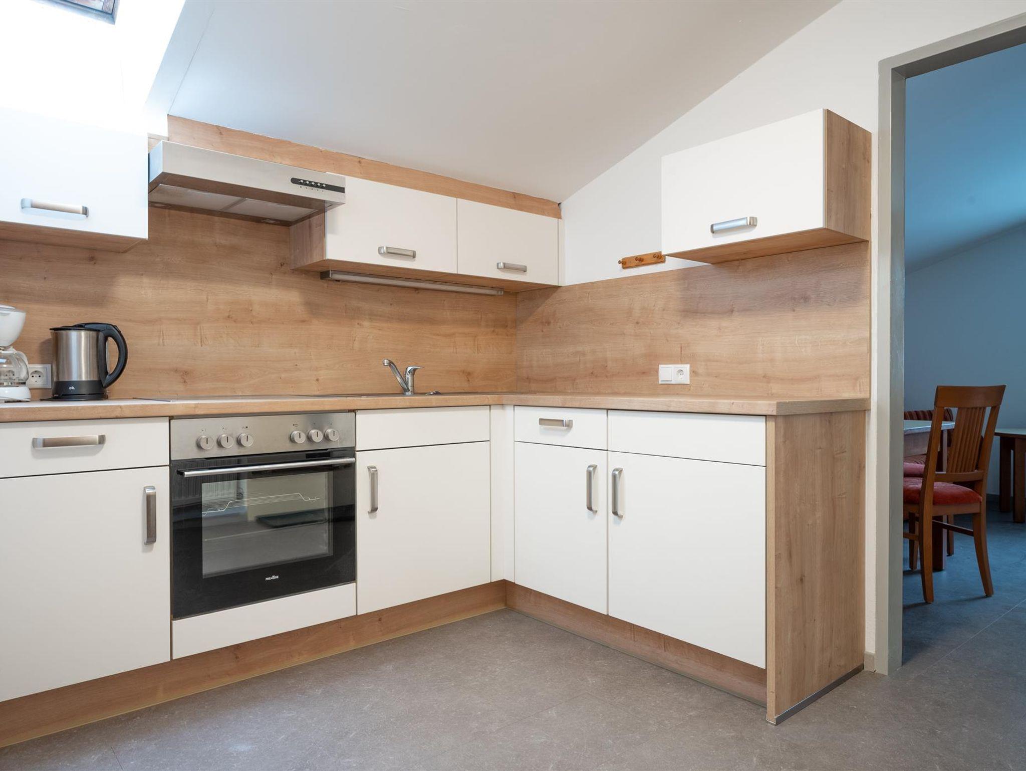 Der Wohnbereich verfügt über eine große Schlafcouch für zwei weitere Personen. Hell eingerichtet und mit seinen gemütliche Dachschrägen garantiert das Penthouse für einen entspannten Urlaub. Die Küche: Kühl/Gefrierschrank, Backofen, Geschirr/Besteck, Kochutensilien, Kaffeemaschine, Toaster und einen Wasserkocher. Im Keller gibt es Aufbewahrungsmöglichkeiten für Ski und Rad und hinter dem Haus Parkplätze für Motorrad oder Auto.