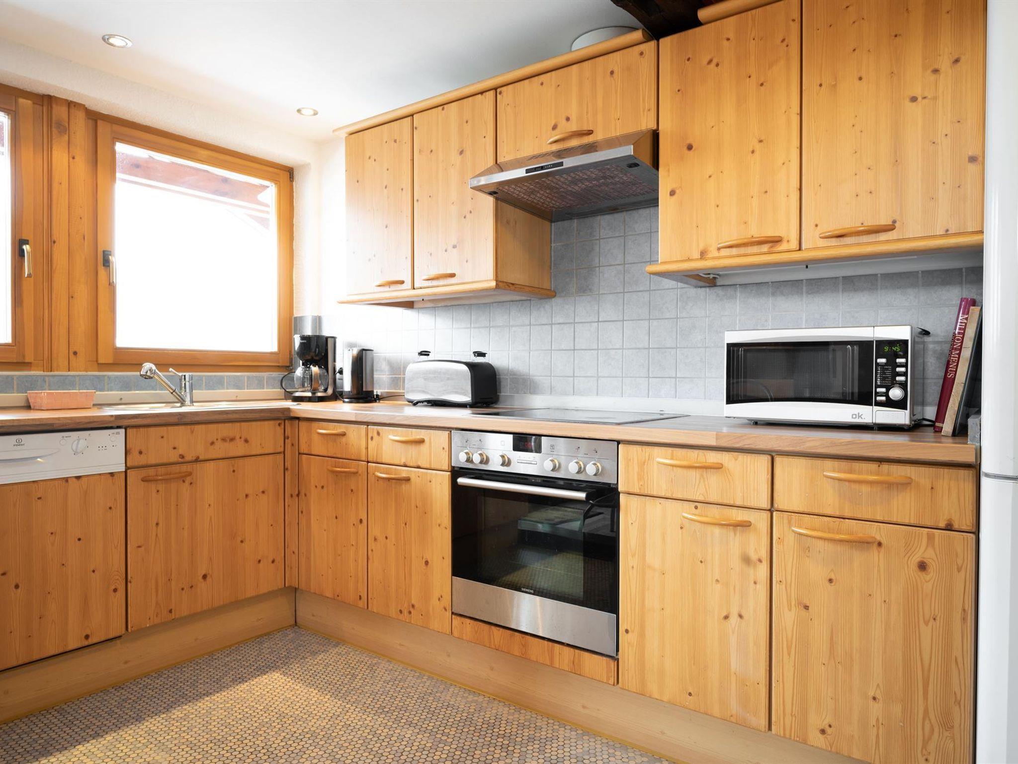 • Komplett ausgestattete Küche mit vier Kochfeldern, Backofen, Kühlschrank und Geschirrspüler