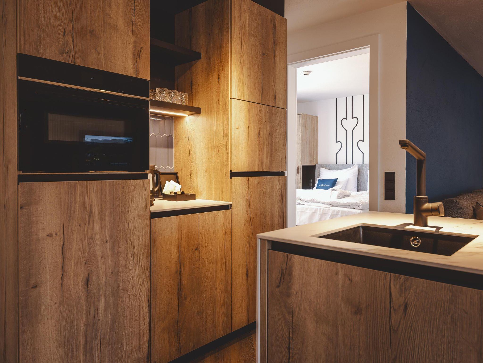 Die 3-Schlafzimmer Deluxe Suite verfügt über 3 separate Schlafzimmer mit Doppelbett, 2 Bäder mit Dusche und WC, 1 weiteres Bad mit Dusche, sowie ein separates WC. Eine voll ausgestattete Küche mit Sitzgelegenheiten lädt zum gemeinsamen Kochen ein. Absolutes Highlight dieser Suite ist die private Sauna. Vom Wohnbereich aus erreichen Sie den Balkon. Eine Schlafcouch bietet Platz für 2 weitere Personen.