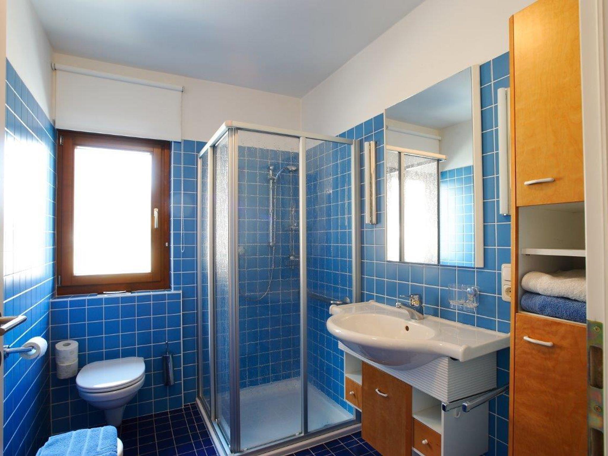 Das Bad beinhaltet eine Dusche mit Duschwand, einen großen Waschtisch mit seitlichen Ablagen, einen Schrank und eine WC- Anlage.