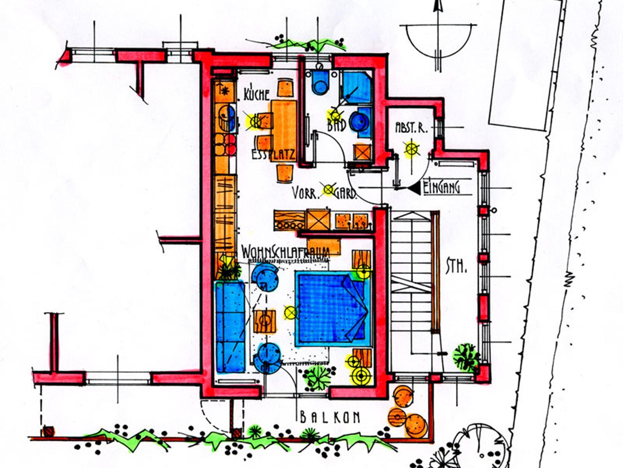 Die offen gestaltete, modern möblierte 35 m2 große Ferienwohnung mit breitem Südbalkon befindet sich im 1. Stock des Hauses zum See hin orientiert.