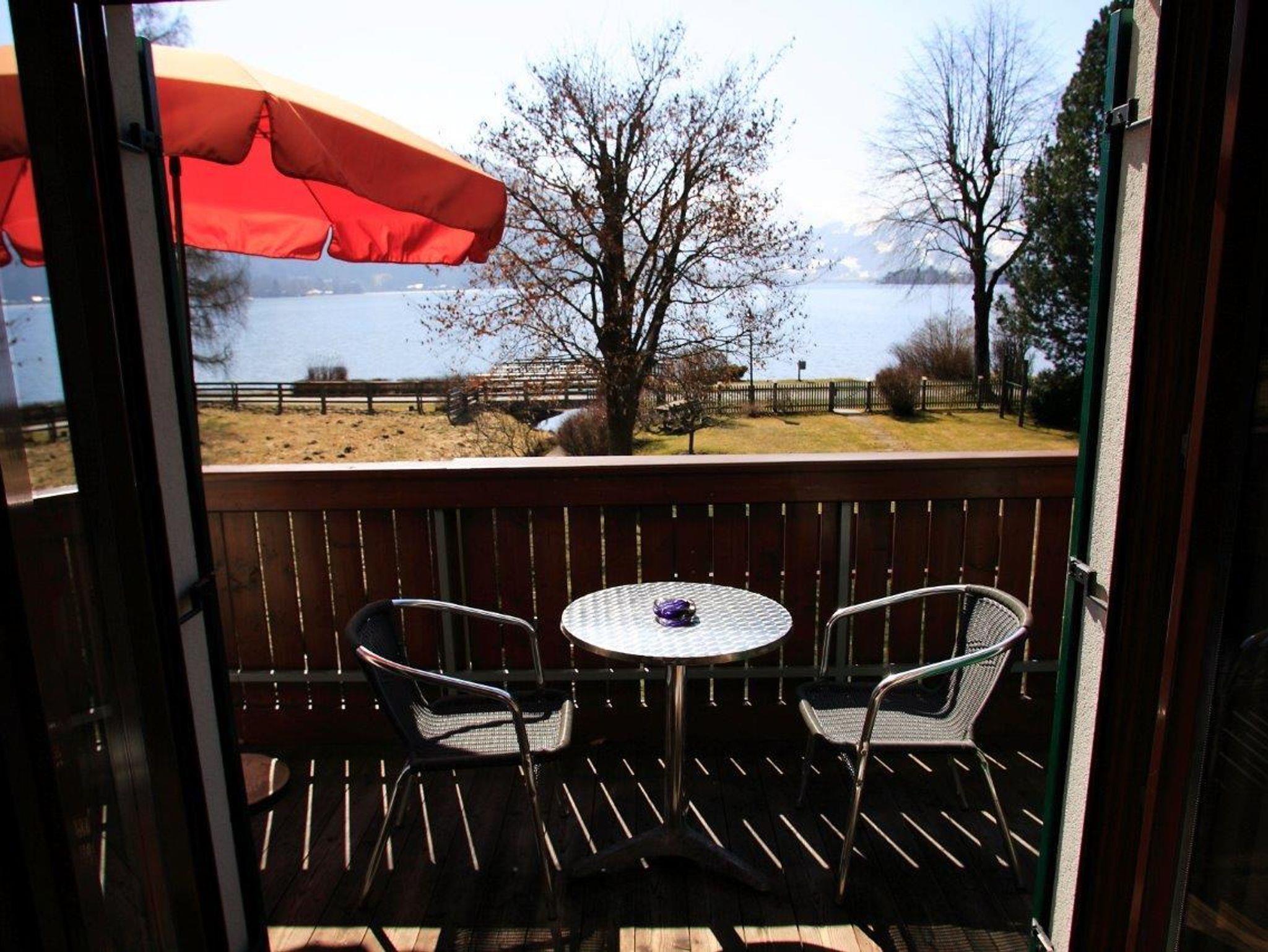 Der breite Südbalkon mit Sitzgruppe ermöglicht einen angenehmen Aufenthalt im Freien und eine großartige Aussicht über den See und den Garten in die umliegenden Berge.