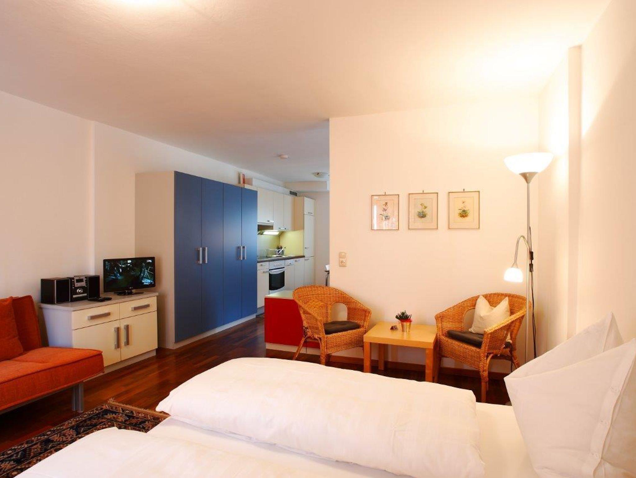 Sie besteht aus Vorraum mit Garderobe und Schränken sowie einem großen Wohnschlafraum mit Balkon, Doppelbett mit Nachtkästchen, und bequemer Sitzgruppe mit Couch.