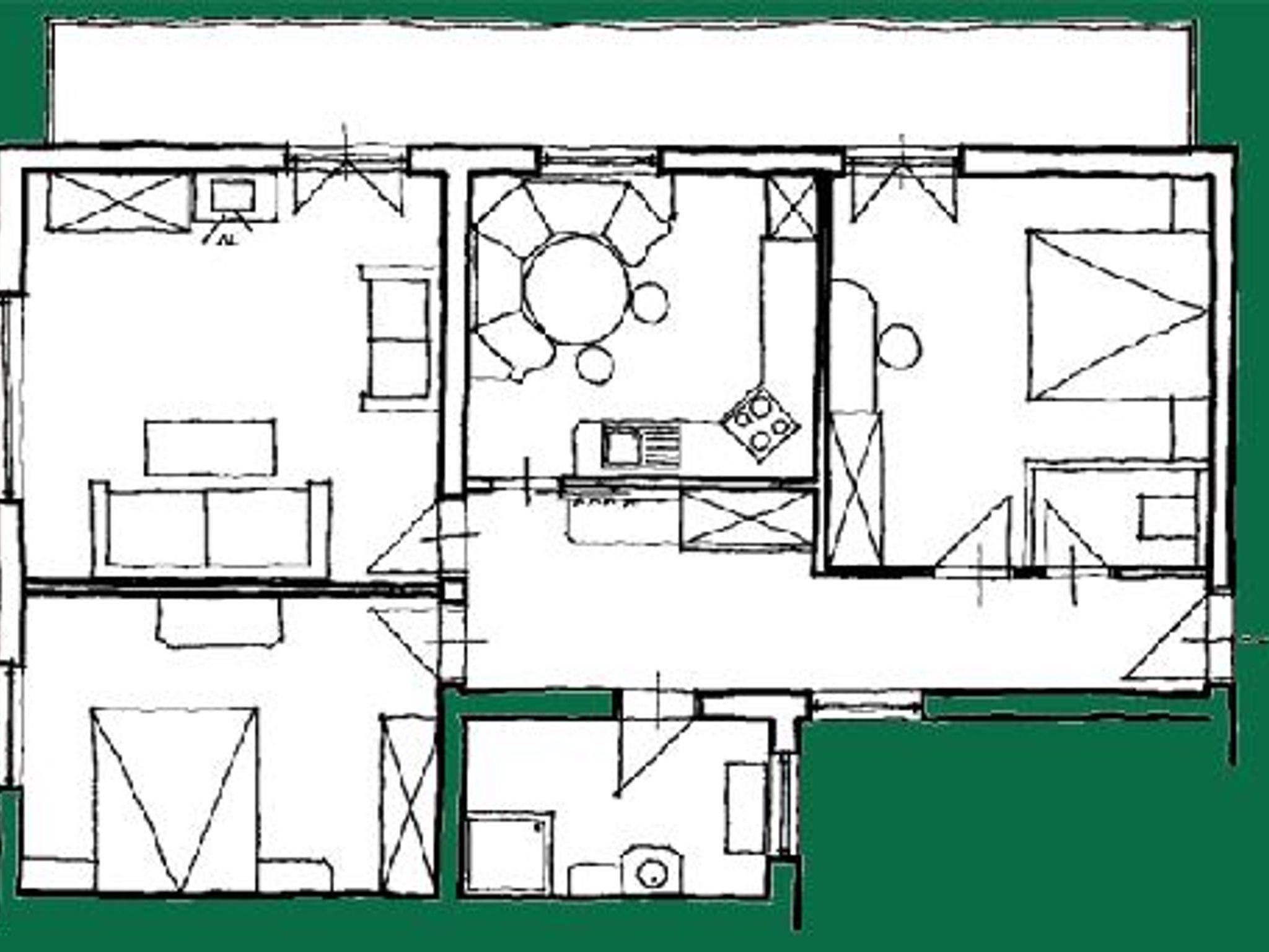 Appt f. 4-6 Pers. (ca. 95 m² - eigenes kleines Haus)best. a. einem Zimmer m. Doppelbett, einem Zimmer mit Doppelbett und Einzelbett, ein Wohn/Schlafraum mit Ausziehcouch, separater, voll ausgestatteter Küche m. Vierplattenherd, Backrohr, Geschirrspüler, Microwelle, Kühlschrank mit kl. Gefrierfach, Eßecke, ger. Bad, WC sep., Kabel-TV, WLAN, Südbalkon!