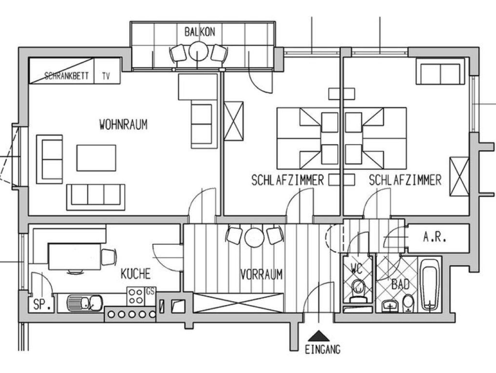 • 100 m² Wohnung, bestehend aus einem Wohn-Schlafzimmer mit TV
