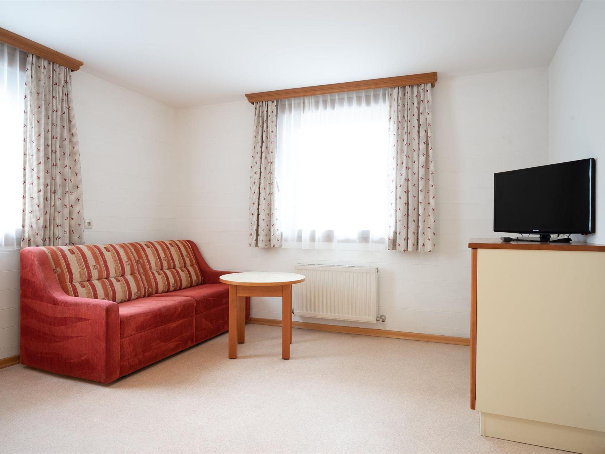 Das Apartment verfügt über ein Schlafzimmer mit Doppelbett, sowie ein Wohnzimmer mit einem Hochbett für zwei weitere Personen. Die Küche befindet sich in einem separaten Zimmer. Unser Apartment macht nämlich eine moderne Küche aus: Hierfür haben wir eine Küche mit Kühl/Gefrierschrank, Backofen, Geschirr/Besteck, Kochutensilien, Kaffeemaschine, Toaster und einen Wasserkocher eingerichtet. Oben drauf gibt es noch einen Ski/Radkeller, sowie Parkplätze hinter dem Haus.