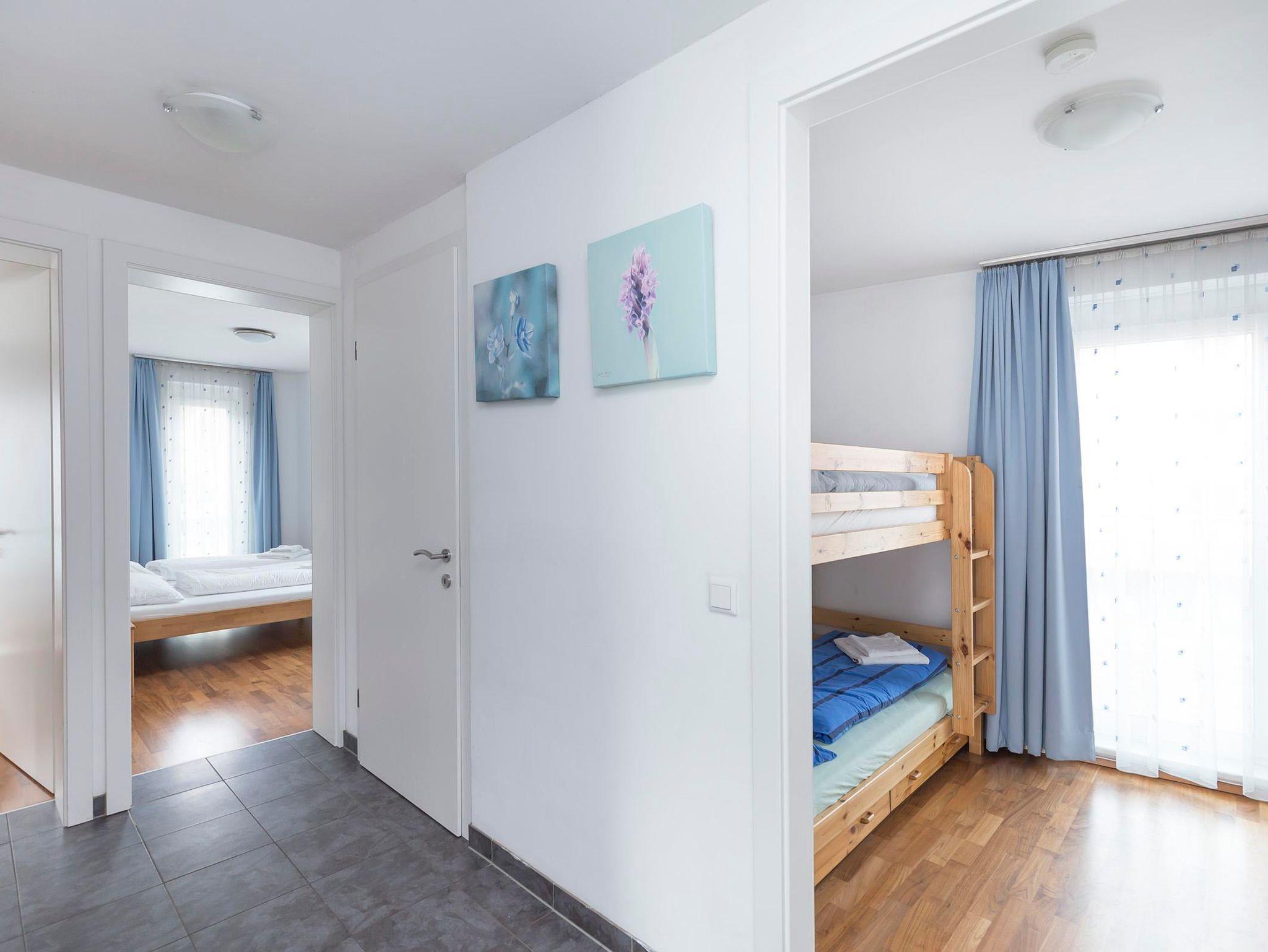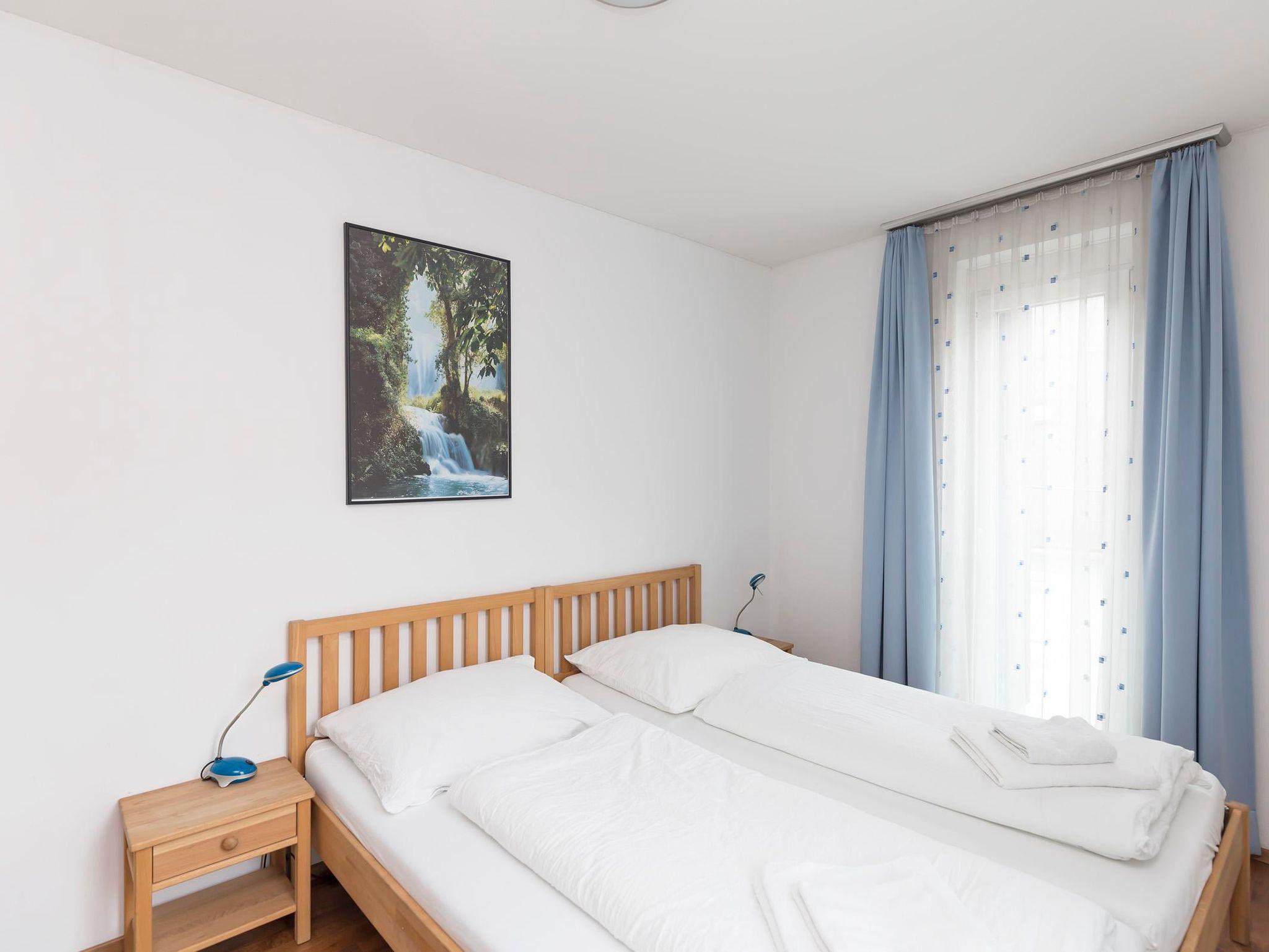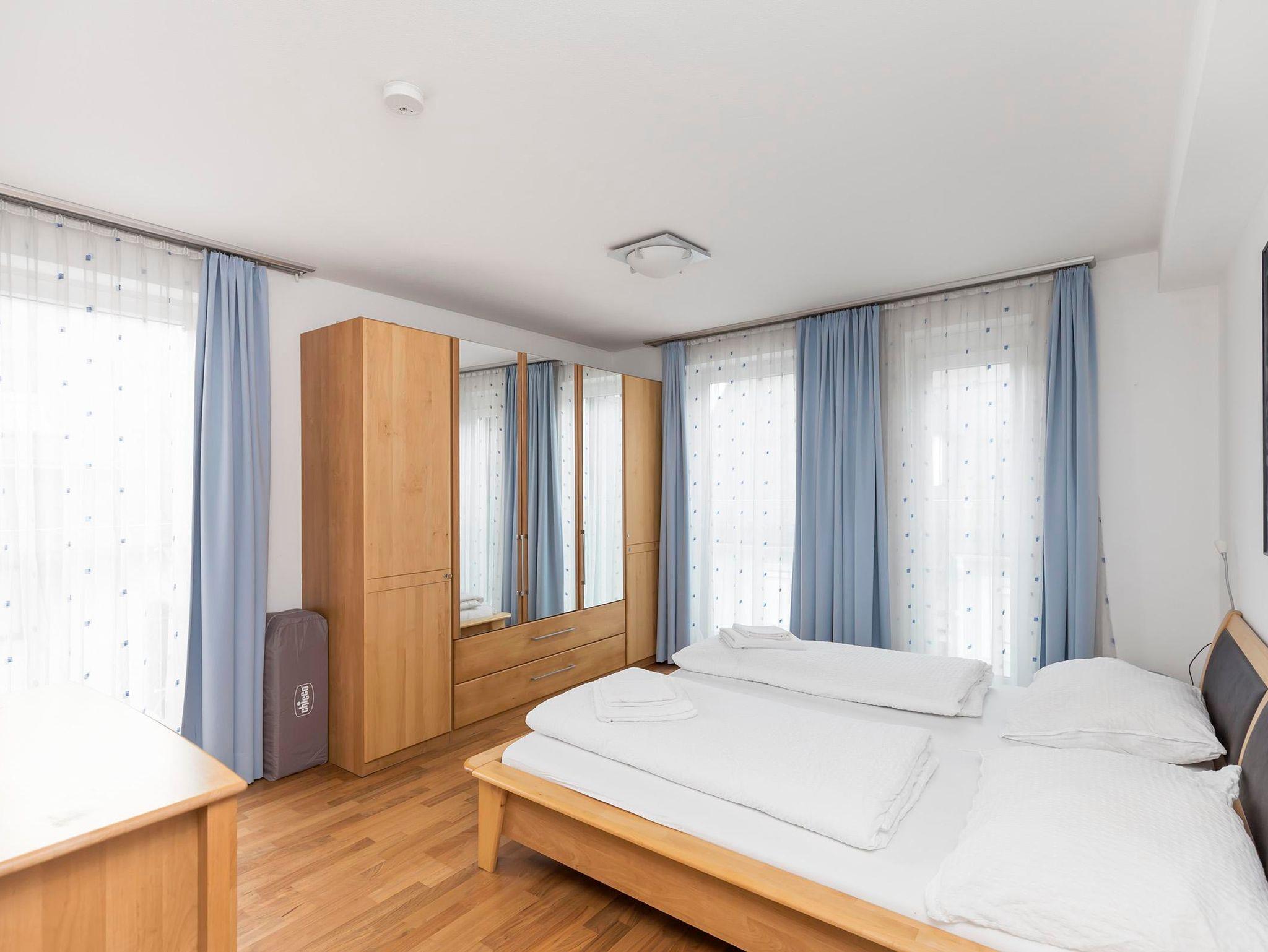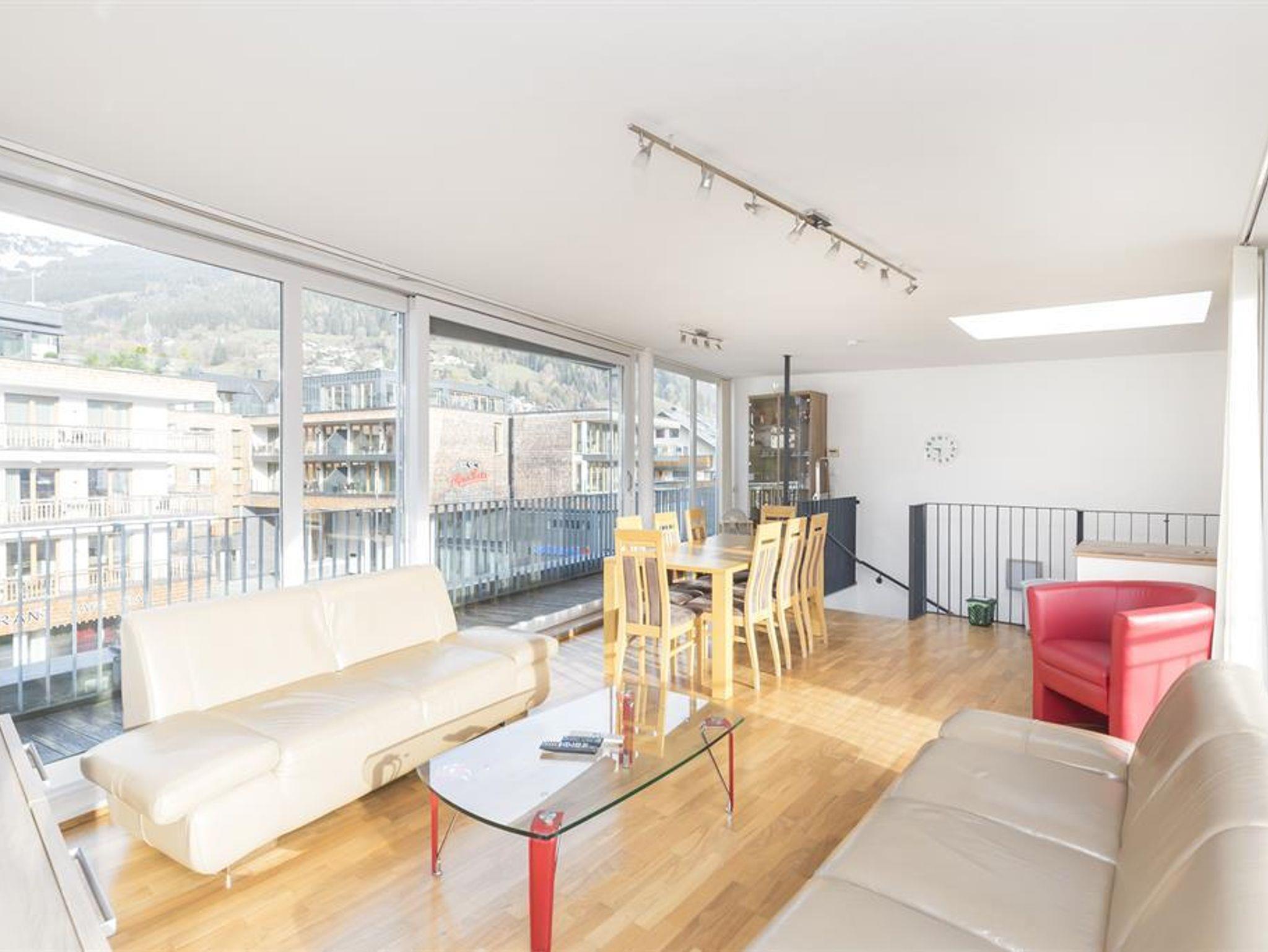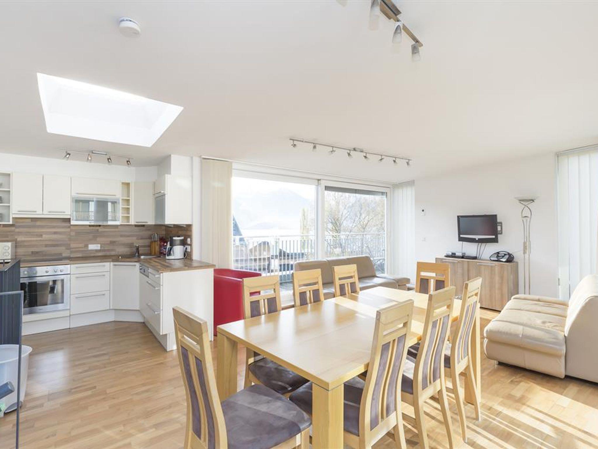 Located just a very short walk from the railway station, this duplex penthouse apartment is a 5 minute walk from the CityXpress lift. There is a communal entrance with lift to the 2nd floor entrance to the apartment. The hallway leads to a double bedroom with en-suite bathroom (also accessible from the hallway), a twin bedroom, bunk bedroom, shower room with wash-basin and separate toilet. Stairs to: top floor open-plan living and dining area with Sat TV/DVD/CD player and fully equipped kitchen with microwave, dishwasher, fridge/freezer, electric oven and hob. Access from the living/dining area to a wrap-around balcony with table and chairs with stunning views of the lake and mountains. There is dedicated and covered parking for one car. In the basement of the apartment block, the apartment has a dedicated heated boot rack for 5 pairs of boots
