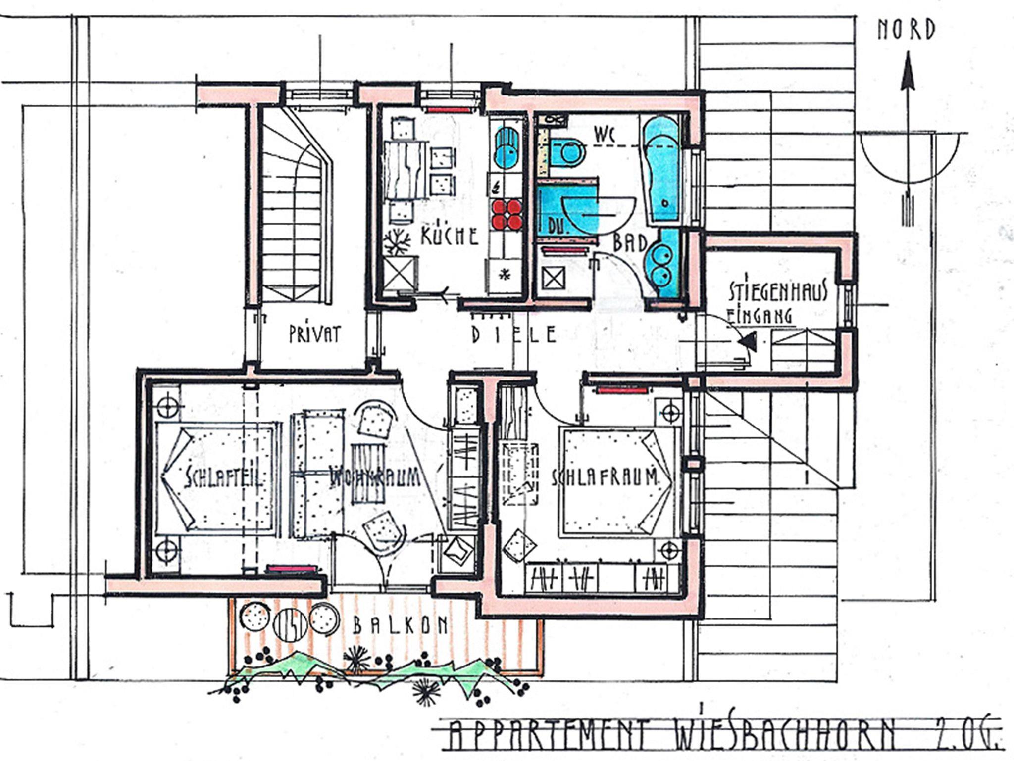 Im 2. Stock liegt die 3-Raum Ferienwohnung mit Balkon und 65 m2 Nutzfläche.