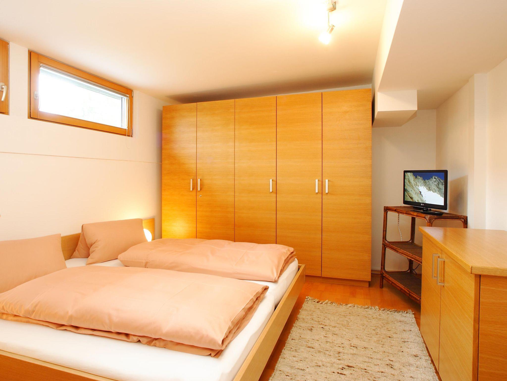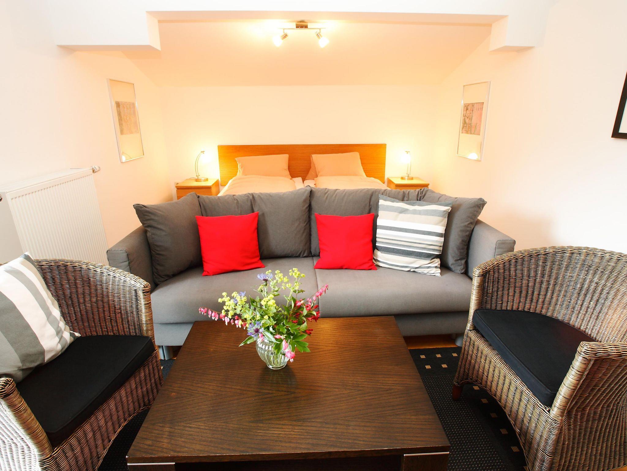 Über einen Vorraum mit Garderobe erreicht man einen nach Süden zum See orientierten Wohnraum mit Balkon und großartiger Aussicht über den See und den Garten, mit bequemer Wohn-Sitzgruppe mit großer Couch, dahinter ein Doppelbett. Ein weiterer, separater Schlafraum mit Doppelbett, großem Kleider- und Wäscheschrank.