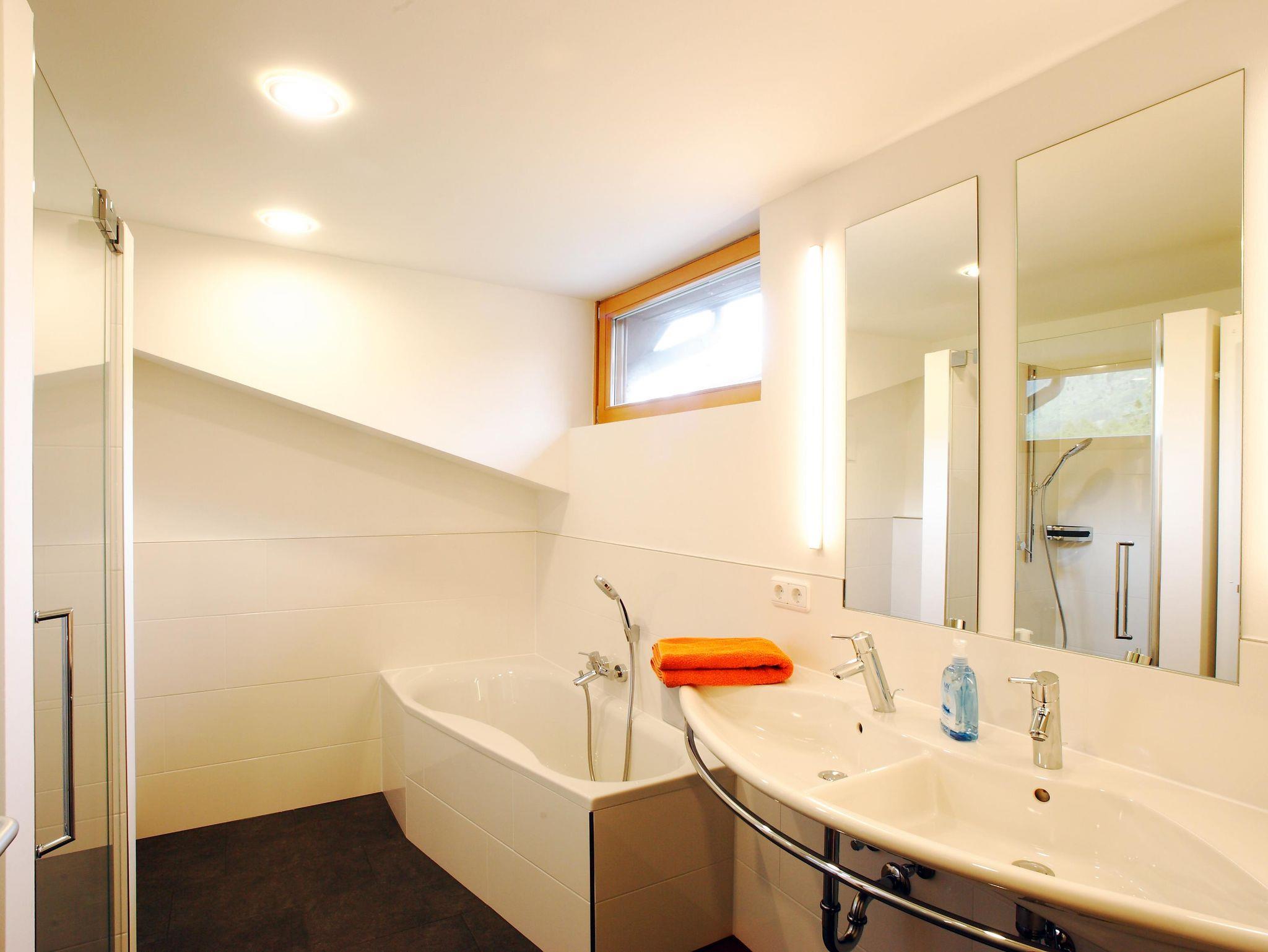 Das Bad ist verfliest und mit WC- Anlage, zusätzlicher Absaugung, Doppelwaschtisch und Badewanne samt großzügiger Duschnische mit Glastüre ausgestattet.