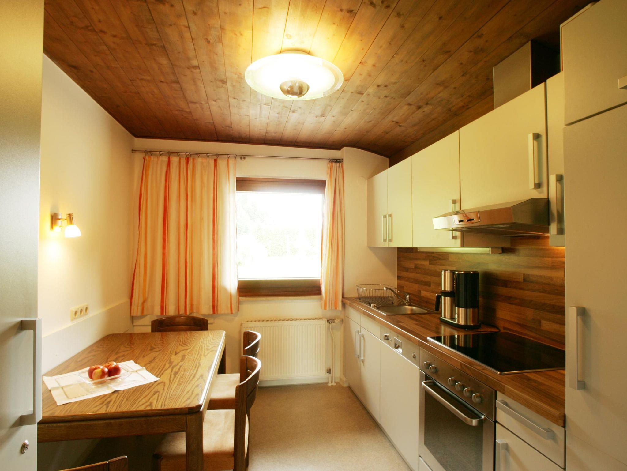 Die Küche verfügt über komplette Geräteausstattung und einen großen Essplatz.