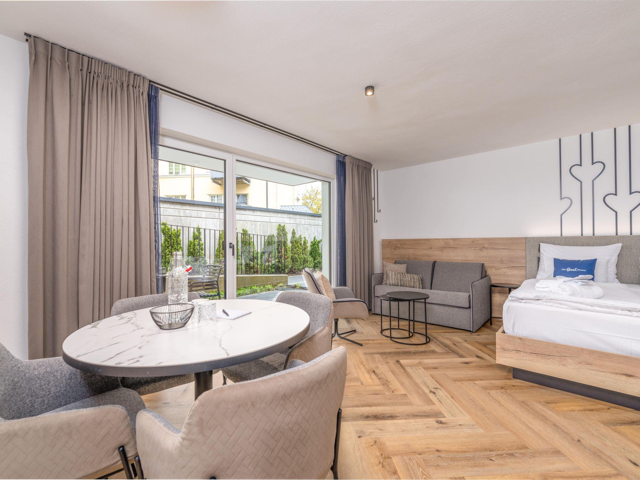 Unser Studio verfügt über ein großes Doppelbett, ein Bad mit Dusche und WC sowie über eine voll ausgestattete Küche und eine Terrasse oder Balkon. Eine zusätzliche Schlafcouch bietet Platz für weitere Personen.