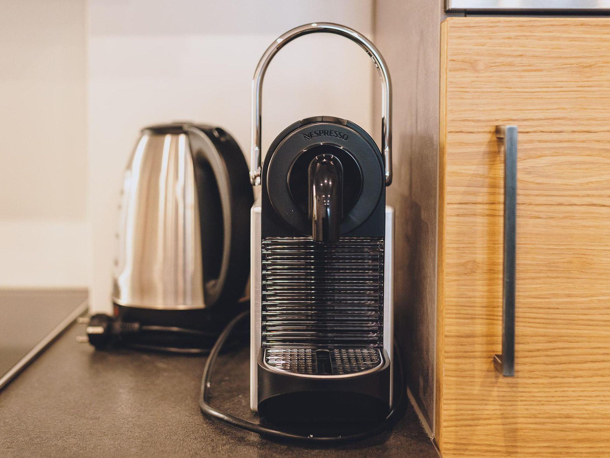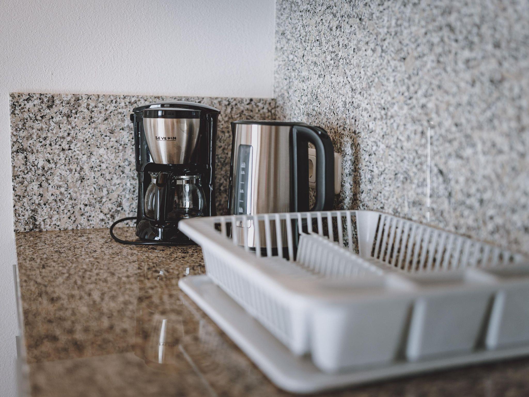 Vollausgestattete Küche mit Cerankochfeld, Kaffeemaschine, Wasserkocher, Toaster, Geschirrspüler, Kühl-Gefrierkombinatio