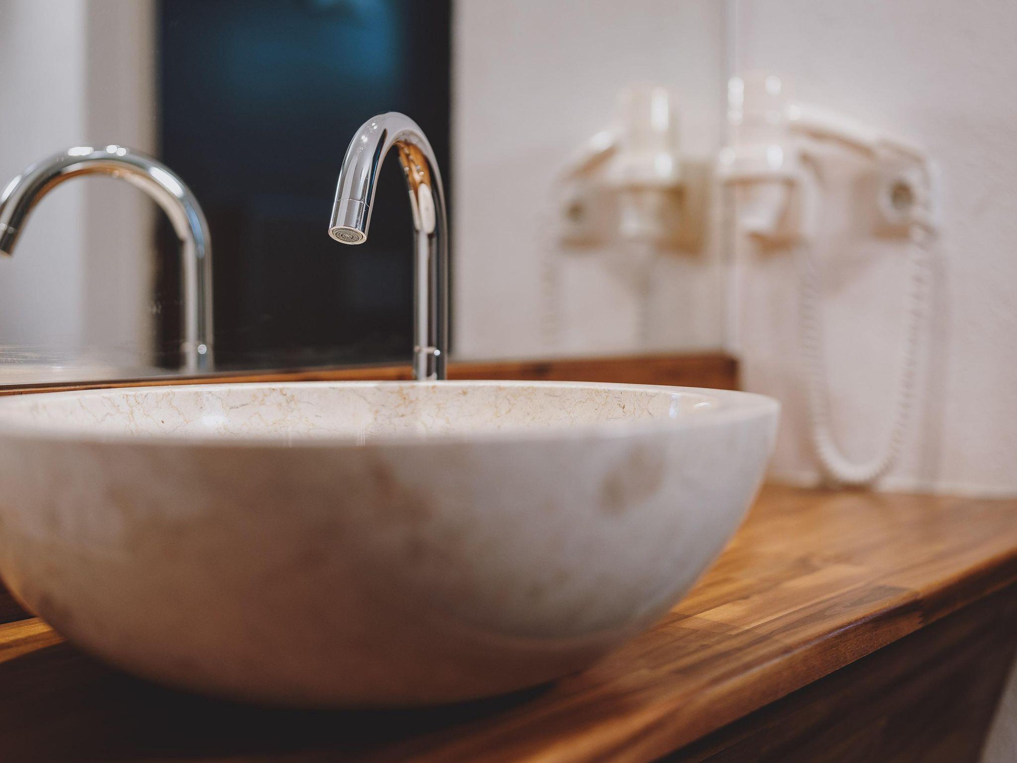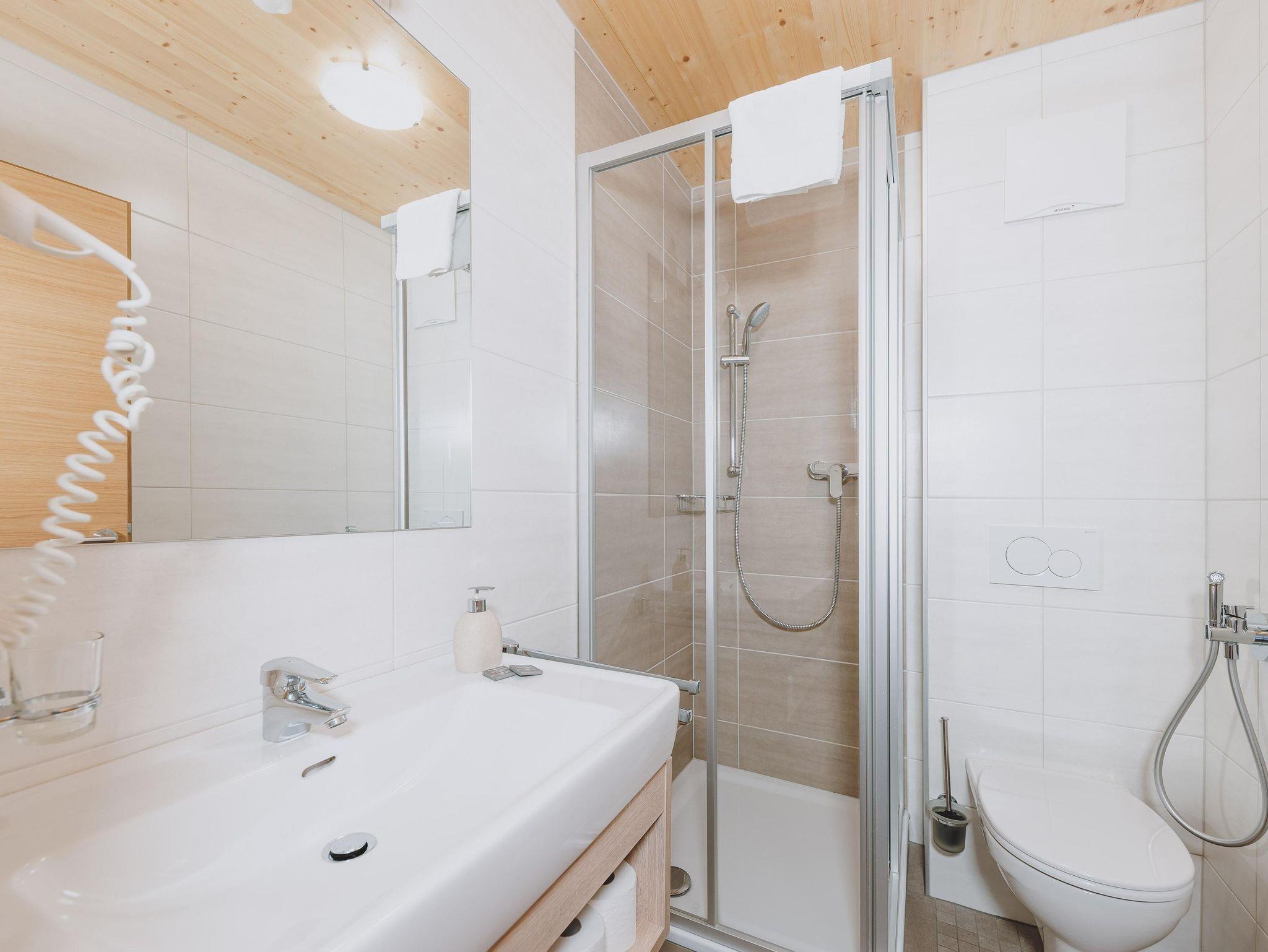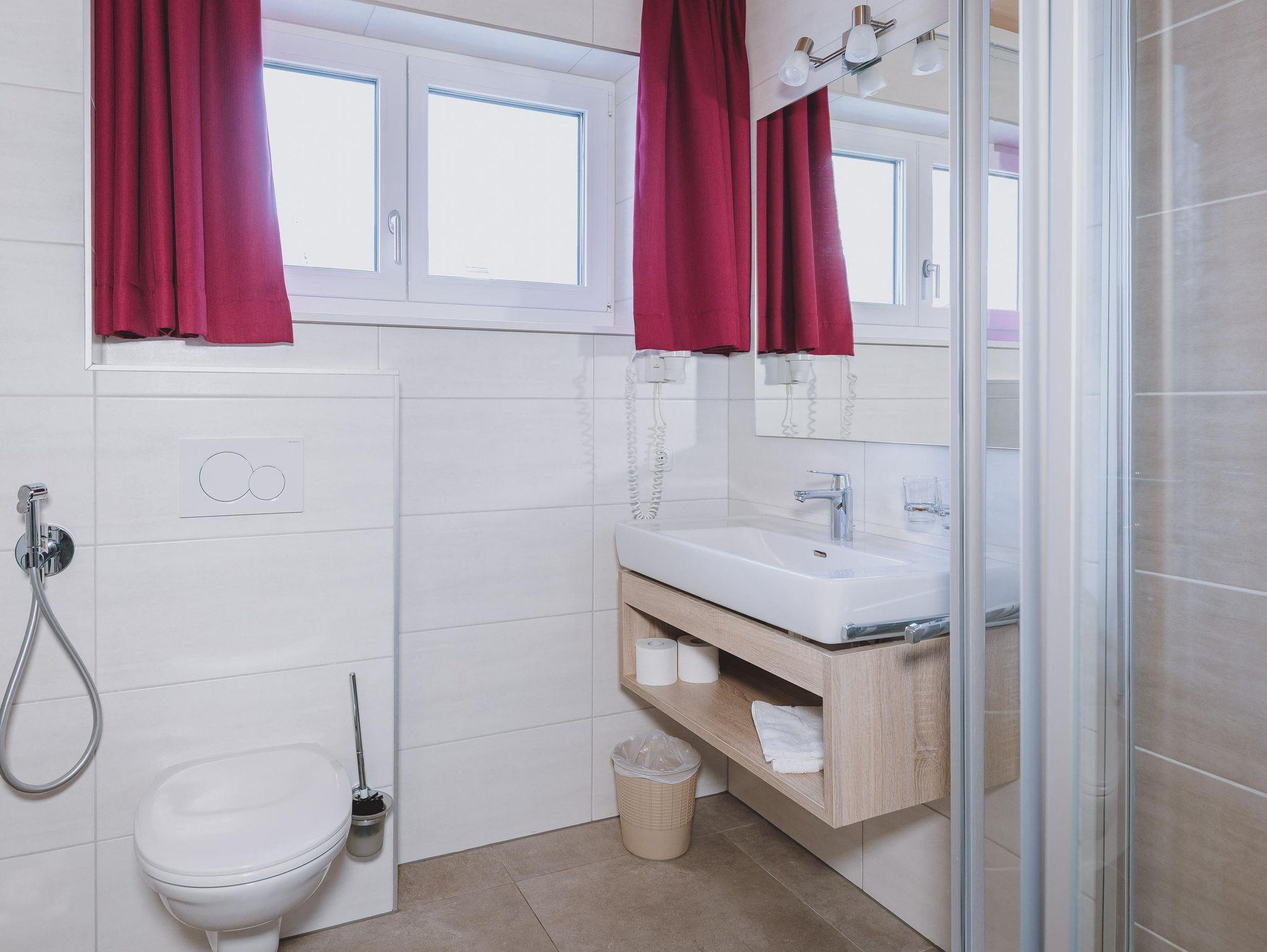 Waschbecken, Föhn, Dusche, WC mit Bidet