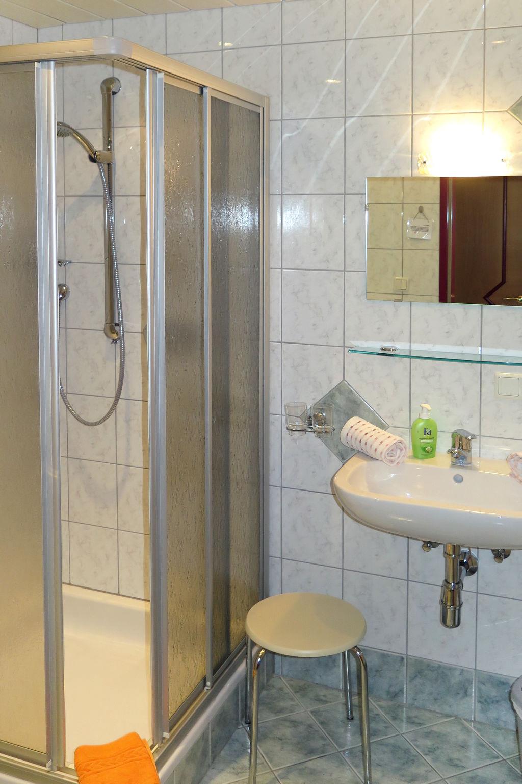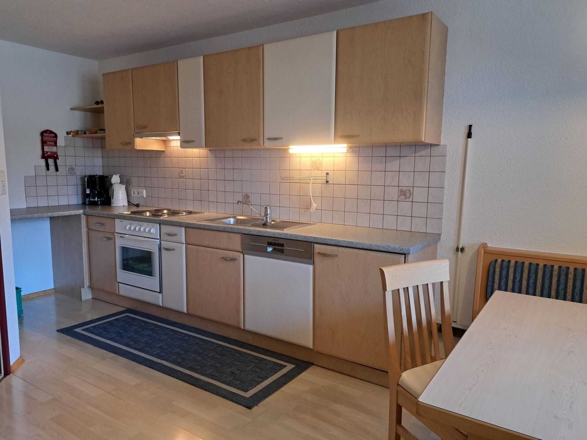 "1er Wohnung", 2-room apartment 43 m2, on the ground floor. Object suitable for 2 adults + 2 children. Bright, cosy furnishings: 1 double bedroom. Kitchen-/living room (4 hot plates, dishwasher, toaster, kettle, electric coffee machine) with 1 double sofabed, dining nook and satellite TV (flat screen). Shower/WC. Heating. Carpet. Terrace 10 m2 partly roofed, lawn. Terrace furniture, deck chairs (2). Facilities: Internet (WiFi, free). Please note: non-smokers only. Smoke alarm, fire extinguisher.