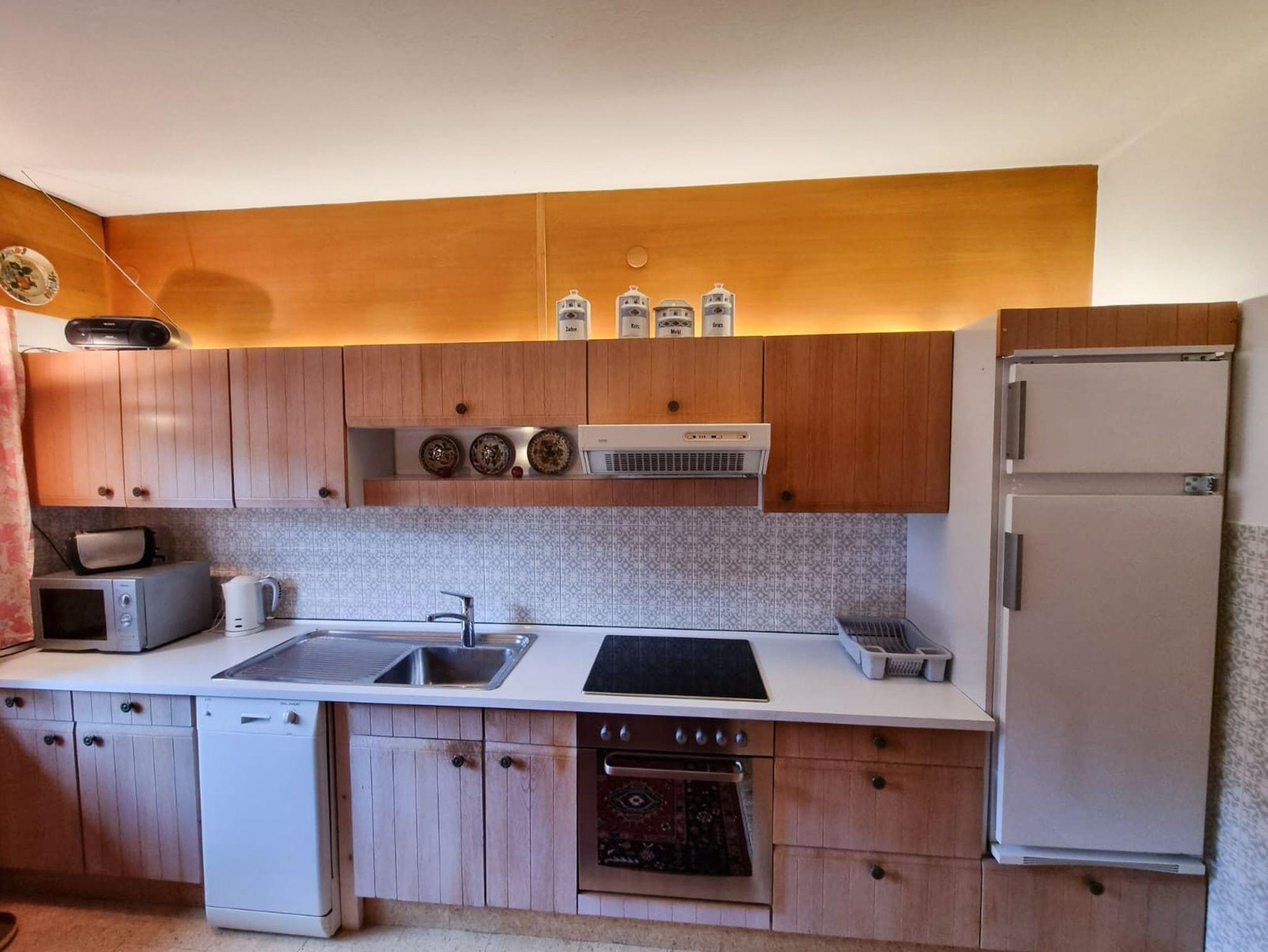 • Küche mit Kühlschrank, Cerankochfeld mit Dunstabzugshaube, Backofen, Spülmaschine, Mikrowelle, Wasserkocher, Toaster und Esstisch