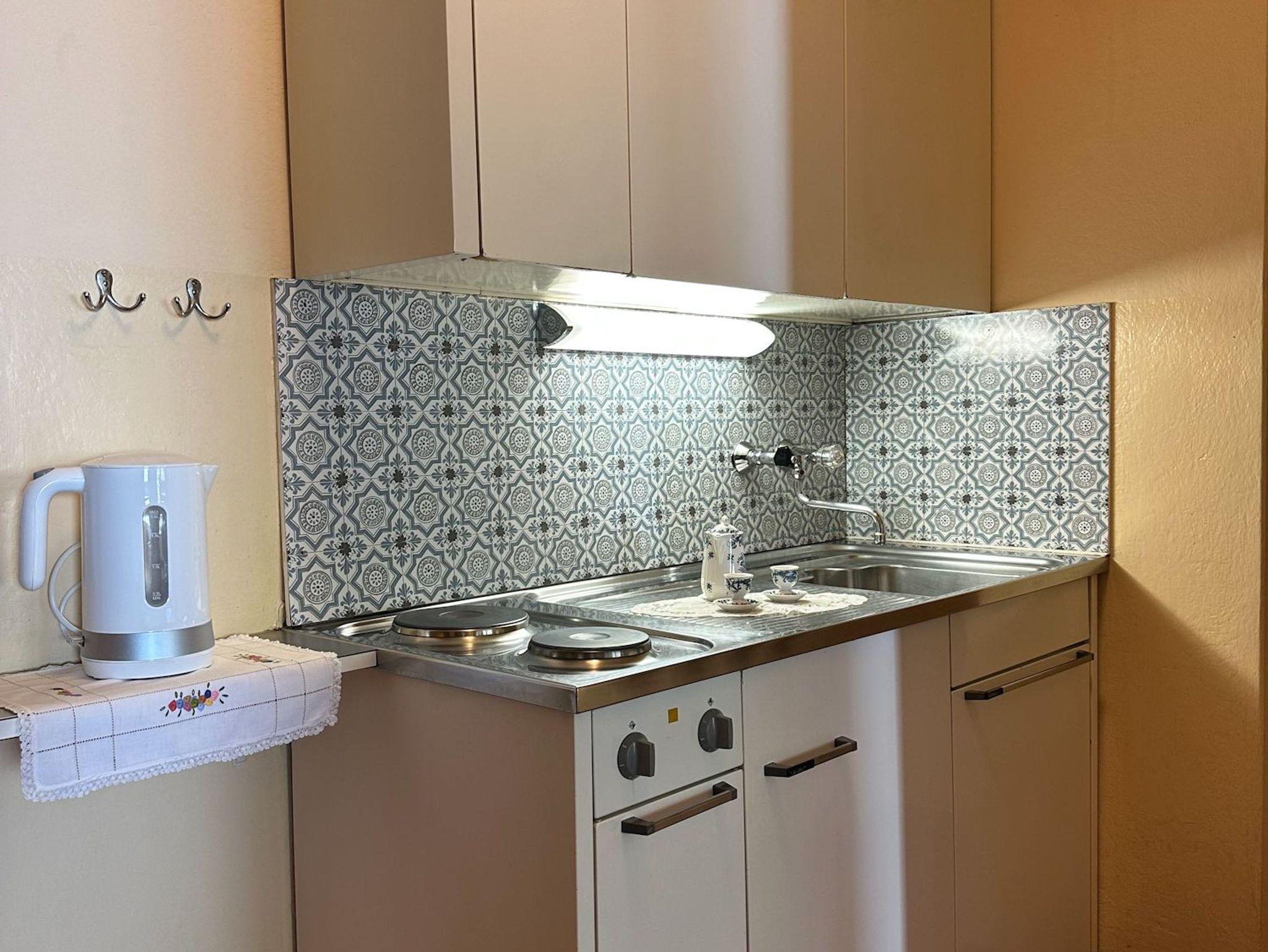 • Kochnische mit Kühlschrank, 2-Plattenherd, Kaffeemaschine, Wasserkocher und Toaster