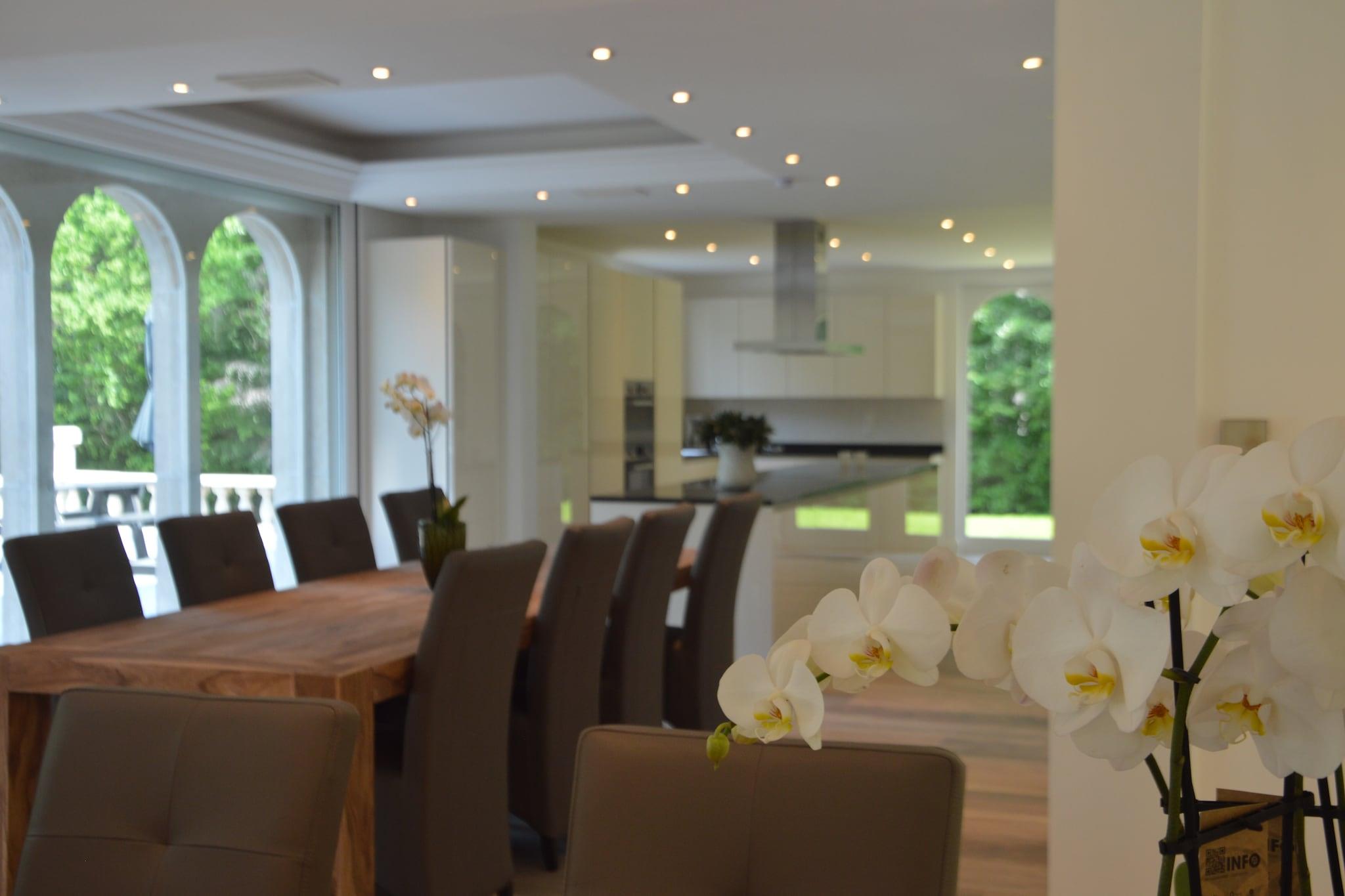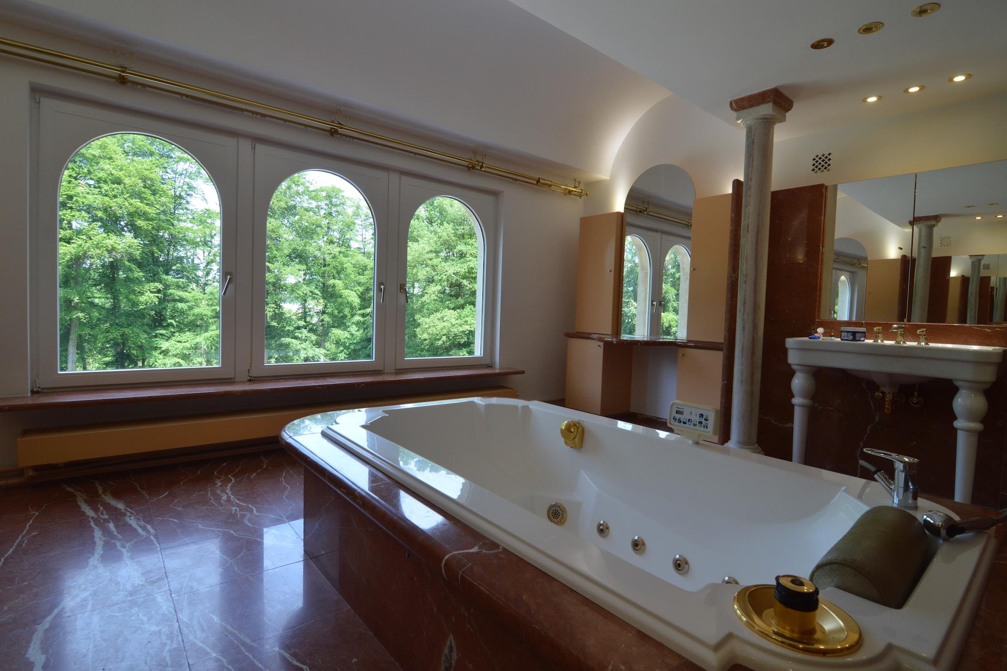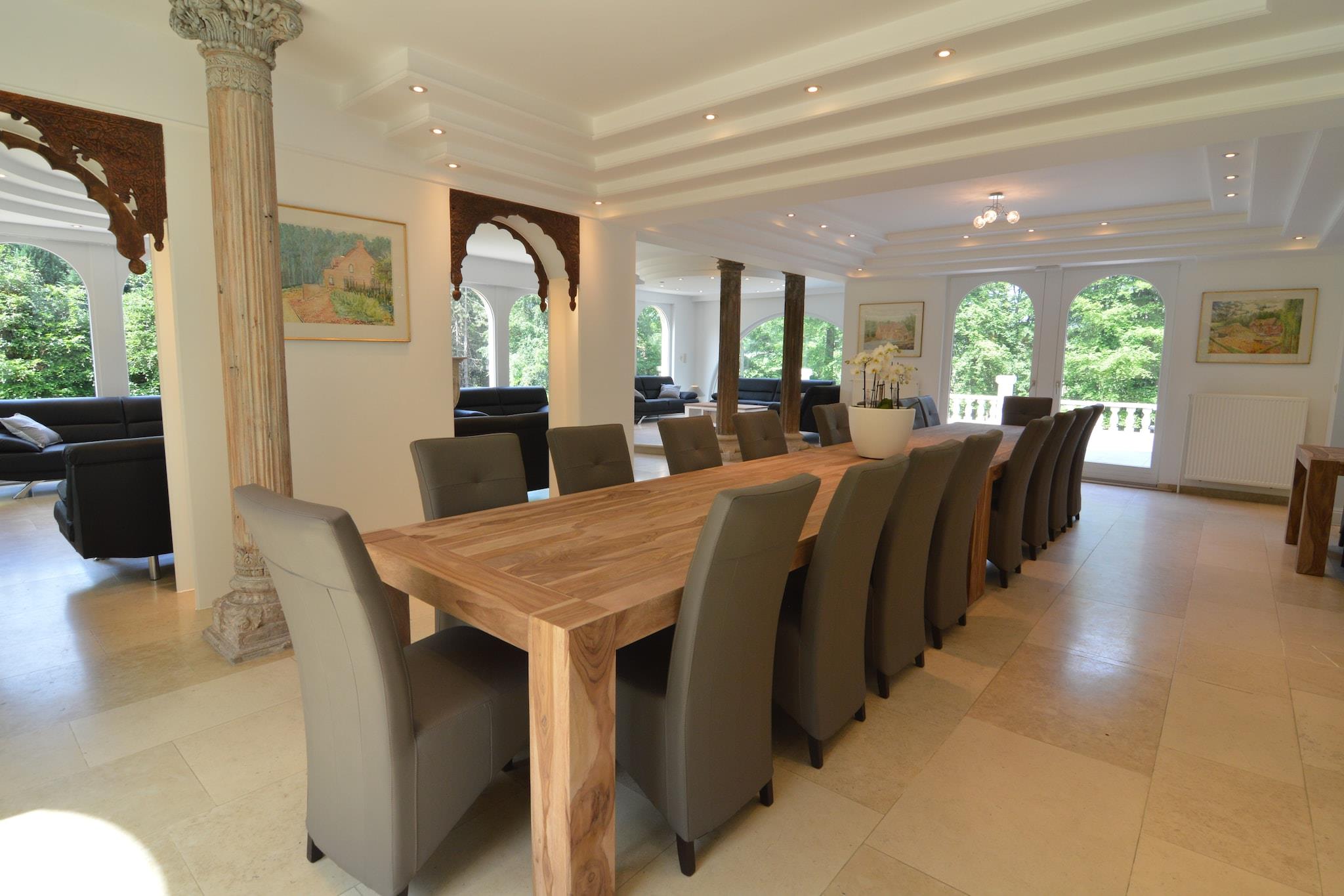 Ground floor: (hallway(toilet), Living room(TV(digital)), dining room, Kitchen(hob(ceramic), 3x coffee machine(filter), oven, combination microwave, dishwasher, fridge, fridge-freezer)) On the 1st floor: (bedroom(double bed(160 x 200 cm), bunk bed(90 x 200 cm), washbasin), bedroom(double bed(160 x 200 cm), double bed(160 x 200 cm)), bedroom(single bed(90 x 200 cm), double bed(160 x 200 cm), balcony), Bedroom with bathroom(double bed(160 x 200 cm), shower, washbasin), Bedroom with bathroom(double bed(180 x 200 cm), shower, washbasin), Bedroom with bathroom(double bed(160 x 200 cm), shower, washbasin), bathroom(bath tub, shower, 2x washbasin), toilet, toilet) On the 2nd floor: (Sitting room, bedroom(3x double bed(180 x 200 cm), washbasin), bedroom(double bed, washbasin)) Basement: (bathroom(shower, toilet), recreation room(table tennis table)) terrace, garden, garden furniture, BBQ, BBQ, parking, pond, pond, parasol