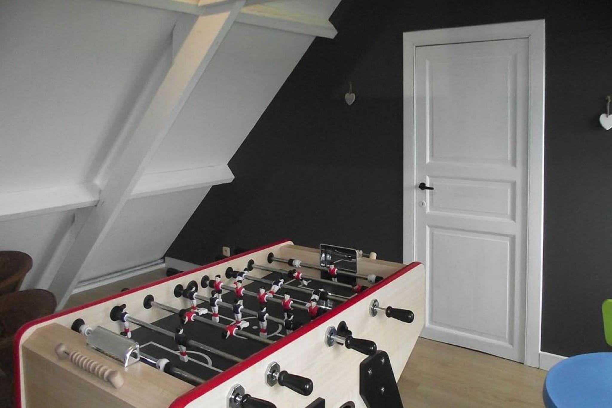 Ground floor: (Entrance, Sitting room(TV(flatscreen, digital), fireplace, stove(wood), seating area, DVD player), dining room(4x dining table(16 persons), 2x high chair), Kitchen(electric kettle, toaster, cooker(5 ring stoves, ceramic), hood, coffee machine, oven(grill-oven), microwave, dishwasher, fridge-freezer, Hand blender), bathroom(bath tub, shower, washbasin), sanitary facility(toilet), washing room(fridge)) On the 1st floor: (bedroom(double bed(twin duvet, twin fitted sheet)), Bedroom with bathroom(double bed(twin duvet, twin fitted sheet), cot, shower, washbasin), bathroom(shower, washbasin), sanitary facility(toilet), recreation room(TV, seating area, table football, toys)) On the 2nd floor: (bedroom(single bed(duvet, fitted sheet), double bed(twin duvet, twin fitted sheet)), Bedroom with bathroom(double bed(twin duvet, twin fitted sheet), cot, shower, washbasin), sanitary facility(toilet)) terrace, garden(private, fenced, landscaped garden), garden furniture, BBQ, parking, lounge set