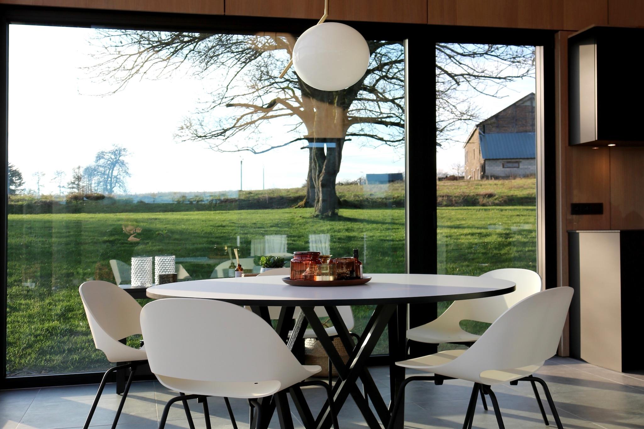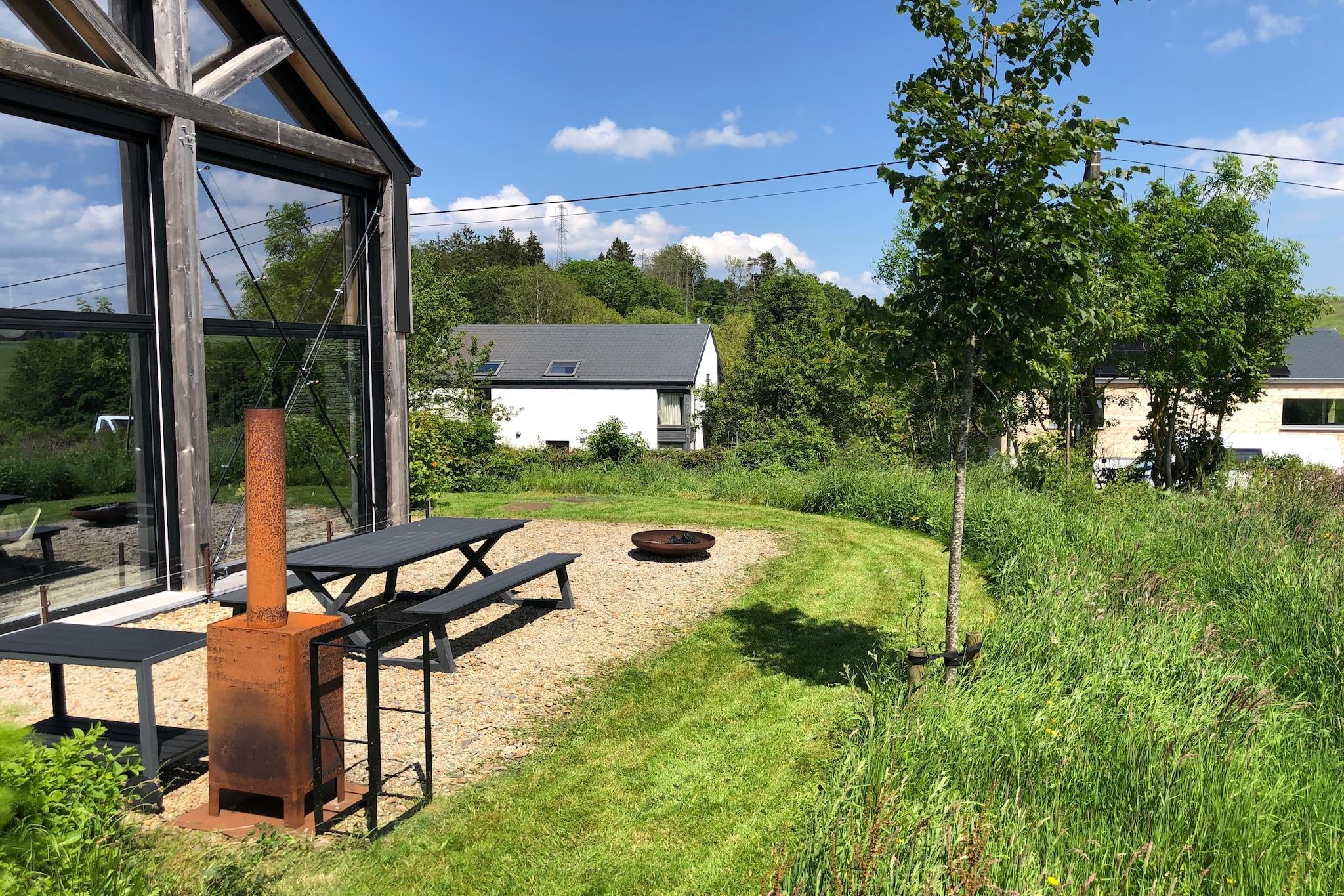 Modern design house with sauna near La Roche-en-Ardenne Welcome to Arduenna Silva, a modern and stylish design house for up to 4 guests, quietly located in the village of Warempage near La Roche-en-Ardenne. This architect-designed home combines contemporary comfort with beautiful views of the surrounding Ardennes landscape. Large windows and high-quality materials create a bright and peaceful atmosphere, making it ideal for families or couples looking to relax in nature. Inside you will find a cosy living area with seating corner, Smart TV, DVD player and a Bang & Olufsen Bluetooth sound system. The open kitchen is fully equipped with oven, microwave, dishwasher, Nespresso coffee machine and all cooking essentials. The house has two bedrooms: one bedroom with a double bed and a children's bedroom with bunk beds. The modern bathroom features a shower and washbasin, and in the hallway you can enjoy the infrared sauna. The mezzanine offers a playful reading and play area with toys, books and games, as well as a small workspace. Outside there are two terraces, including a sunny south-facing terrace with a large table, a covered terrace, a children’s playground and atmospheric lighting. A Weltevree barbecue and fire bowl are available for cosy evenings (wood to be provided by guests). The house is only a few minutes from the centre of La Roche-en-Ardenne, known for its charming restaurants, terraces and the impressive Feodaal Kasteel van La Roche-en-Ardenne overlooking the town. The region is perfect for hiking, cycling and kayaking on the Ourthe river. For spectacular views, the panorama at Le Hérou is highly recommended. Families will also enjoy visiting Parc à Gibier de La Roche-en-Ardenne wildlife park and the forest adventure park Parc Chlorophylle. In short, an ideal base to discover the Ardennes.