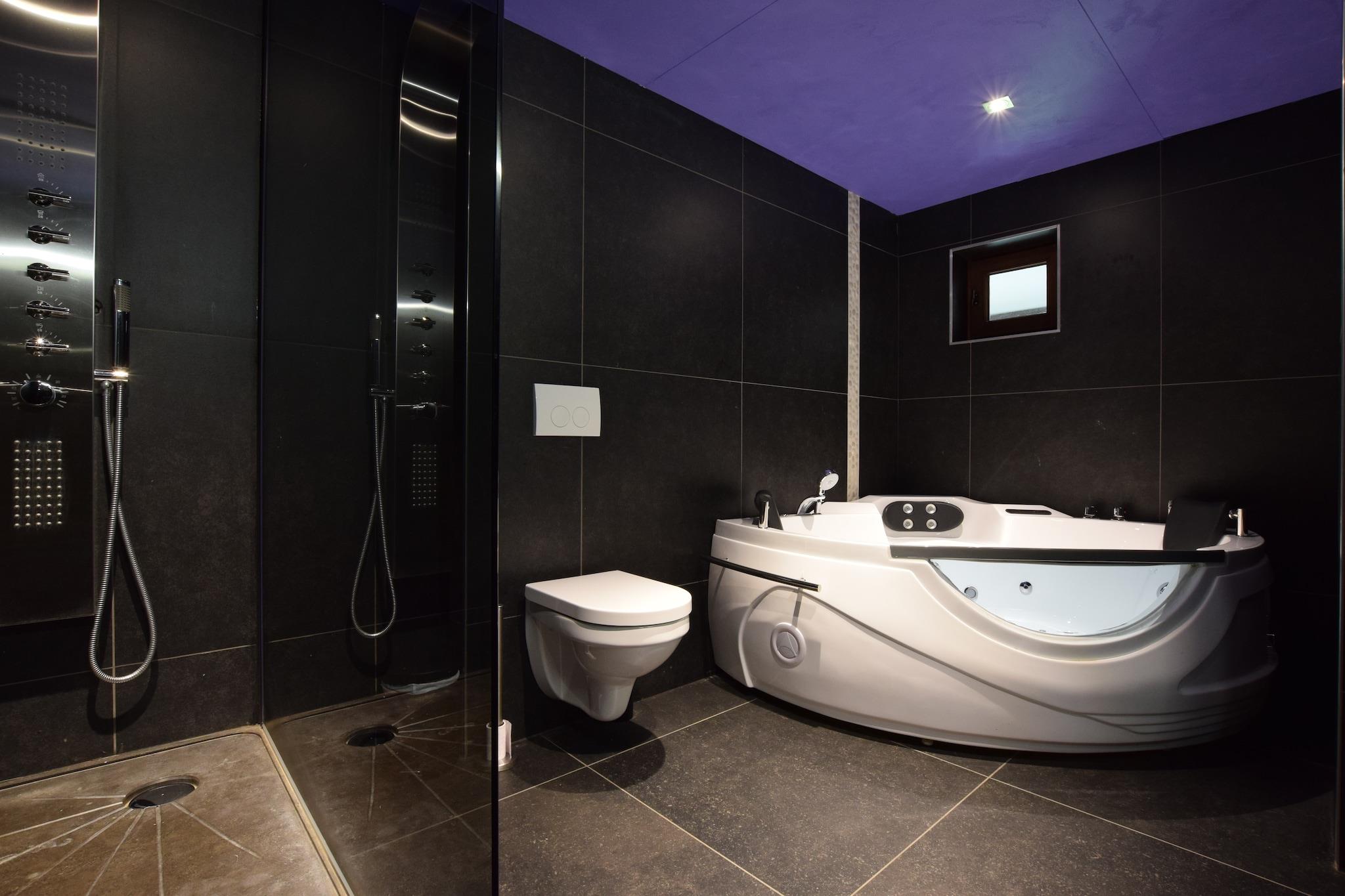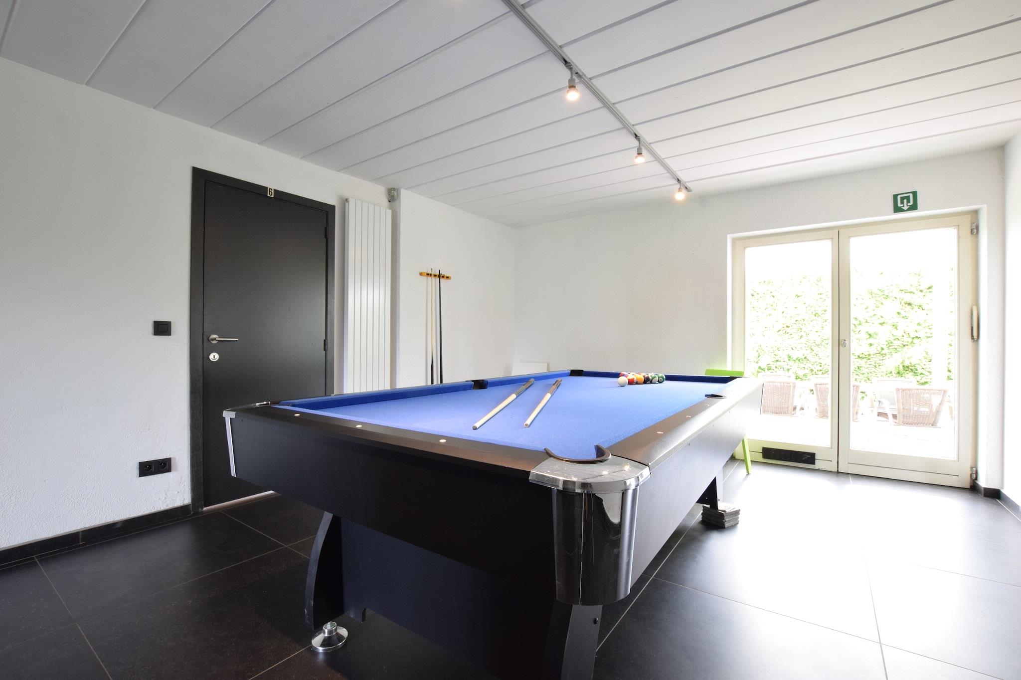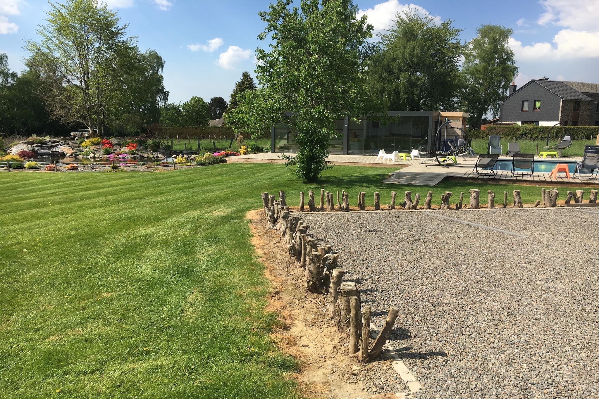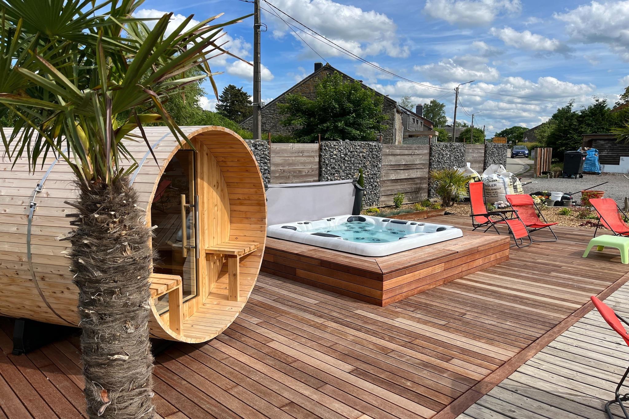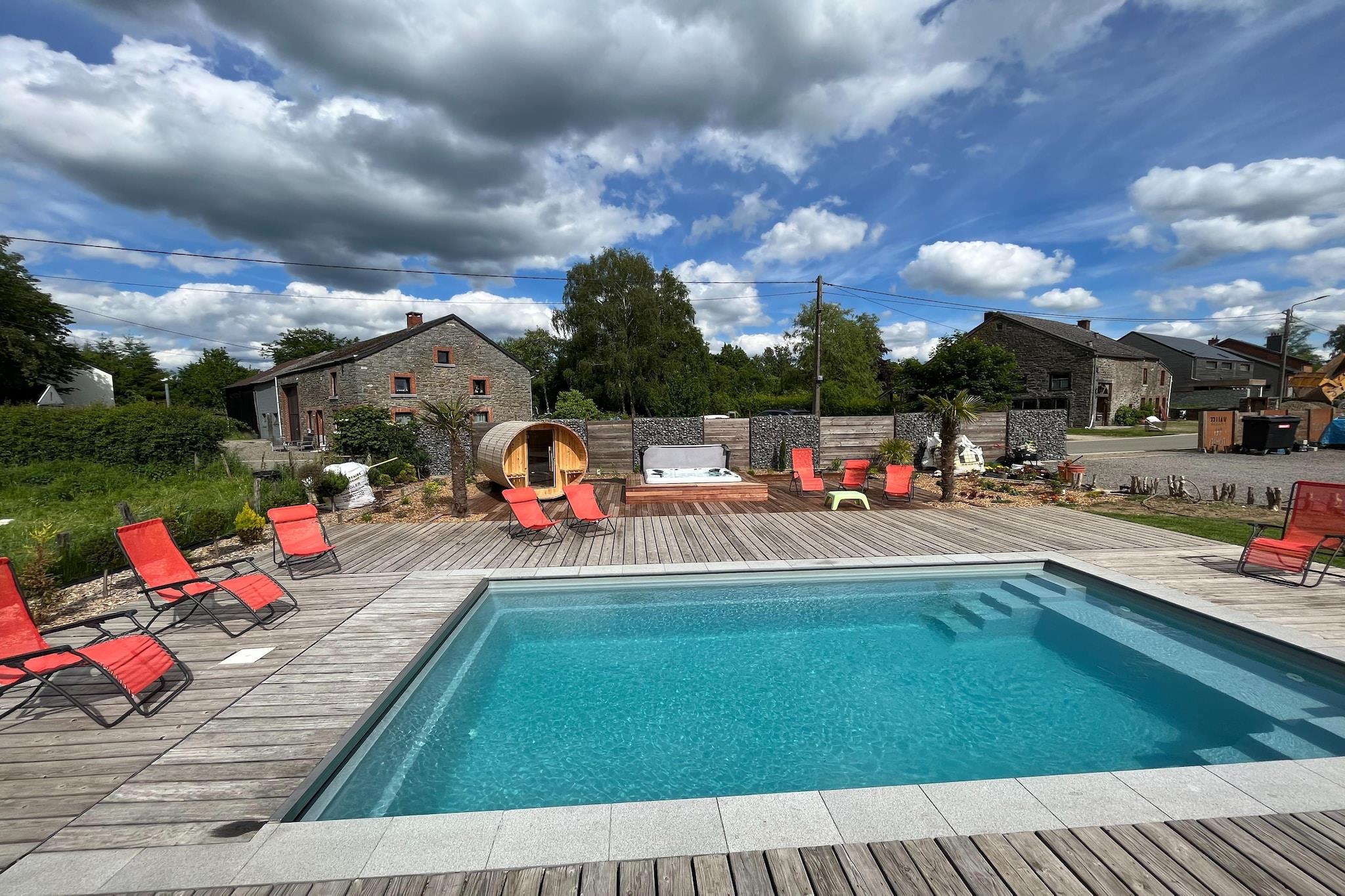 Located in the peaceful village of Hives near La Roche-en-Ardenne, this spacious villa is perfect for large families or groups seeking comfort and nature. Just 3 km from the town center and surrounded by forest, it offers easy access to top attractions like the Château Féodal, the Battle of the Ardennes Museum, and the scenic Barrage de Nisramont for kayaking and hiking. The Parc à Gibier and Maboge Beach also provide fun for all ages. The villa features seven bedrooms, many with en-suite bathrooms and balconies, including rooms with hot tubs and bunk beds for children. The large kitchen is equipped with dual cookers, ovens, dishwashers, and fridge-freezers, while the living/dining area includes a wood stove, digital TV, and entertainment system. Guests can enjoy a private heated pool (Apr–Sep), sauna, bubble bath, billiards, boules court, and a roofed terrace with barbecue. A partially fenced garden and pond add to the charm. Nearby dining options include Chez Henri for traditional Ardennes cuisine, Signé Jeanne for generous Belgian dishes, and Restaurant L’Apéro, known for its cozy ambiance and seasonal flavors.