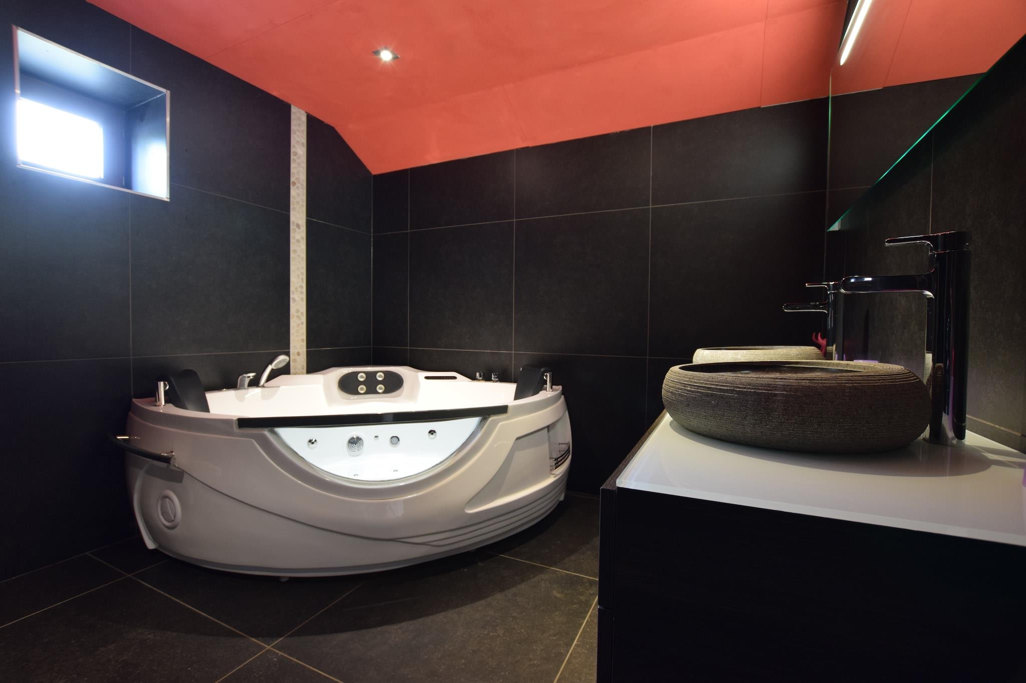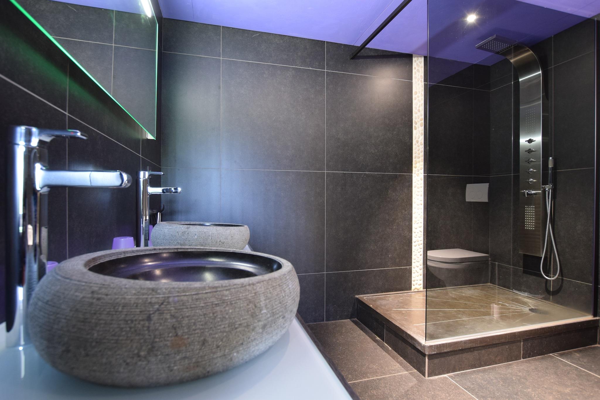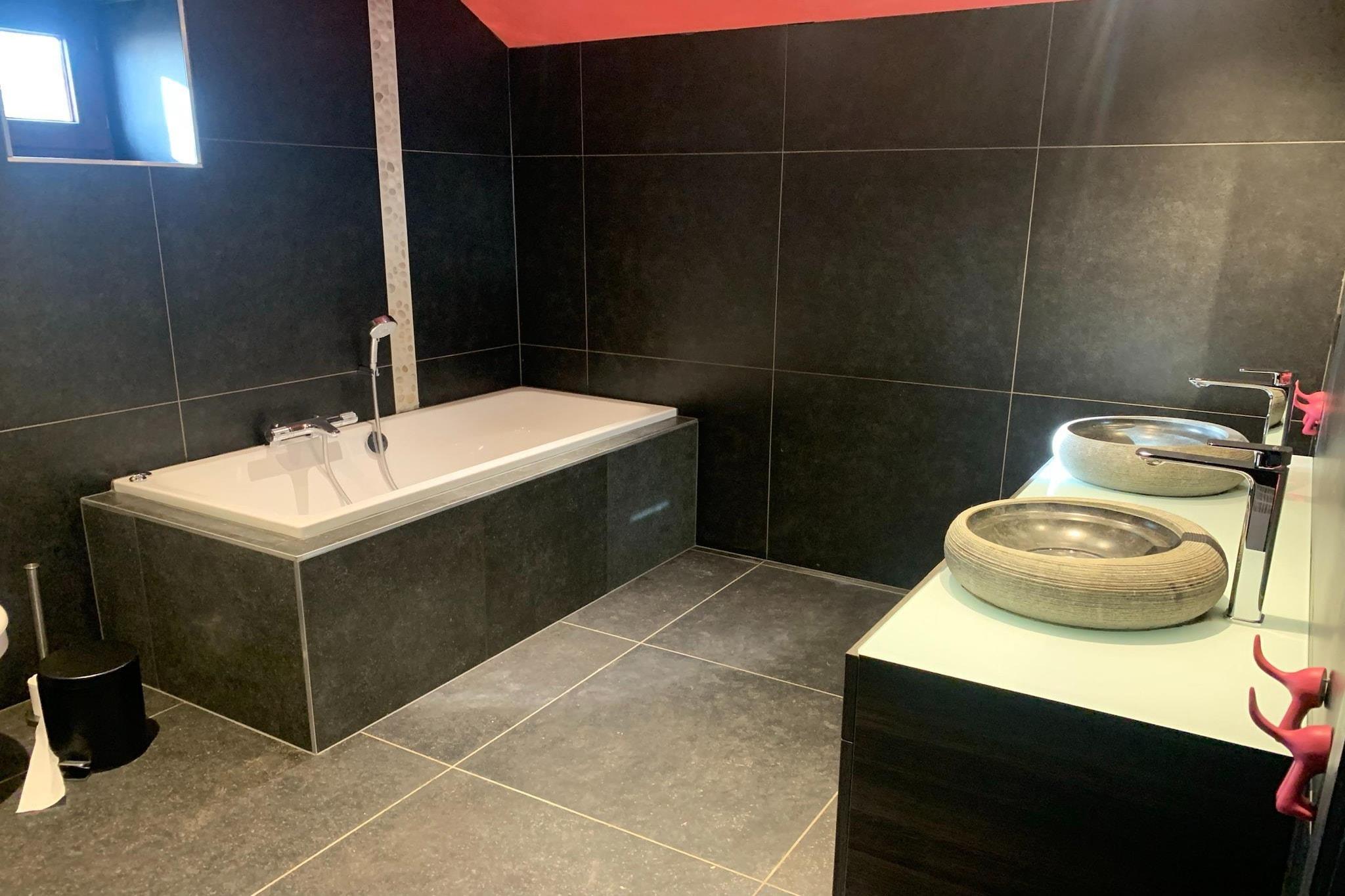 Ground floor: (Kitchen(electric kettle, 2x cooker(8 ring stoves, ceramic, gas), coffee machine(filter), 2x oven, microwave, 2x dishwasher, 2x fridge-freezer), Living/diningroom(TV(digital), stove(wood), DVD player, radio, CD player, 2x high chair), bedroom(bunk bed), Bedroom with bathroom(double bed(180 x 210 cm), hot tub, hot tub, shower, 2x washbasin, toilet), Bedroom with bathroom(double bed, shower, washbasin, toilet)) On the 1st floor: (Bedroom with bathroom(reachable from the outside)(2x single bed, double bed(180 x 210 cm), shower, 2x washbasin, toilet, balcony), Bedroom with bathroom(reachable from the outside)(2x single bed(90 x 210 cm), double bed(180 x 210 cm), hot tub, shower, 2x washbasin, toilet, balcony), Bedroom with bathroom(reachable from the outside)(2x single bed(90 x 210 cm), double bed(180 x 210 cm), shower, 2x washbasin, toilet, balcony), Bedroom with bathroom(reachable from the outside)(2x single bed(90 x 210 cm), bunk bed, shower, 2x washbasin, toilet, balcony), 2x children's bed) fireplace, Bubble bath(private, paid), sauna(private, paid), heating(central), terrace(roofed), garden(partially fenced), BBQ, parking, pond, swimming pool(private, heated, 9 x 4 m., opened from Apr upto and including Sep), boules court, billiards