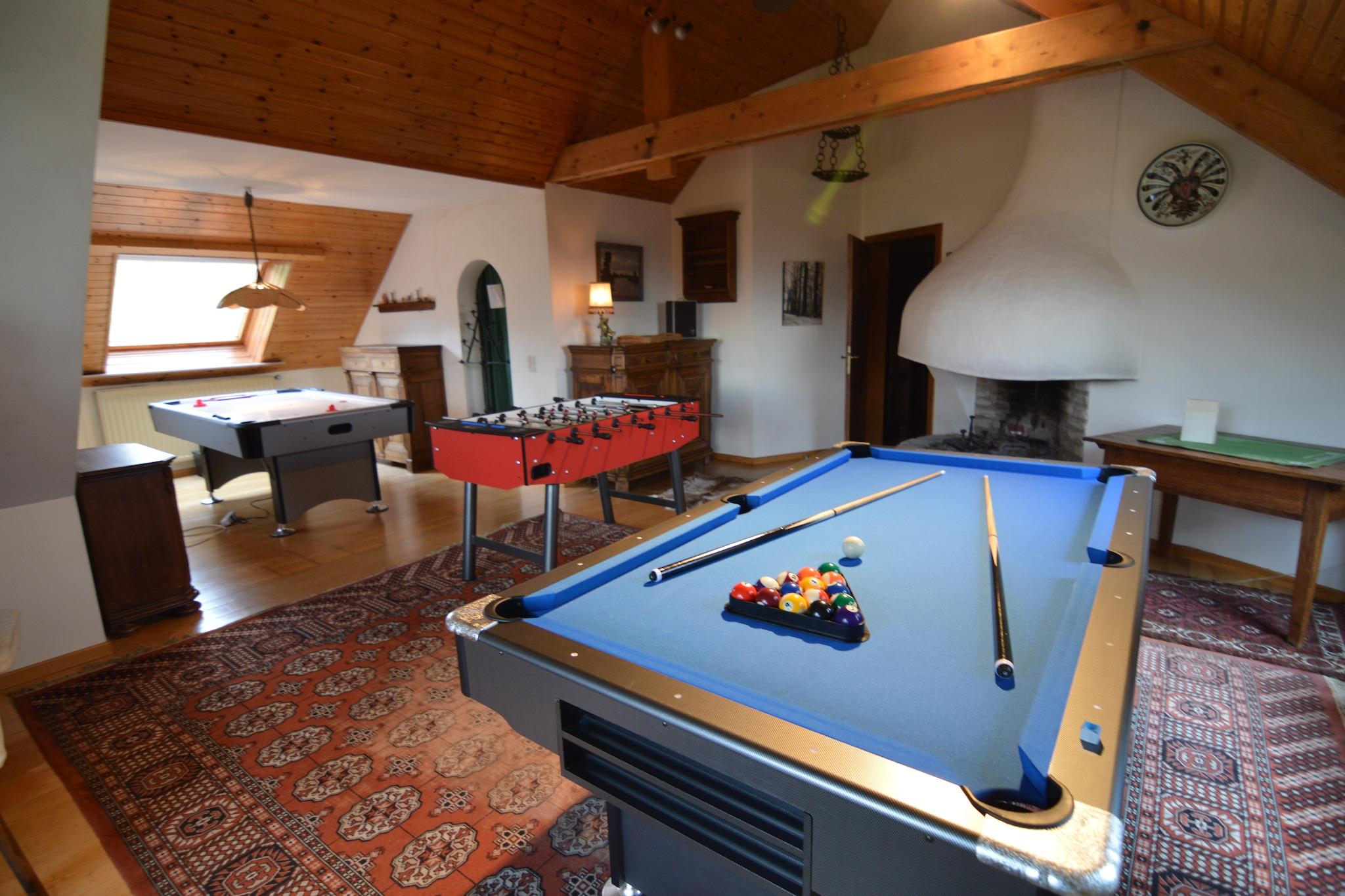 Ground floor: (Living room(TV, DVD player), Living room(fireplace, radio, CD player), dining room, Kitchen(cooker(ceramic), oven, microwave, dishwasher, fridge-freezer), bedroom(double bed(180 x 200 cm)), bathroom(bath tub, shower, 2x washbasin, toilet), toilet, pantry(microwave, fridge-freezer, tumble dryer)) On the 1st floor: (bedroom(double bed(180 x 200 cm)), bedroom(2x single bed), bedroom(2x single bed(90 x 200 cm)), bedroom(single bed(90 x 200 cm)), bathroom(shower, 2x washbasin), bathroom(shower, washbasin), bathroom(bath tub, 2x washbasin, toilet), toilet, recreation room(table football, billiards)) fireplace, coffee machine, tumble dryer, bathtub or shower, washing machine, heating, terrace, garden, garden furniture, sun loungers, BBQ, parking, pond, parasol, table tennis table, air hockey, children's bed, high chair