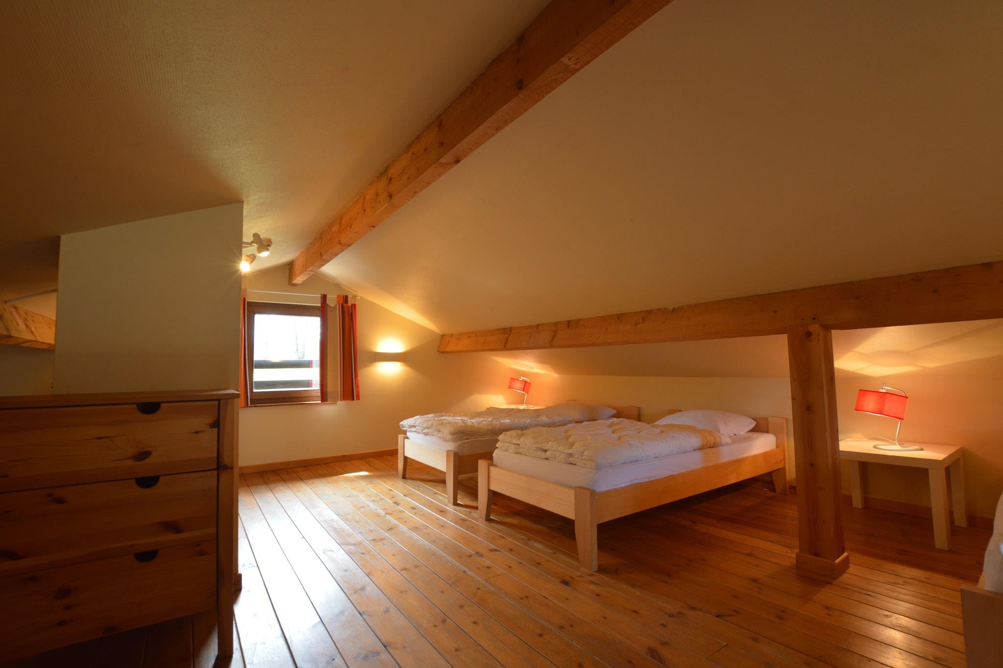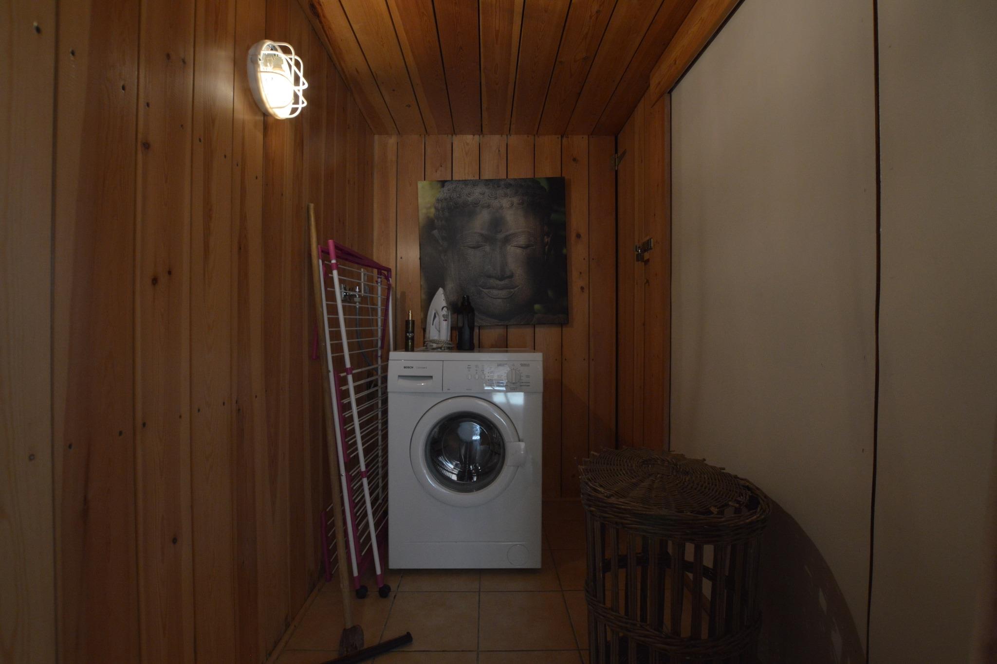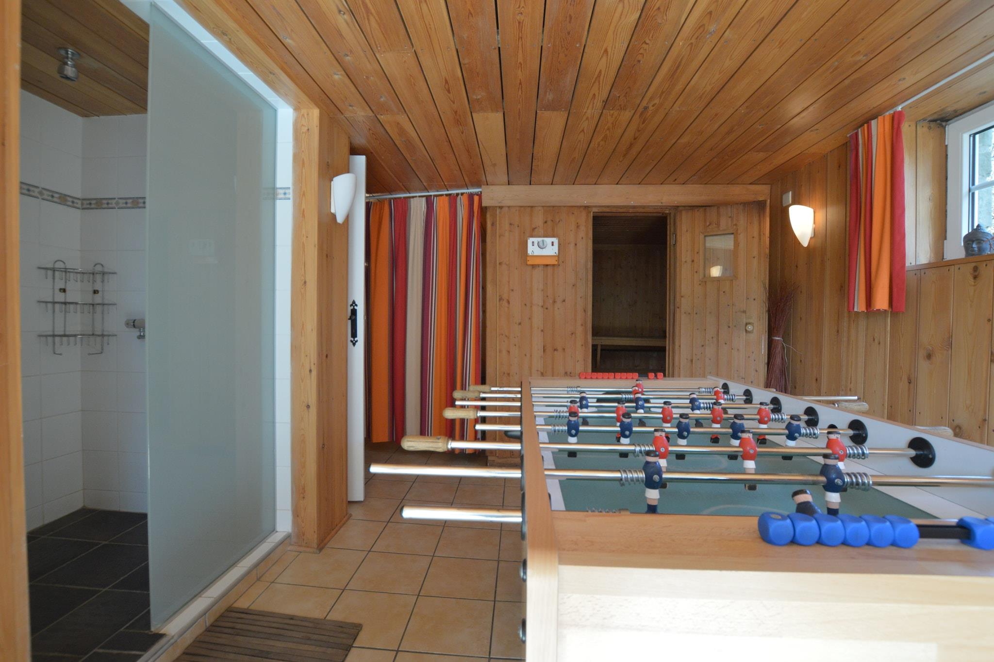 Ground floor: (bedroom(2x single bed(90 x 200 cm), washbasin), bedroom(2x single bed(90 x 200 cm), washbasin), bathroom(shower), toilet, playroom(table tennis table), relaxation area(shower, sauna, fitness equipment)) On the 1st floor: (Kitchen(hob(ceramic), coffee machine(filter), oven, microwave, dishwasher, fridge, freezer, high chair), Living/diningroom(TV, dining table(12 persons), fireplace, DVD player, stereo unit, terrace(16 m2)), bedroom(2x single bed(90 x 200 cm), children's bed), bedroom(2x single bed(90 x 200 cm), washbasin, children's bed), bathroom(bathtub or shower, 2x washbasin, toilet), terrace) On the 2nd floor: (bedroom(4x single bed, TV)) heating(central), garden, garden furniture, BBQ, parking, parasol, table football