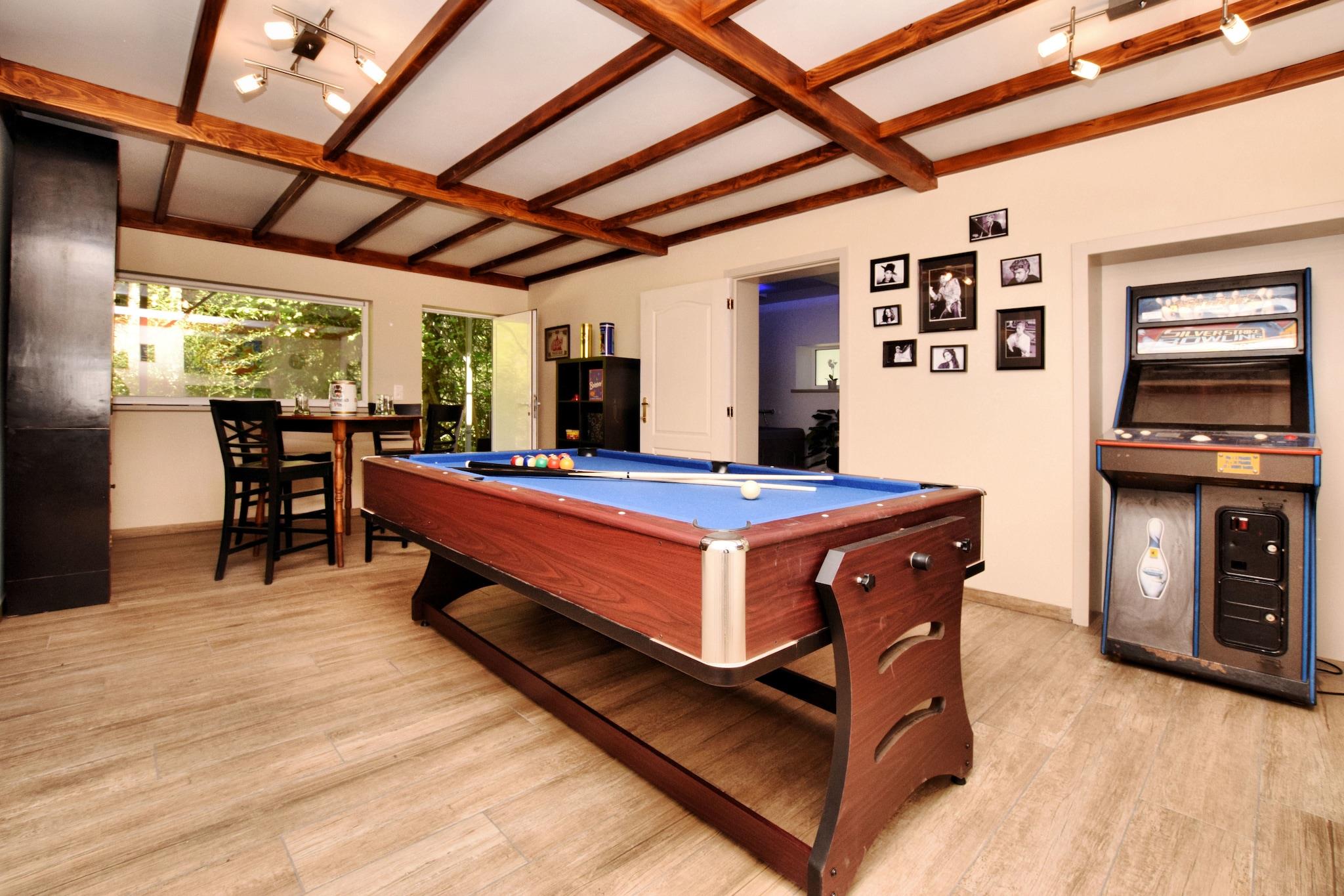 This cozy villa in Masbourg, Belgium offers a relaxing stay in the heart of the Ardennes, ideal for families or groups. Located just 500 meters from the village center and surrounded by forest and river landscapes, it’s perfect for nature walks and cycling. Nearby attractions include the Grottes de Han, the Château de Lavaux-Sainte-Anne, and the Euro Space Center, each offering a mix of adventure, history, and science. The Wallonia Rural Life Museum and Fourneau Saint-Michel are also worth visiting for cultural insights. The home features four bedrooms across two floors, including a bunk bed and children’s bed for younger guests. The open kitchen is fully equipped with modern appliances, and the living/dining room includes a wood stove, flat-screen TV with international channels, and a DVD player. The basement houses a recreation room with air hockey, billiards, and a game console, plus a wellness area with a bubble bath and sauna. Outdoors, enjoy a patio, garden, barbecue, and games like table tennis and boules. Dining options nearby include Le Jardin des Senteurs in Nassogne for modern cuisine, Restaurant Les 7 Fontaines D'Awenne for regional flavors, and Brasserie Saint-Monon for local craft beers.