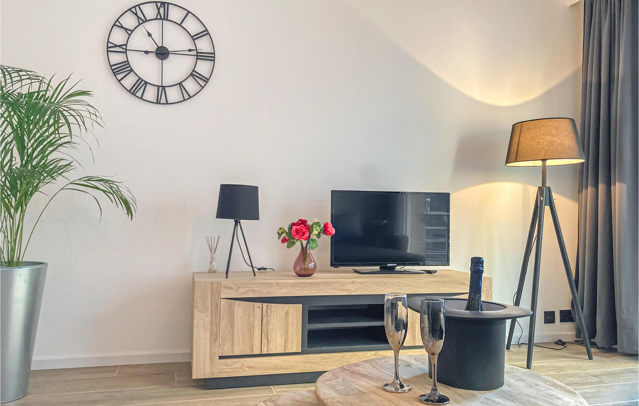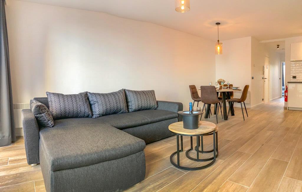 Diese Ferienwohnung überzeugt durch die komfortable Einrichtung in einem modernen und ansprechenden Stil. Durch die bodentiefen Fenster fällt viel Licht in das gemütliche Wohnzimmer - hier können Sie nach einem langen Urlaubstag mit vielen Aktivitäten in stilvollem Rahmen herrlich entspannen. Machen Sie es sich gemeinsam auf dem großzügigen Sofa gemütlich und genießen Sie die gemeinsame Zeit.