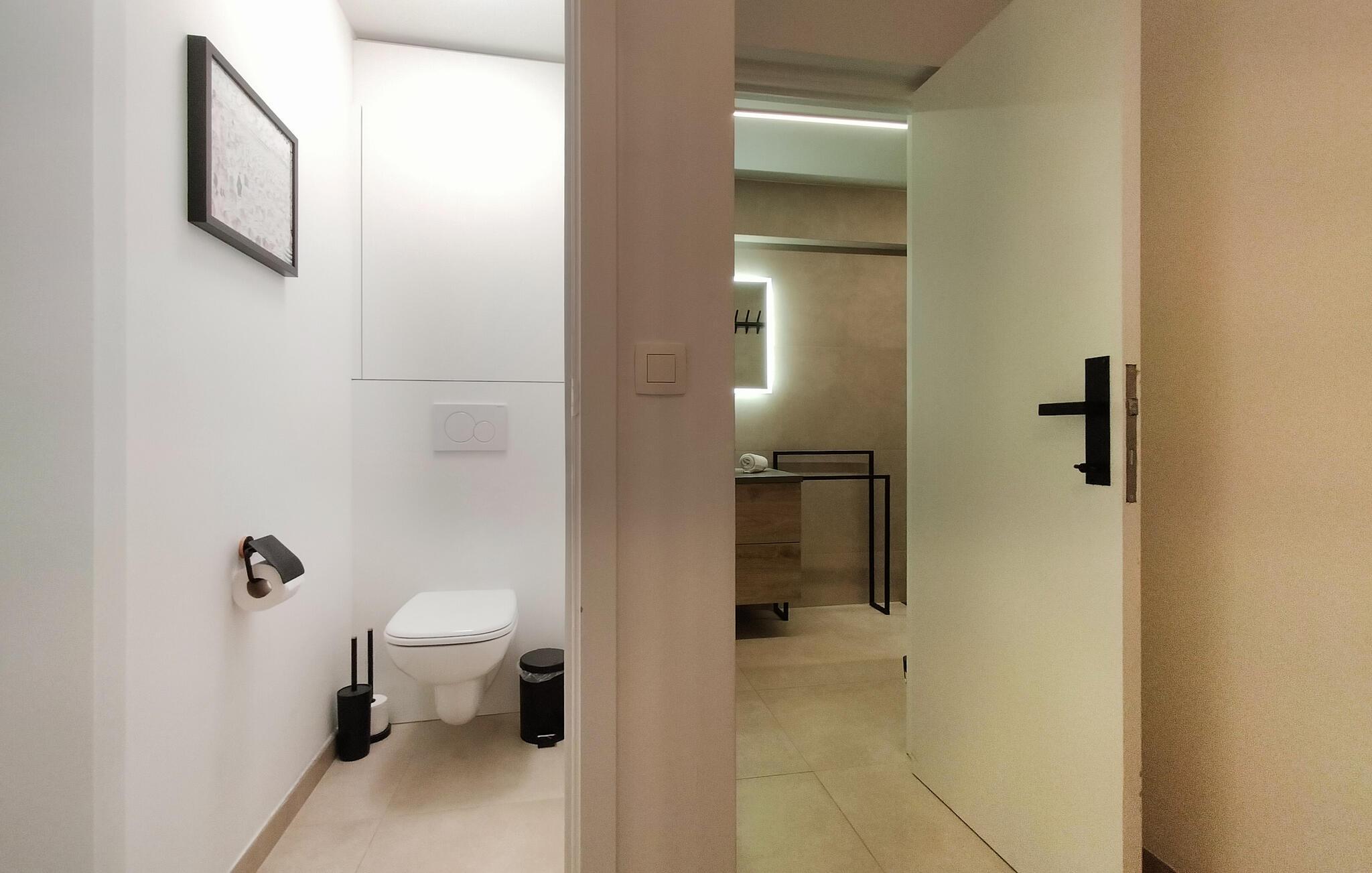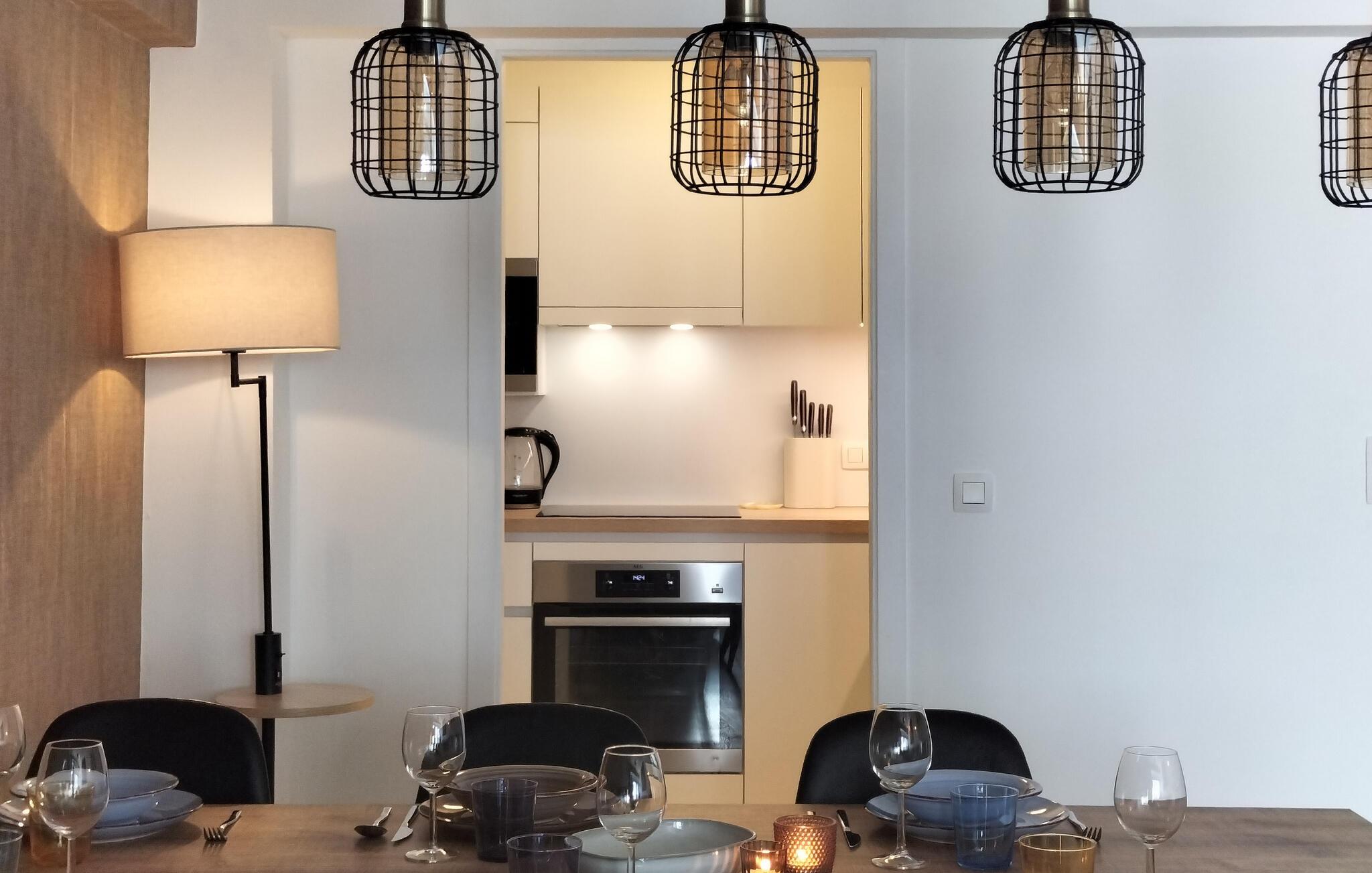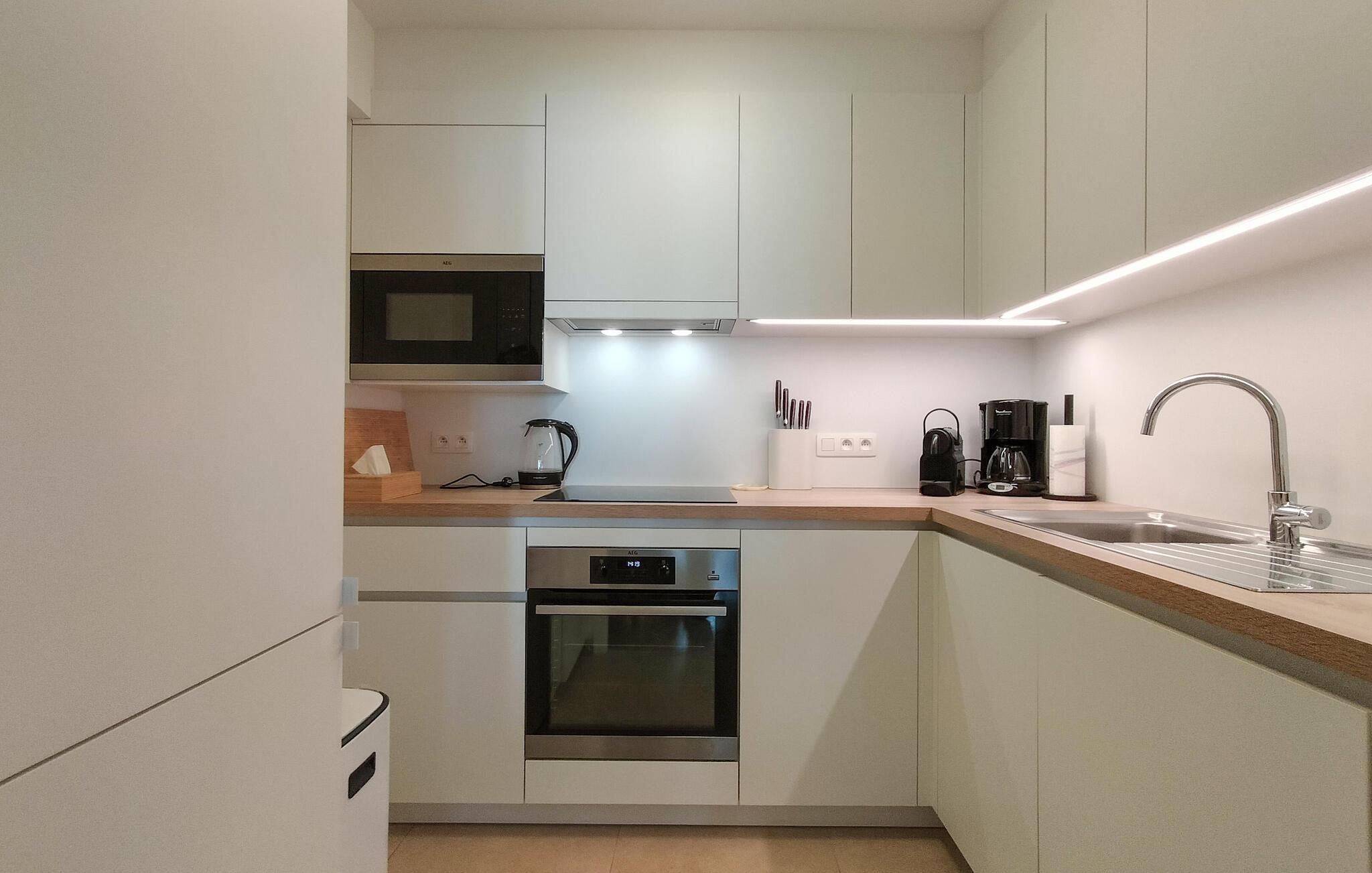 Entspannen Sie im offenen Wohnbereich mit gemütlichem Sofa, Sessel und Fernseher. Die hochwertige Ausstattung mit geschmackvollen Holzmöbeln, dekorativen Leuchten und farblich abgestimmten Akzenten schafft ein stilvolles Ambiente. Bereiten Sie Ihre Mahlzeiten in der praktischen Küche zu und genießen Sie diese am schönen Esstisch unter stimmungsvollem Licht. Nehmen Sie sich Zeit für Gespräche, Filme oder ein gutes Buch. Die Wohnung bietet Raum für ruhige Momente und gesellige Stunden. Nutzen Sie die Fensterbank als Aussichtspunkt auf das urbane und maritime Treiben.