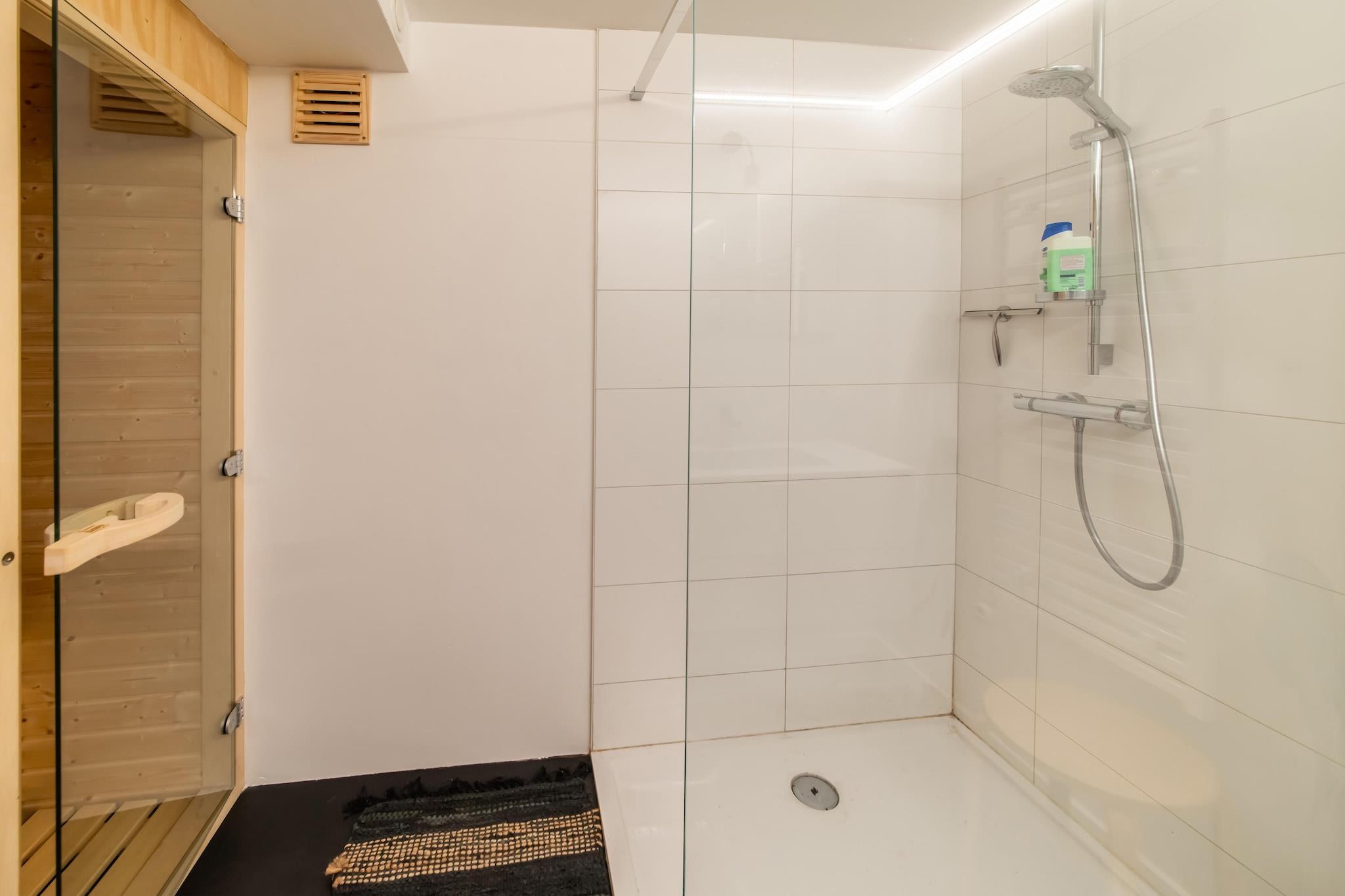 Ground floor: (Living room(TV, fireplace, seating area), Large kitchen(dining table, electric kettle, cooker, coffee machine, oven, microwave, dishwasher, fridge-freezer), bedroom(single bed, double bed), bedroom(double bed), bedroom(single bed, single bed), bedroom(single bed, single bed), bathroom(bath tub, washbasin, toilet)) Basement: (bathroom(shower), playroom, sauna) recreation room, bathtub or shower, sauna, washing machine, terrace, garden, garden, bicycle storage, garden furniture, BBQ, parking, party games