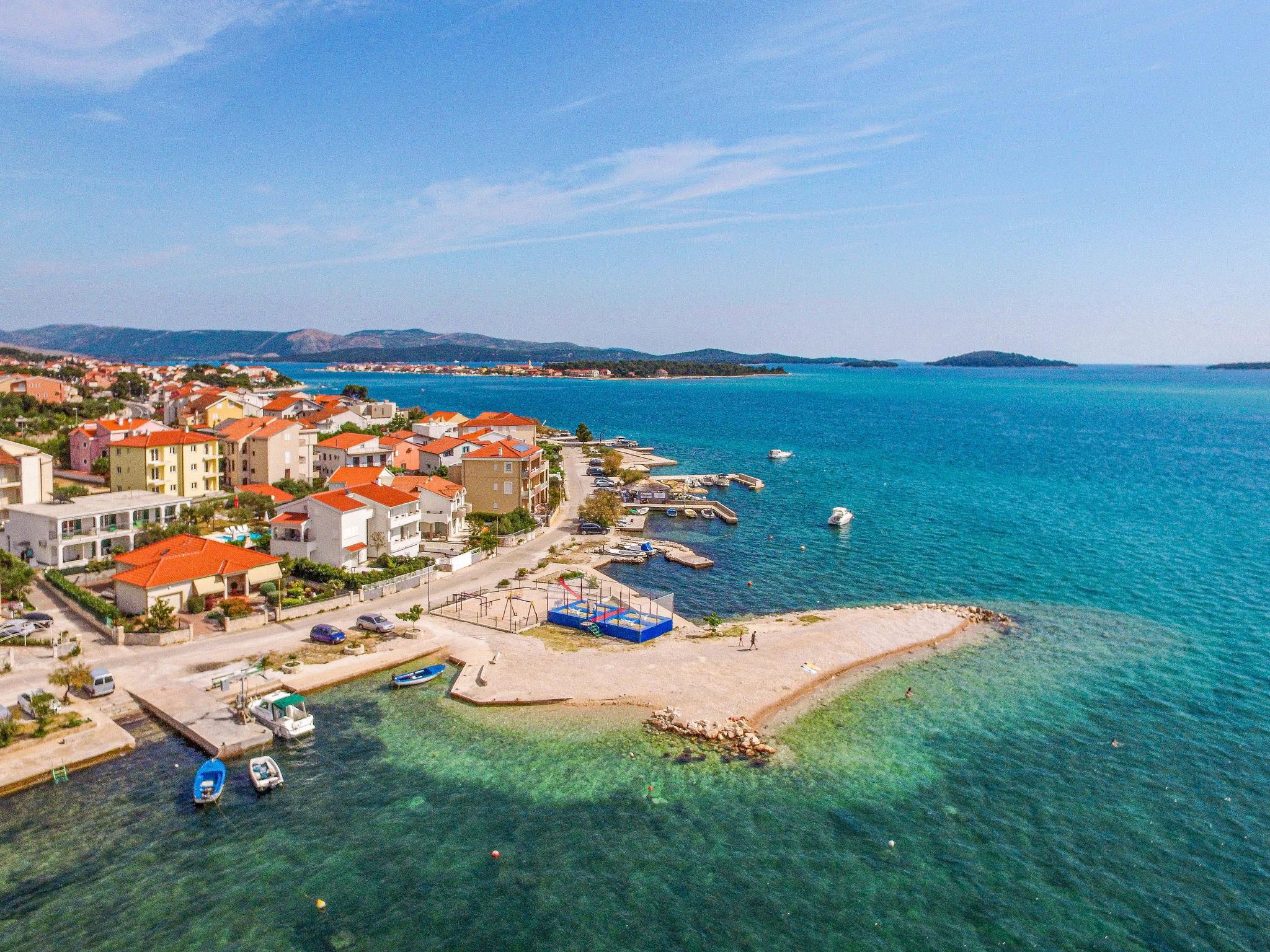 Apartment house "Katarina". 300 m from the centre of Brodarica, 7 km from the centre of Šibenik, 80 m from the sea, 80 m from the beach. For shared use: property 1'000 m2 (fenced), trees, swimming pool (8 x 5 m, depth 140 cm, seasonal availability: 02.Apr. - 05.Nov.) with internal staircase. Outdoor shower, barbecue. In the house: internet access. Parking on the premises. Shop 400 m, supermarket 7 km, bus stop 70 m, pebble beach 80 m.