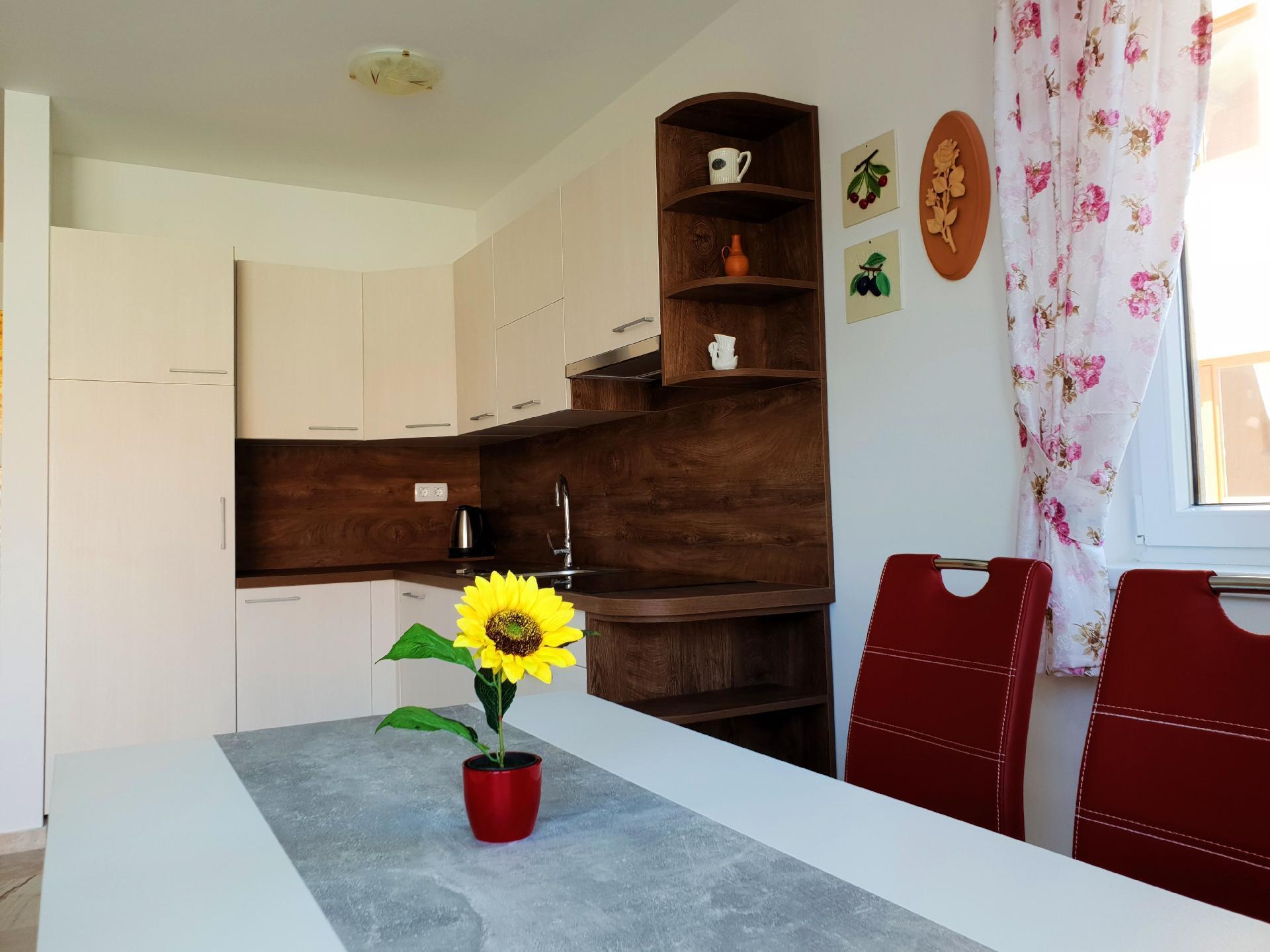 This charming flat is located on several floors: ground floor and 1st floor. On the 1st floor there are two bedrooms with double beds and sea views. The ground floor has a 15 m2 covered terrace with dining table and sea view. The kitchen is equipped with a ceramic hob, microwave, fridge with freezer compartment, dishwasher, coffee machine and kettle, as well as a dining table. The living room has air conditioning, satellite TV, a cosy sofa and access to the terrace. The flat has a bathroom with shower, toilet and hairdryer, as well as a separate bathroom with toilet. Guests have free Wi-Fi, private parking, a gas barbecue and access to a children's playground in the communal courtyard. The house is just 160 metres from the concrete and pebble beach and also offers underfloor cooling and heating for year-round comfort.