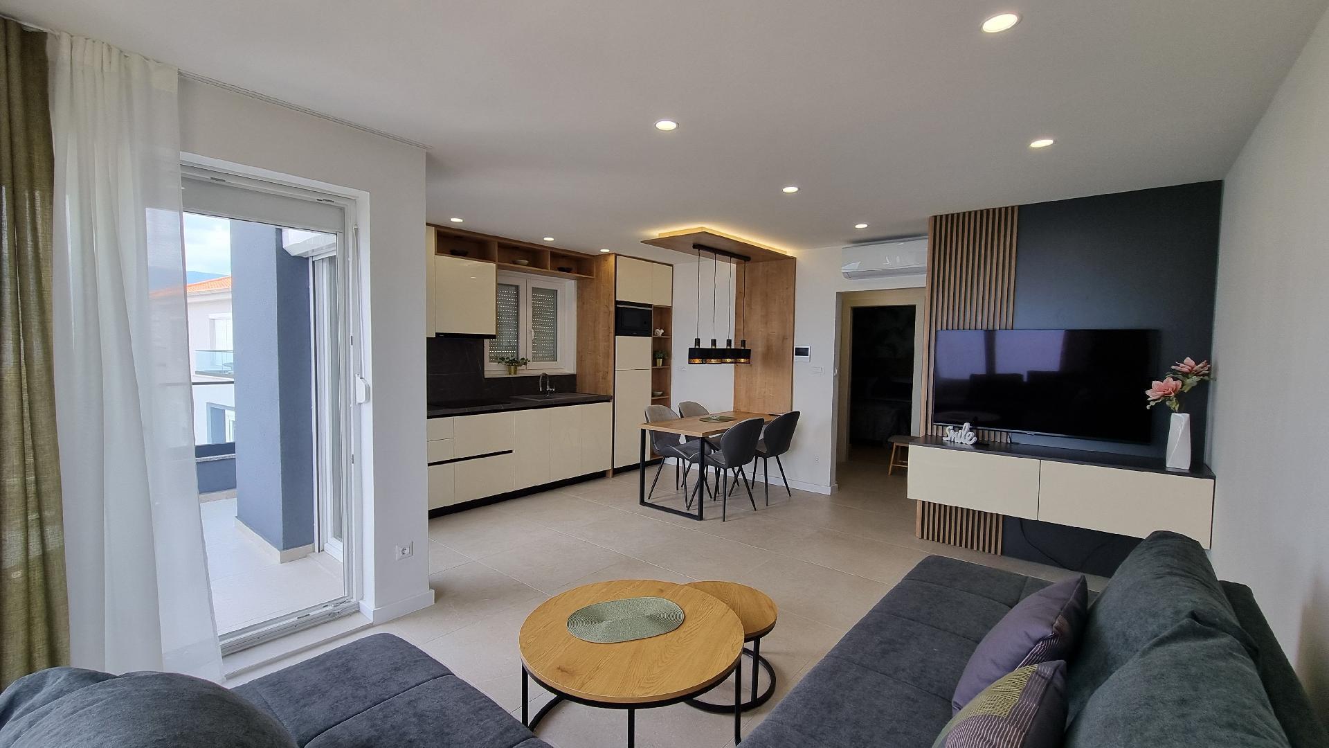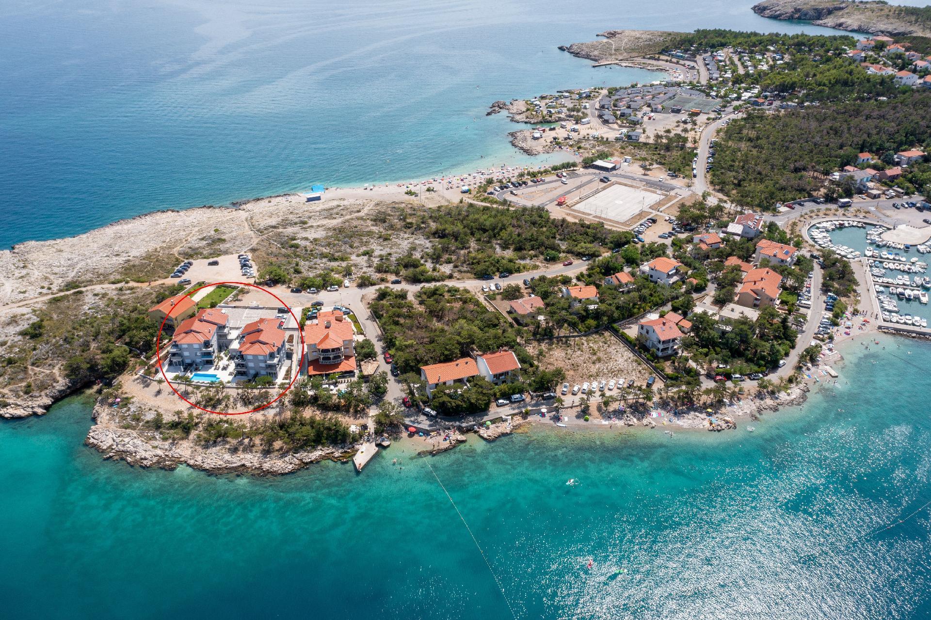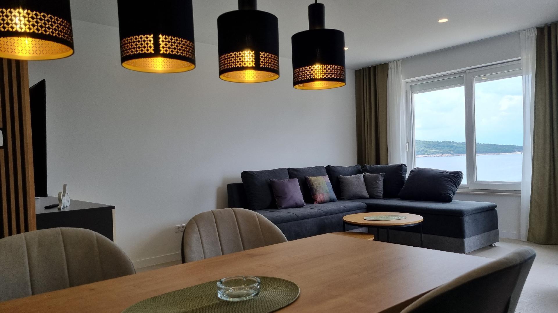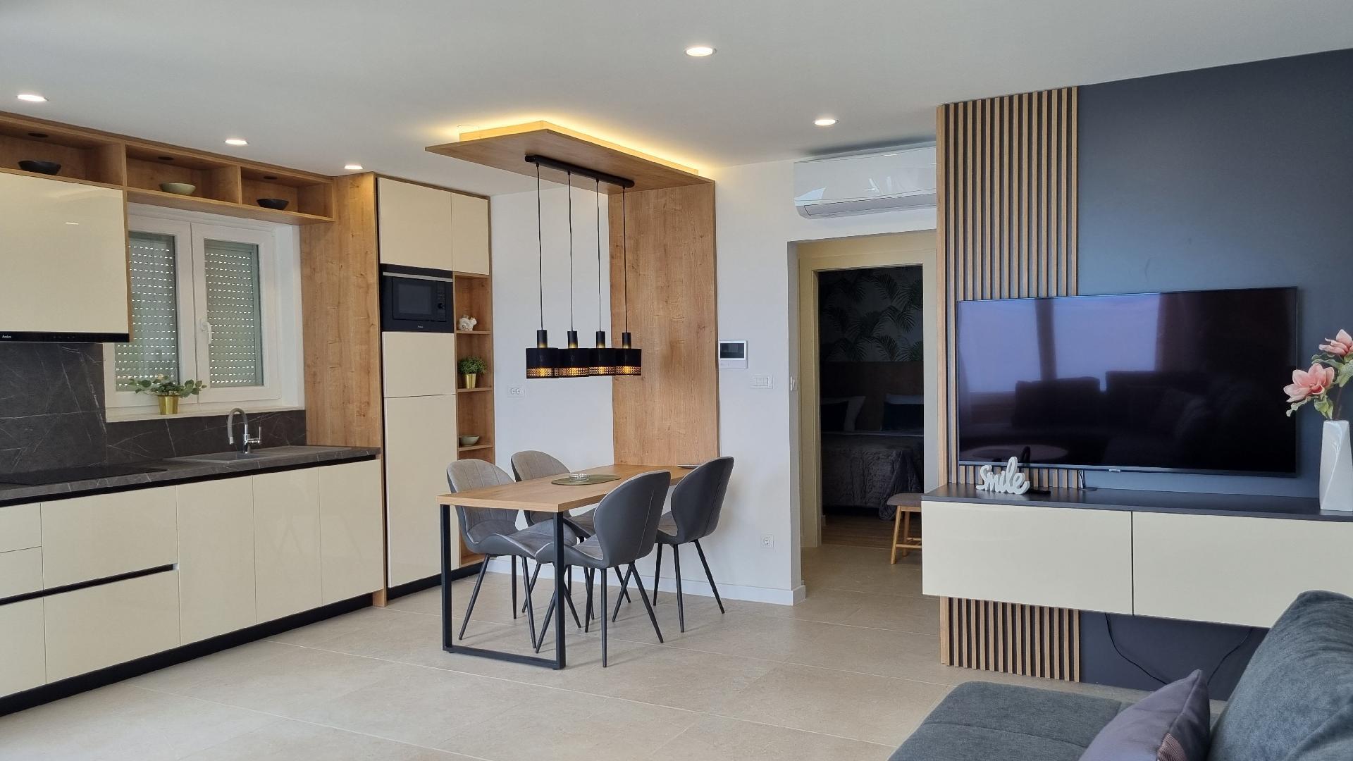 This luxurious and modern flat is located in a quiet apartment complex just 30 metres from the sea, surrounded by nature, many bays, pebble beaches and hiking trails. It offers a communal saltwater pool (36 m2), which is open from May to October and whose temperatures usually reach 20-26 °C. The flat is located on the 2nd floor and has a bedroom with a double bed, a modern kitchen with induction hob, fridge-freezer, kettle, coffee machine, toaster, microwave and dishwasher. The bathroom has a shower and toilet. The dining area and living room offer a cosy space with a sofa and smart TV, while free WiFi is available throughout the building.