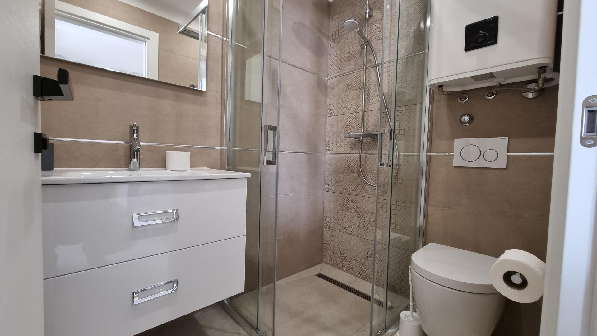 This luxurious, modern studio flat right by the sea is located in a quiet apartment complex just 30 metres from the sea, surrounded by nature, secluded bays, pebble beaches and hiking trails. It offers a shared saltwater pool (36 m2), which is open from May to October and where the temperature is usually between 20 and 26 °C. The studio flat is located on the ground floor and has a queen-size bed, a Smart TV, a well-equipped kitchen/dining and sitting area with induction hob, fridge and freezer, kettle, coffee machine, toaster, microwave and dishwasher. The bathroom has a shower and toilet. Free WiFi is available throughout the building.