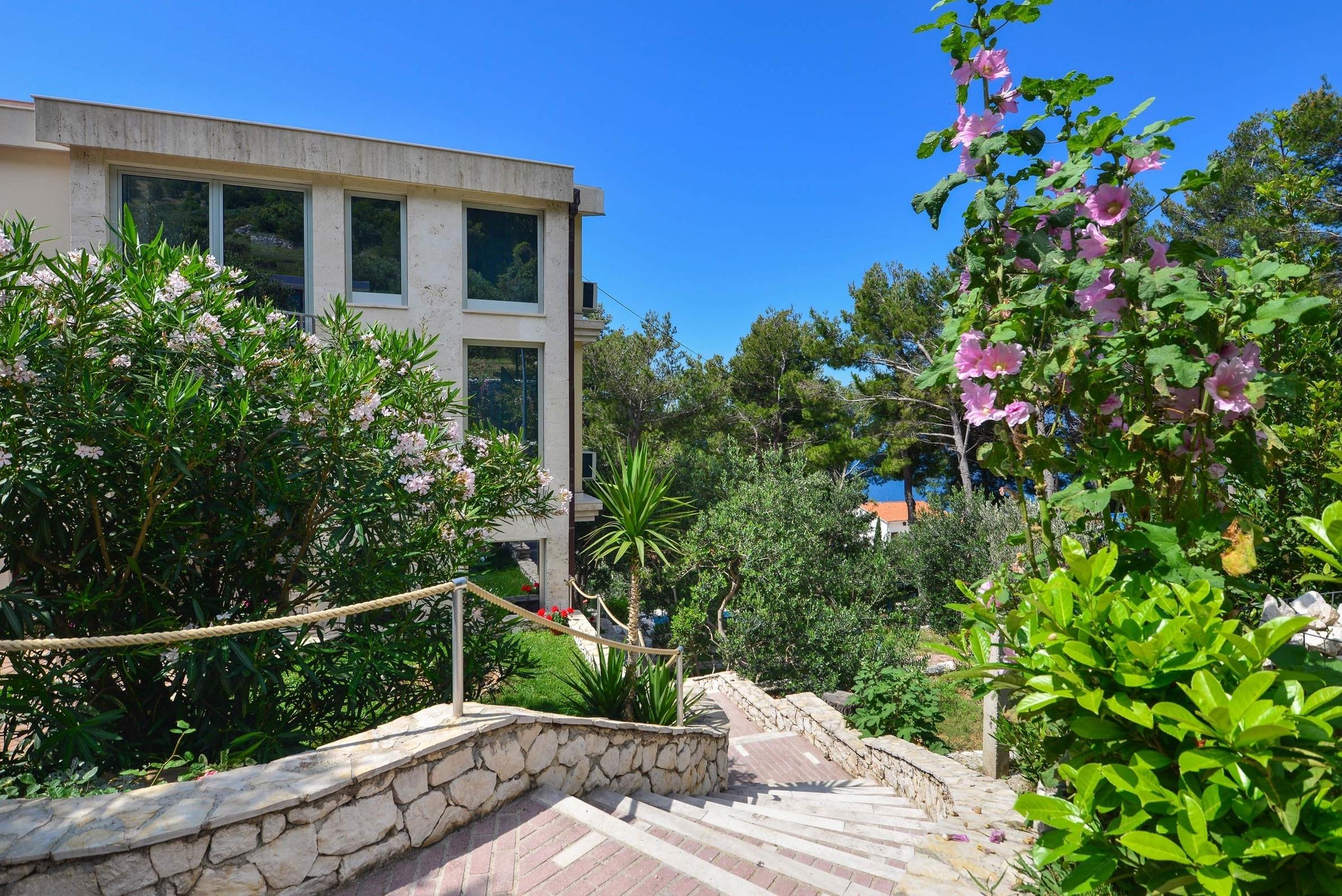 Meerblick zwischen Pinien - das komfortable Haus liegt direkt oberhalb des bekannten Badeortes Baska Voda. 3.000 qm Grundstück garantieren trotz Stadtnähe Ruhe und Erholung - sowie einen malerischen Blick auf die kroatische Adria.