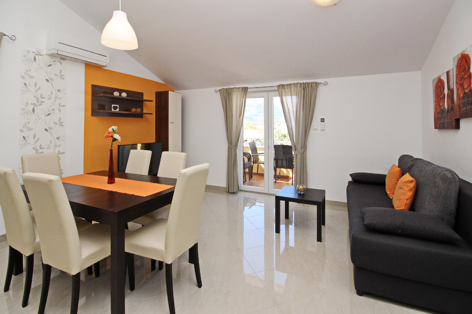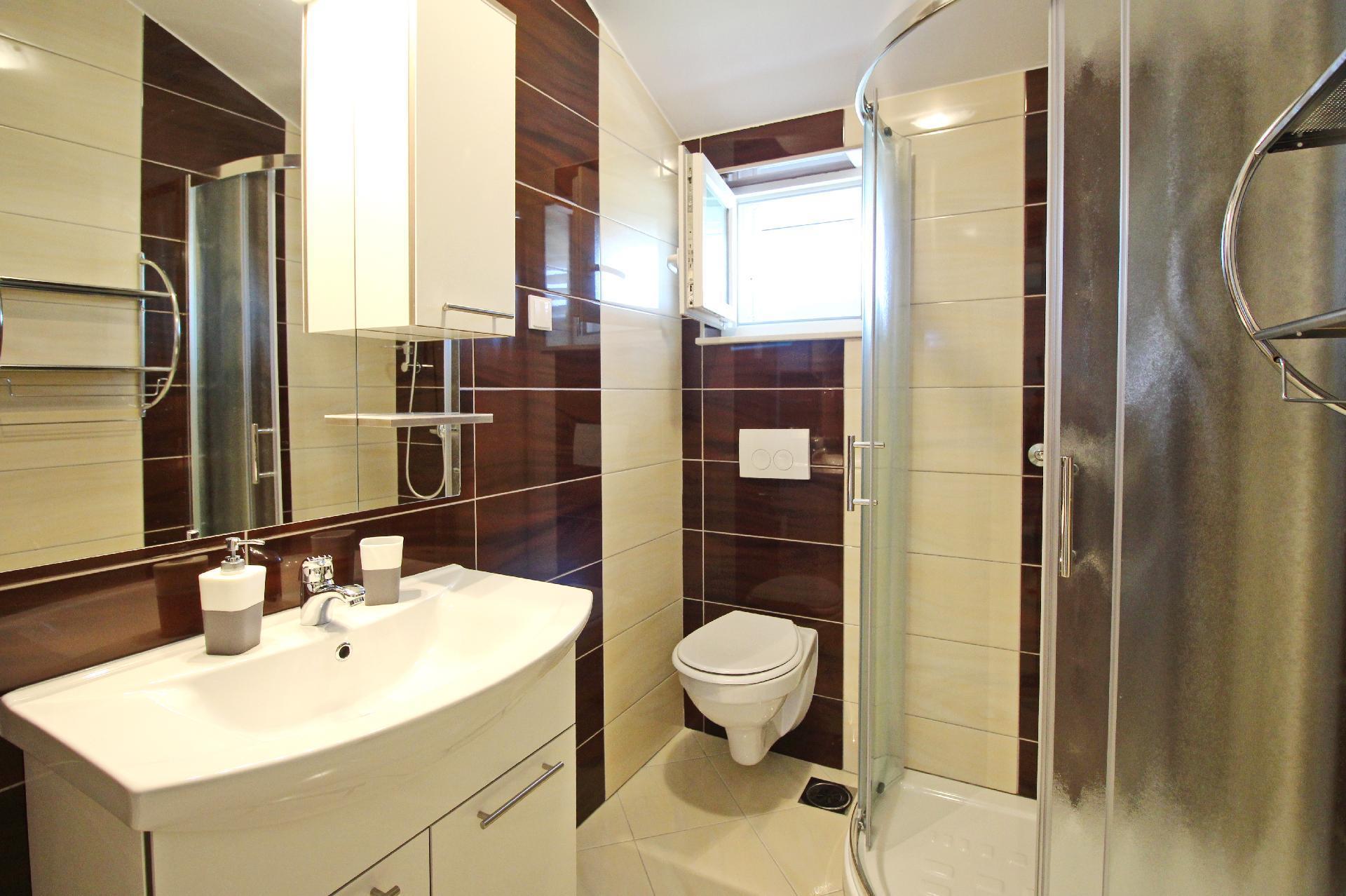 Apartment Flora 7 for accommodation up to max. 4 persons, cozy and modern, situated in an apartment building only 300 m from the famous beautiful beach of Baška. The apartment is located on the second floor of the building and consists of a space that combines a living room, a fully equipped kitchen with a dining area, two bedrooms with a double bed, two bathrooms with a shower and a toilet, and a balcony. It is equipped with SAT TV, air conditioning, WiFi, and in the shared garden there is a large swimming pool that is available to all guests.