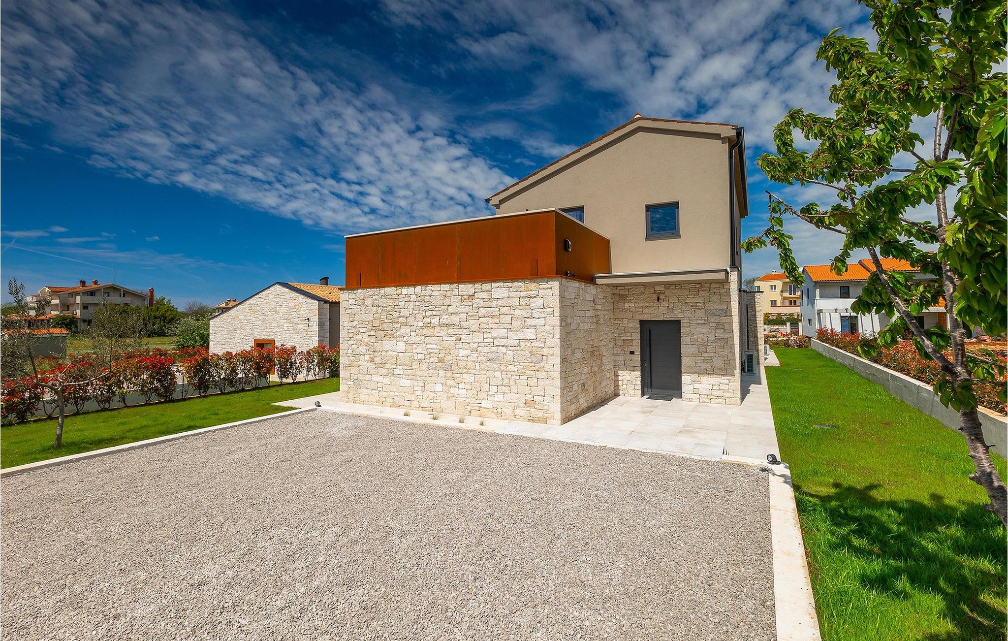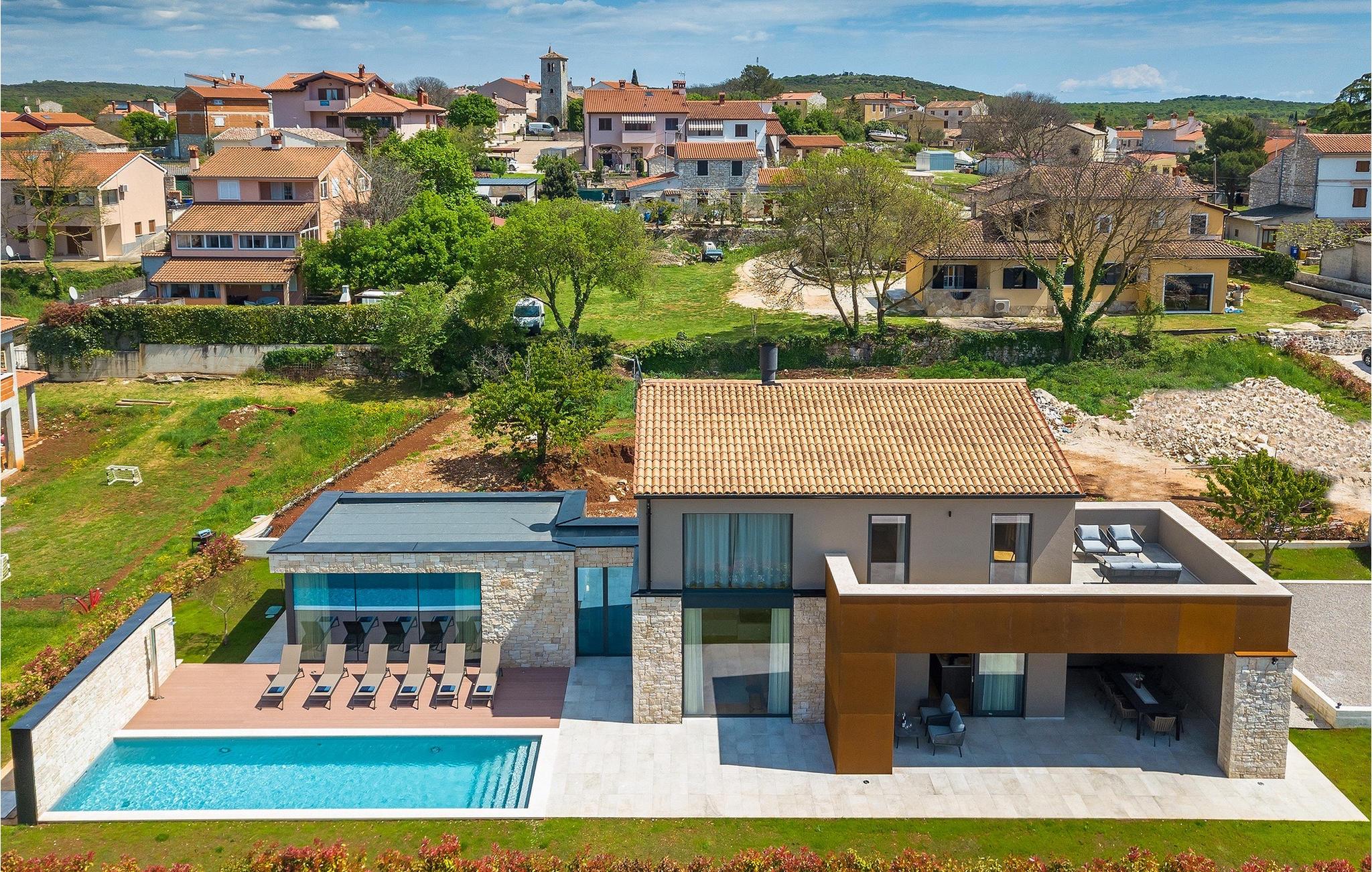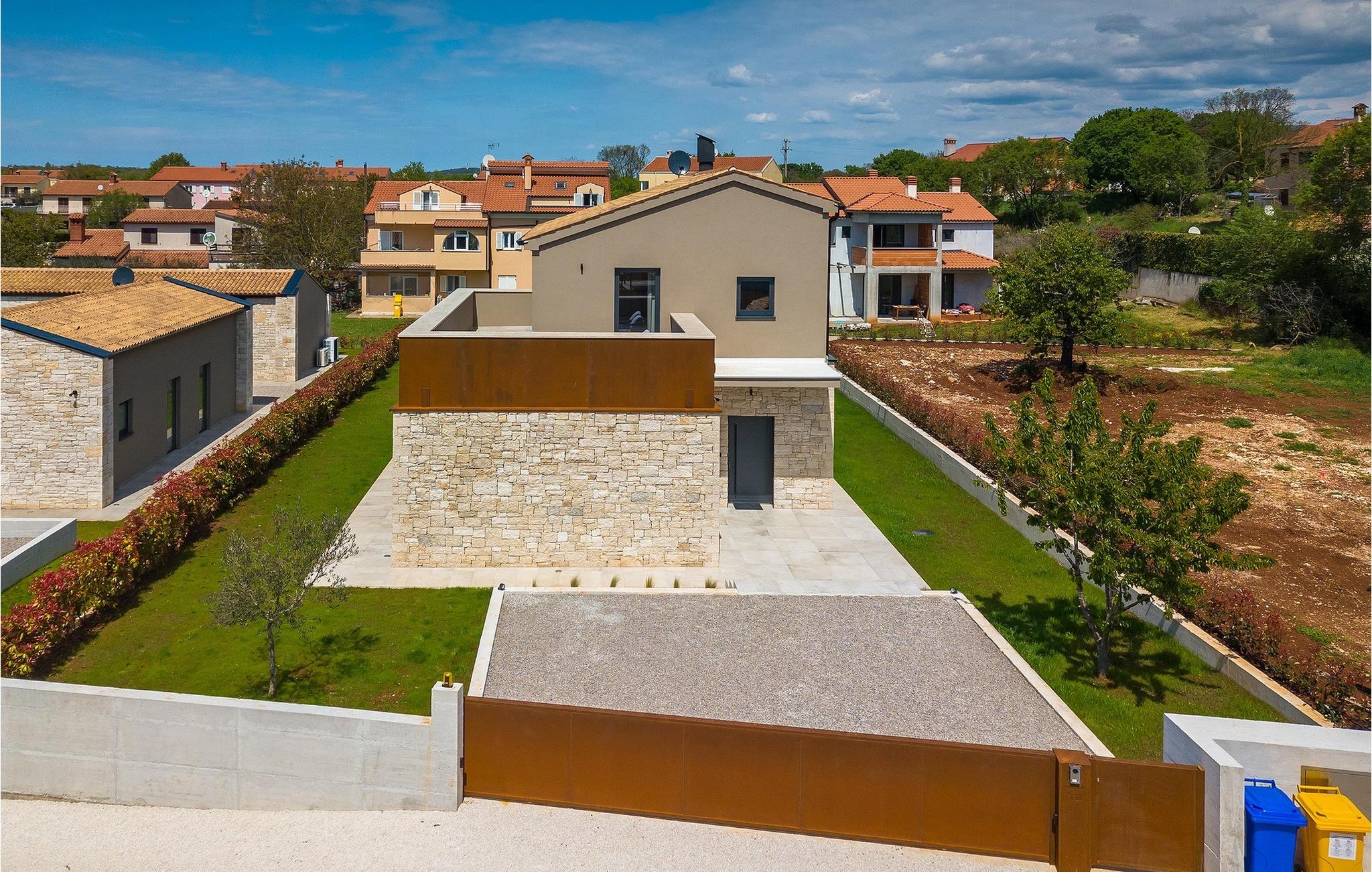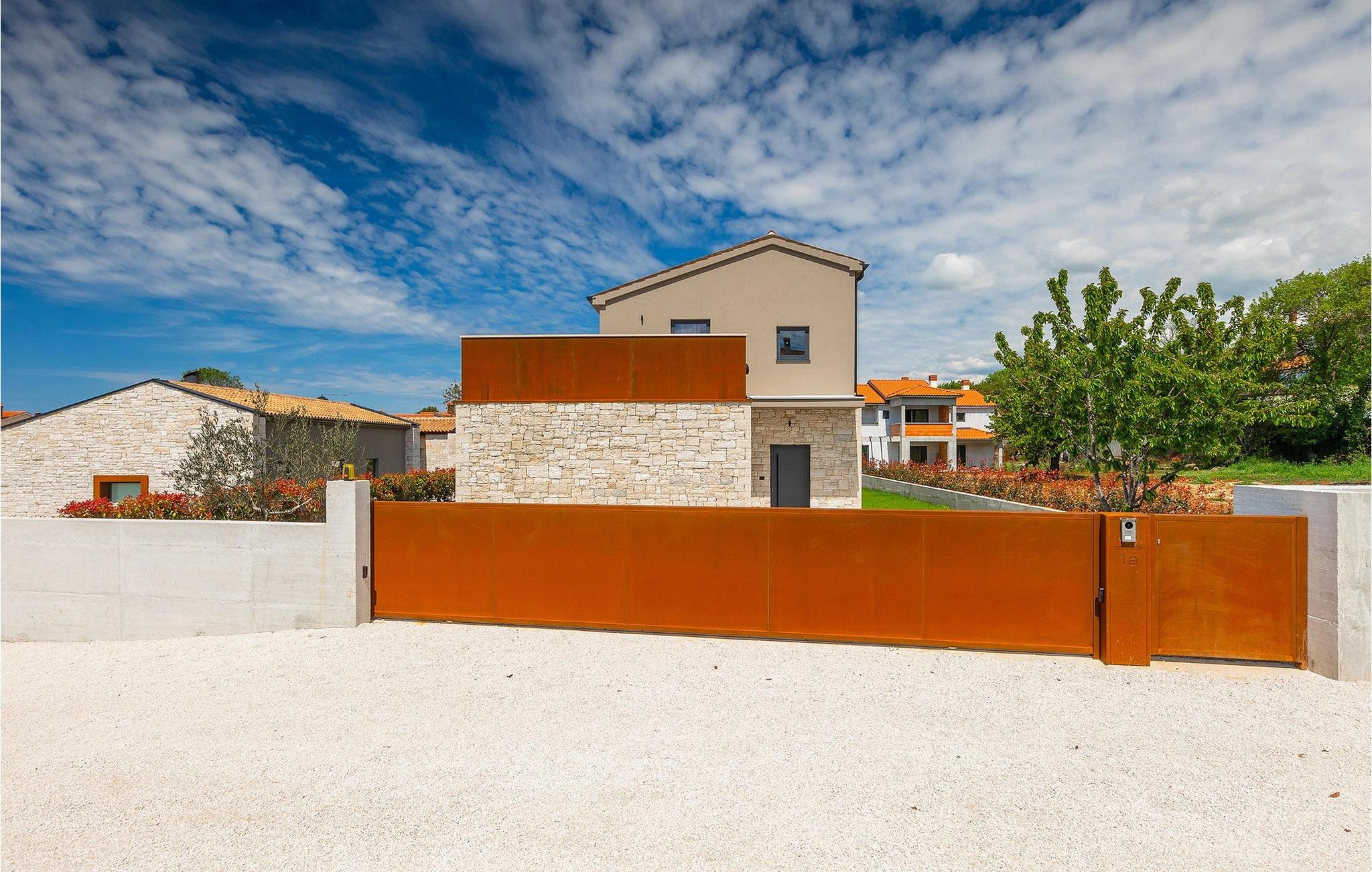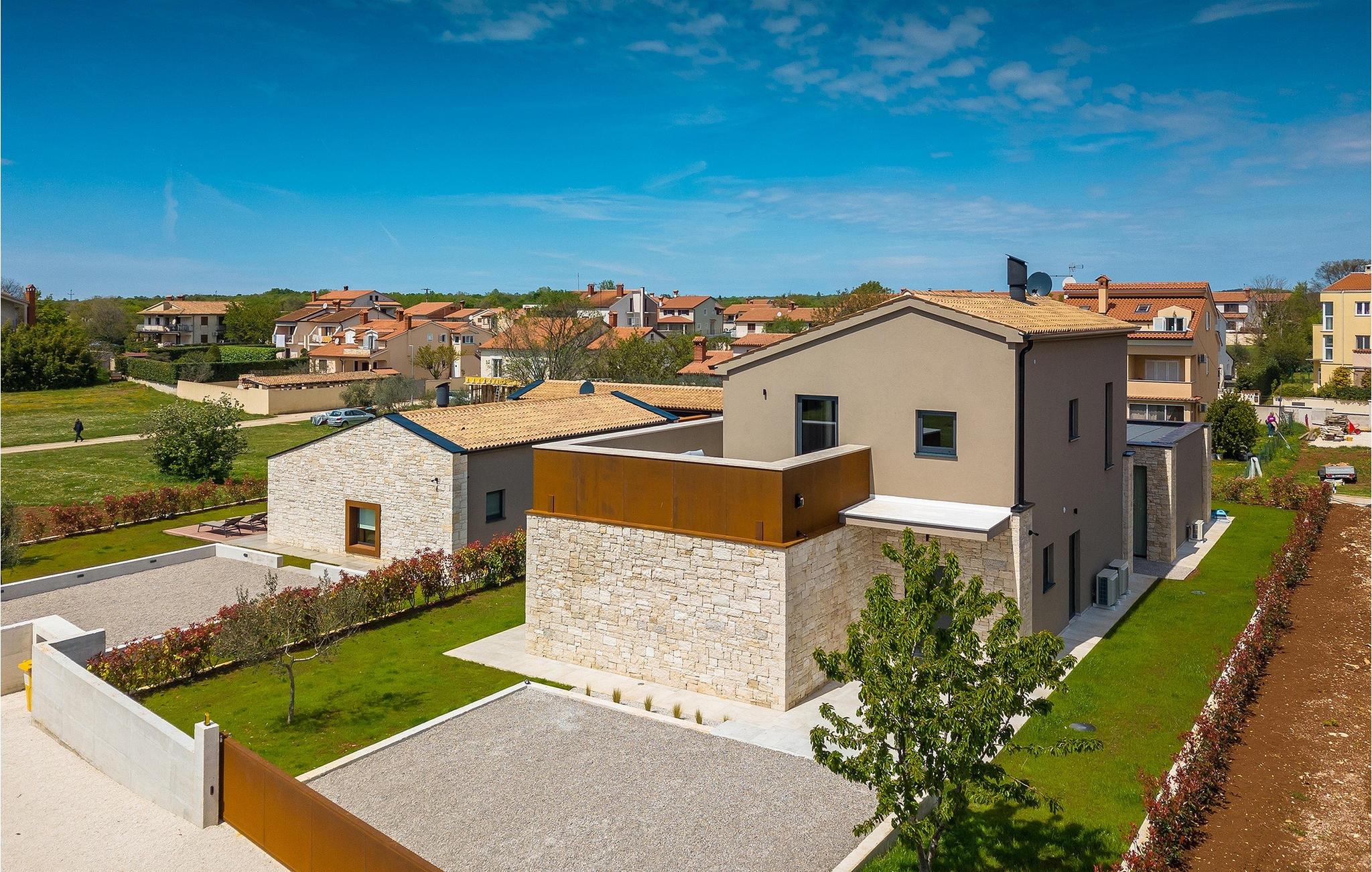 Wenn Sie von einem ruhigen Familienurlaub in der istrischen Landschaft unweit der Küste träumen, dann ist die Villa Palmeta die ideale Wahl für Sie! Diese ausgezeichnete moderne Villa befindet sich in Bale in der Nähe von Rovinj und bietet Platz für bis zu 8 Personen. Im Außenbereich steht Ihnen ein privater Pool zur Verfügung, bei dem Sie sonnige Tage mit Ihrem Lieblingsgetränk in der Hand verbringen werden. Um sich vollkommen zu entspannen, stehen neben dem Pool Liegestühle und Sonnenschirme bereit. Wir sind sicher, dass Sie angenehme Sommerabende mit Familie und Freunden auf der überdachten Terrasse genießen werden, wo Ihnen eine Sommerküche mit Esstisch zur Verfügung steht, an der Sie sich entspannen können, während Sie die romantische Kulisse unter dem Sternenhimmel genießen. Das Innere dieser Villa wird Sie sicherlich begeistern. Eine harmonische Kombination aus modernem Design und natürlichen Materialien zieht sich durch den Innenbereich der Villa. Im Erdgeschoss steht Ihnen ein geräumiges Wohnzimmer mit Blick auf die Terrasse und den Pool zur Verfügung, sowie ein Esszimmer und eine voll ausgestattete Küche. Dank der großen Glasscheiben im Wohnzimmer ist der Innenraum wunderbar mit der Umgebung verbunden. Im Erdgeschoss befindet sich außerdem ein Schlafzimmer mit eigenem Bad und im Obergeschoss finden Sie zwei weitere moderne Schlafzimmer mit elegant gestalteten Bädern. Darüber hinaus können Sie sich im Obergeschoss auf der Galerie entspannen oder auf der Terrasse mit Blick auf die wunderschöne Umgebung eine Tasse Morgenkaffee genießen. Bale ist ein kleiner Ort im kontinentalen Teil Istriens in der Nähe von Rovinj. Eine gute Lage für Tagesausflüge entweder in Richtung Küste oder weiter ins Landesinnere. Es gibt viele Möglichkeiten, Strände und Buchten zu erkunden, und von den Städten aus sollten Sie unbedingt Rovinj und Pula besuchen. In Rovinj werden Sie von den farbenfrohen Häusern und der Kirche St. Euphemia an der Spitze der Altstadt begeistert sein. Besuchen Sie in Pula zahlreiche Sehenswürdigkeiten und wenn Sie es schaffen, besuchen Sie unbedingt ein Konzert in der Pula Arena. Im inneren Teil Istriens finden Sie viele Tavernen und Restaurants mit istrischen Köstlichkeiten, und es gibt auch zahlreiche Weingüter, in denen Sie lokale Weine probieren können.