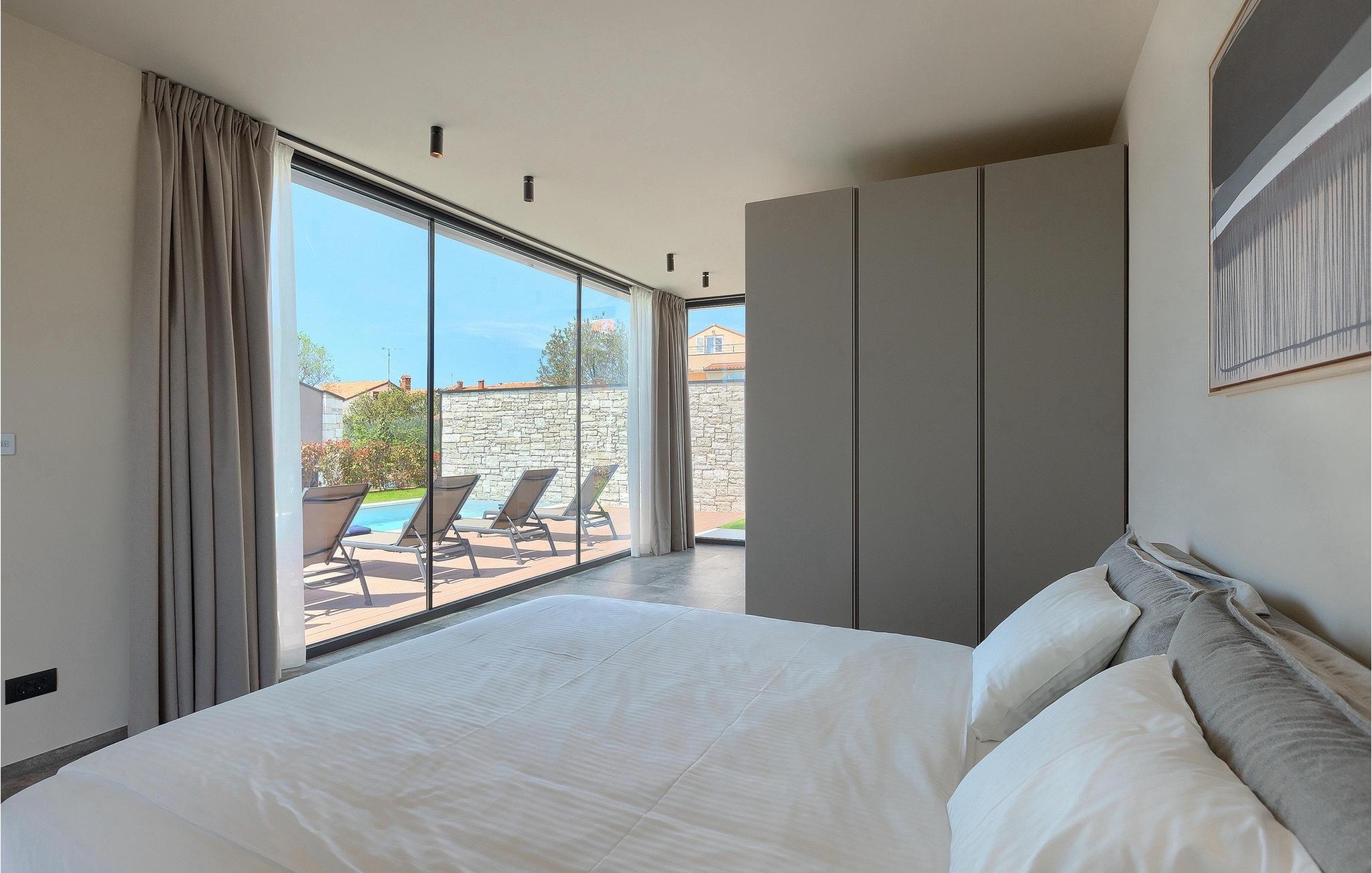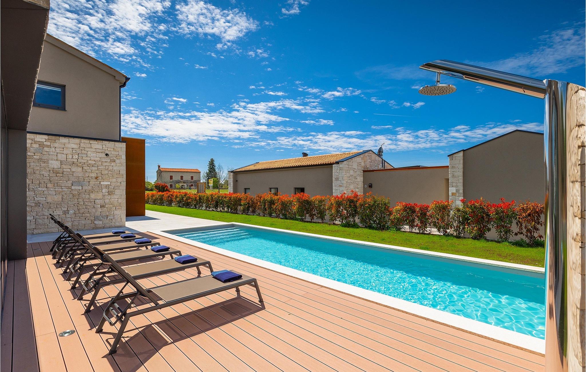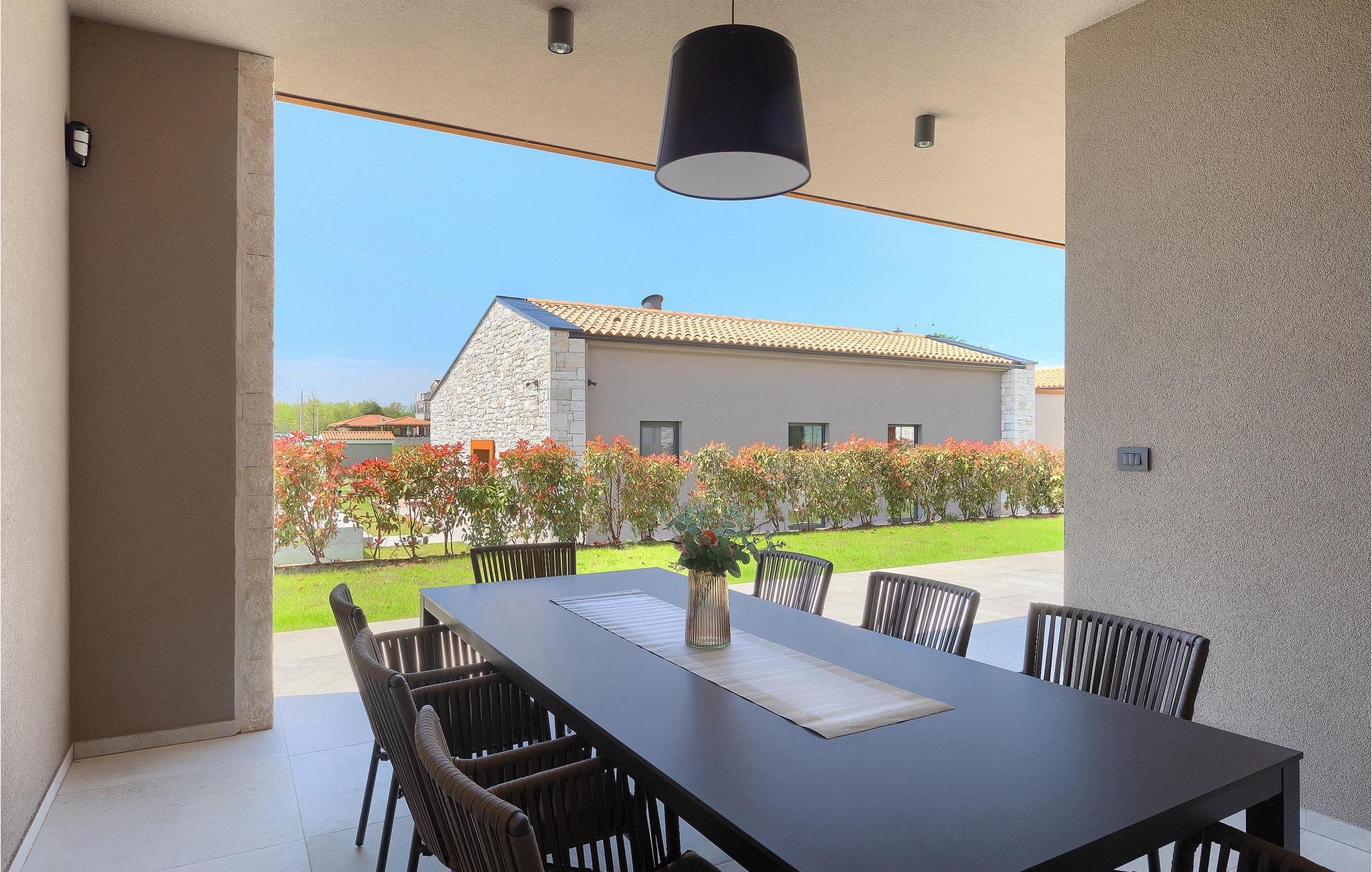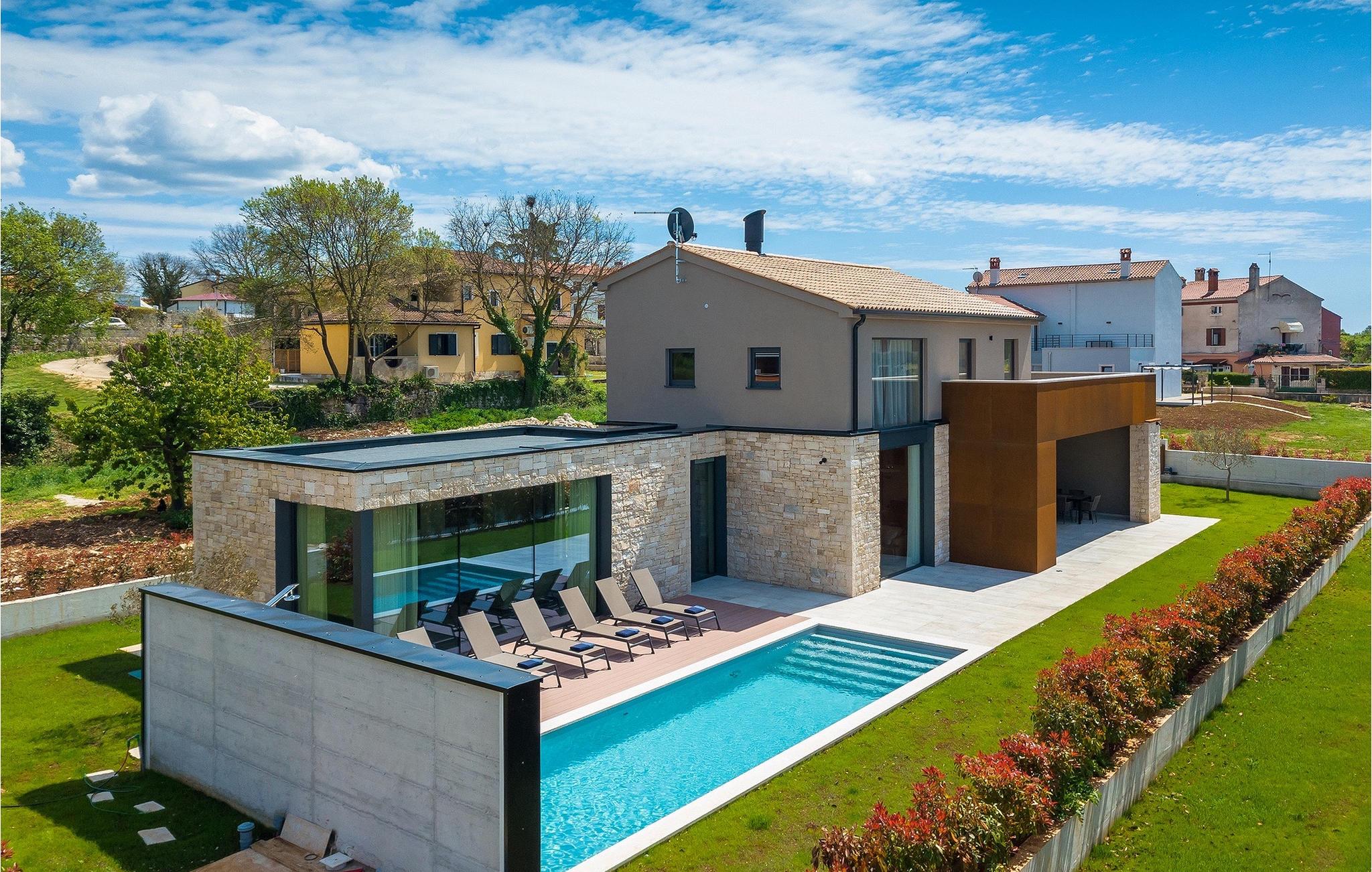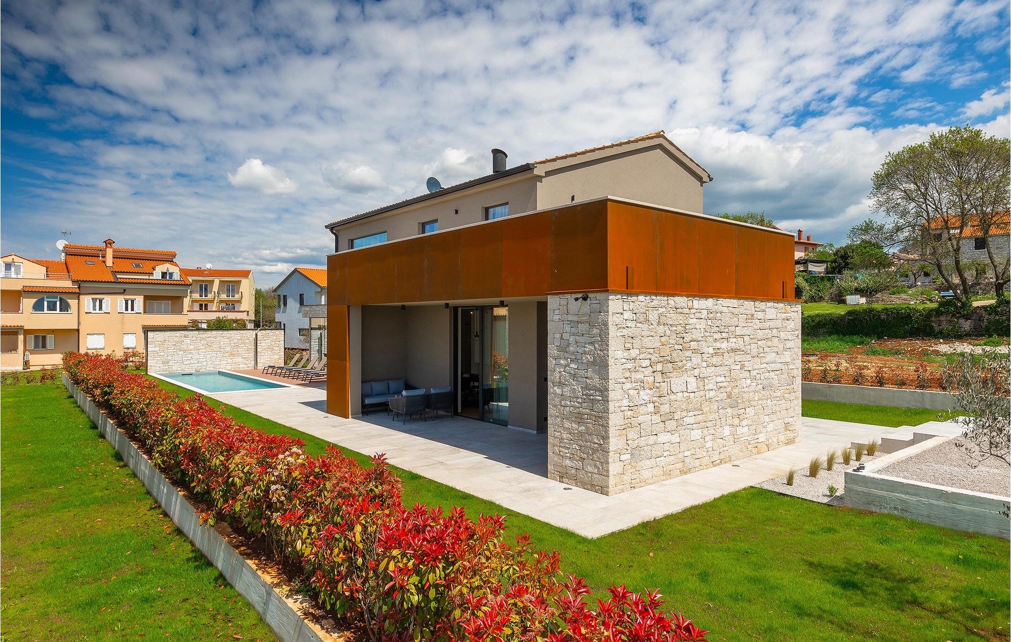 Wenn Sie von einem ruhigen Familienurlaub in der istrischen Landschaft unweit der Küste träumen, dann ist die Villa Palmeta die ideale Wahl für Sie! Diese ausgezeichnete moderne Villa befindet sich in Bale in der Nähe von Rovinj und bietet Platz für bis zu 8 Personen. Im Außenbereich steht Ihnen ein privater Pool zur Verfügung, bei dem Sie sonnige Tage mit Ihrem Lieblingsgetränk in der Hand verbringen werden. Um sich vollkommen zu entspannen, stehen neben dem Pool Liegestühle und Sonnenschirme bereit. Wir sind sicher, dass Sie angenehme Sommerabende mit Familie und Freunden auf der überdachten Terrasse genießen werden, wo Ihnen eine Sommerküche mit Esstisch zur Verfügung steht, an der Sie sich entspannen können, während Sie die romantische Kulisse unter dem Sternenhimmel genießen. Das Innere dieser Villa wird Sie sicherlich begeistern. Eine harmonische Kombination aus modernem Design und natürlichen Materialien zieht sich durch den Innenbereich der Villa. Im Erdgeschoss steht Ihnen ein geräumiges Wohnzimmer mit Blick auf die Terrasse und den Pool zur Verfügung, sowie ein Esszimmer und eine voll ausgestattete Küche. Dank der großen Glasscheiben im Wohnzimmer ist der Innenraum wunderbar mit der Umgebung verbunden. Im Erdgeschoss befindet sich außerdem ein Schlafzimmer mit eigenem Bad und im Obergeschoss finden Sie zwei weitere moderne Schlafzimmer mit elegant gestalteten Bädern. Darüber hinaus können Sie sich im Obergeschoss auf der Galerie entspannen oder auf der Terrasse mit Blick auf die wunderschöne Umgebung eine Tasse Morgenkaffee genießen. Bale ist ein kleiner Ort im kontinentalen Teil Istriens in der Nähe von Rovinj. Eine gute Lage für Tagesausflüge entweder in Richtung Küste oder weiter ins Landesinnere. Es gibt viele Möglichkeiten, Strände und Buchten zu erkunden, und von den Städten aus sollten Sie unbedingt Rovinj und Pula besuchen. In Rovinj werden Sie von den farbenfrohen Häusern und der Kirche St. Euphemia an der Spitze der Altstadt begeistert sein. Besuchen Sie in Pula zahlreiche Sehenswürdigkeiten und wenn Sie es schaffen, besuchen Sie unbedingt ein Konzert in der Pula Arena. Im inneren Teil Istriens finden Sie viele Tavernen und Restaurants mit istrischen Köstlichkeiten, und es gibt auch zahlreiche Weingüter, in denen Sie lokale Weine probieren können.