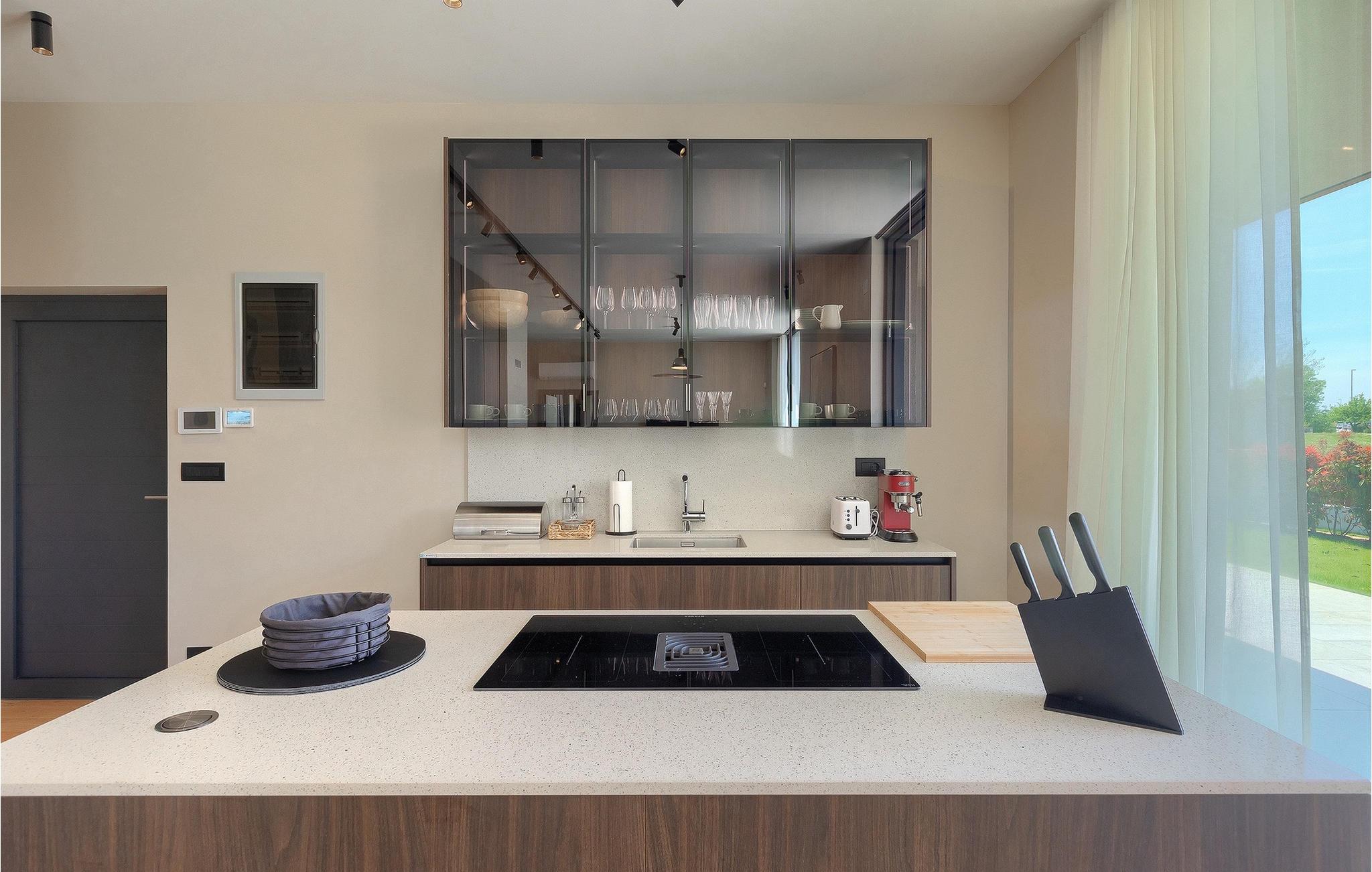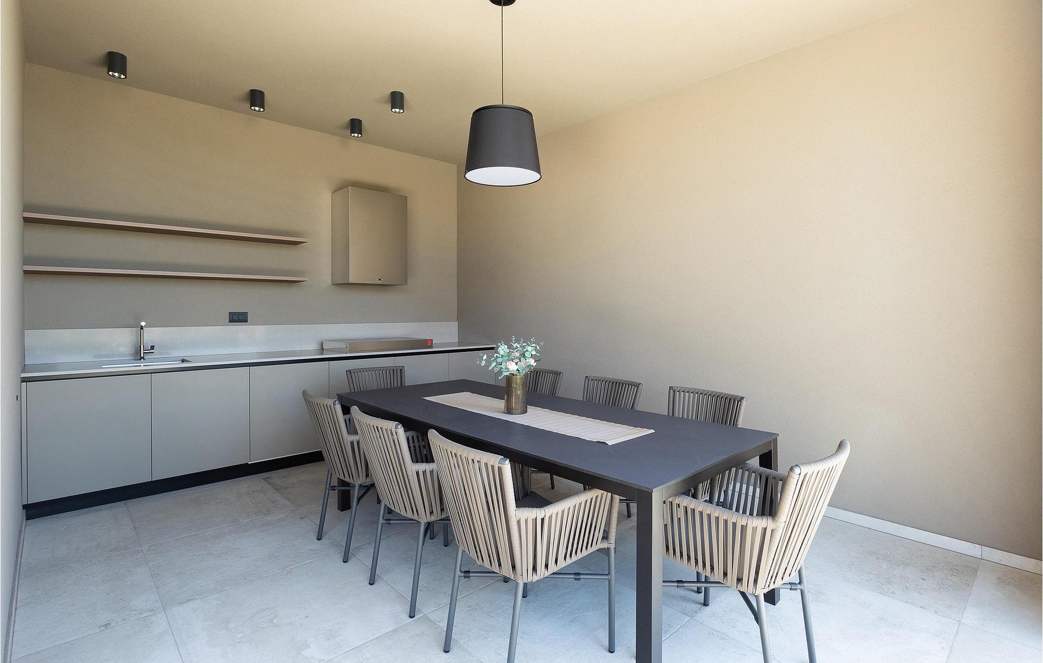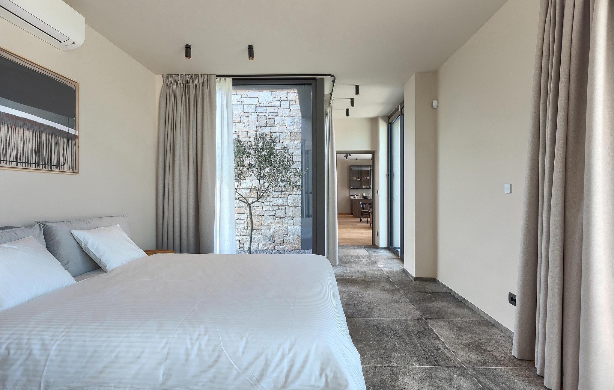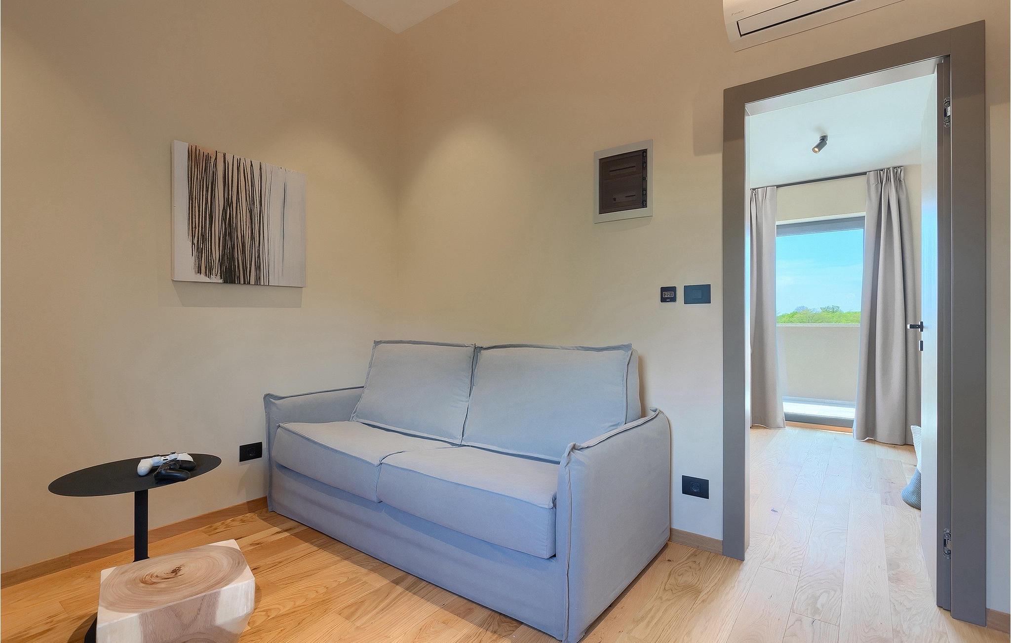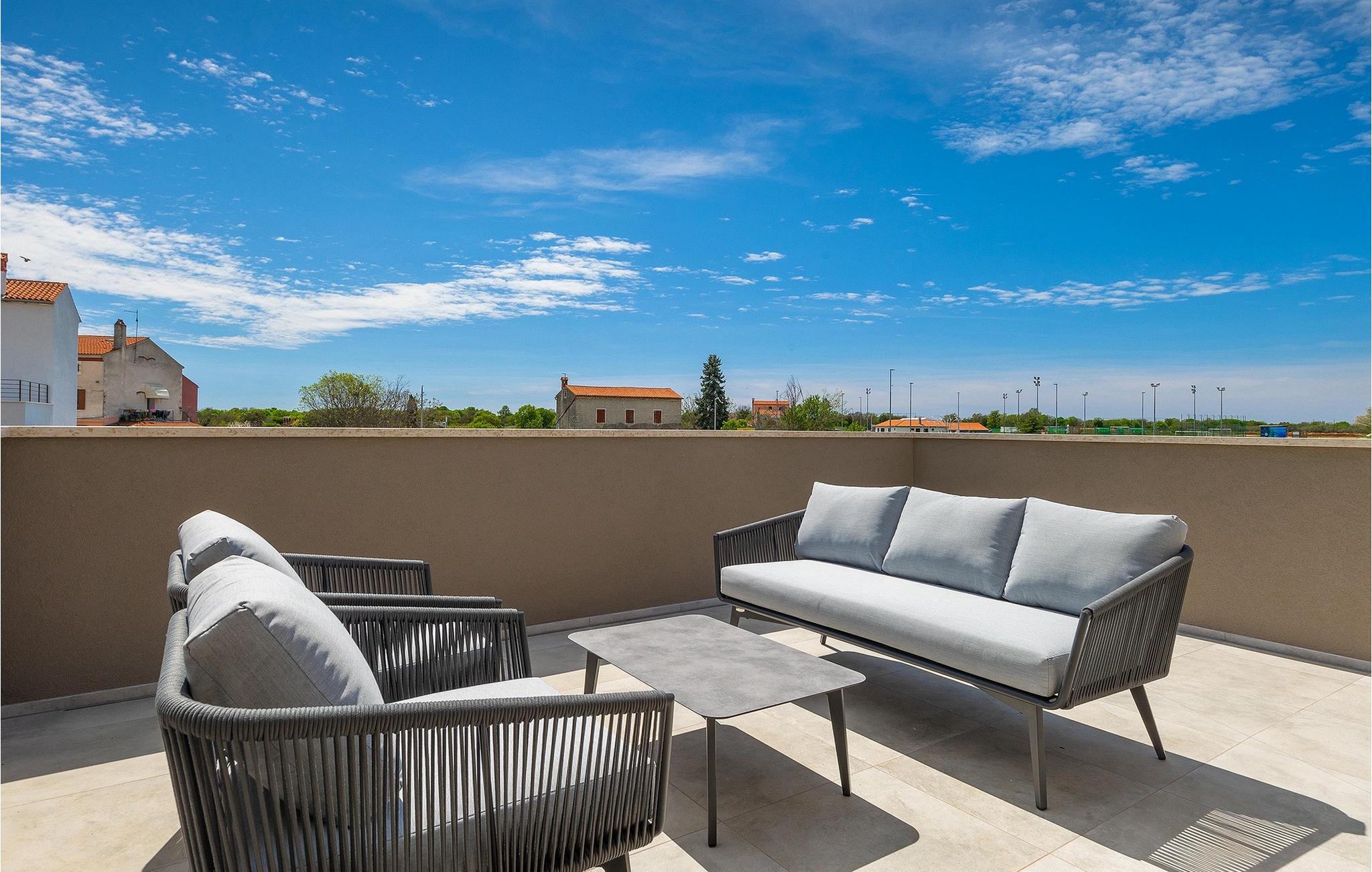 Wenn Sie von einem ruhigen Familienurlaub in der istrischen Landschaft unweit der Küste träumen, dann ist die Villa Palmeta die ideale Wahl für Sie! Diese ausgezeichnete moderne Villa befindet sich in Bale in der Nähe von Rovinj und bietet Platz für bis zu 8 Personen. Im Außenbereich steht Ihnen ein privater Pool zur Verfügung, bei dem Sie sonnige Tage mit Ihrem Lieblingsgetränk in der Hand verbringen werden. Um sich vollkommen zu entspannen, stehen neben dem Pool Liegestühle und Sonnenschirme bereit. Wir sind sicher, dass Sie angenehme Sommerabende mit Familie und Freunden auf der überdachten Terrasse genießen werden, wo Ihnen eine Sommerküche mit Esstisch zur Verfügung steht, an der Sie sich entspannen können, während Sie die romantische Kulisse unter dem Sternenhimmel genießen. Das Innere dieser Villa wird Sie sicherlich begeistern. Eine harmonische Kombination aus modernem Design und natürlichen Materialien zieht sich durch den Innenbereich der Villa. Im Erdgeschoss steht Ihnen ein geräumiges Wohnzimmer mit Blick auf die Terrasse und den Pool zur Verfügung, sowie ein Esszimmer und eine voll ausgestattete Küche. Dank der großen Glasscheiben im Wohnzimmer ist der Innenraum wunderbar mit der Umgebung verbunden. Im Erdgeschoss befindet sich außerdem ein Schlafzimmer mit eigenem Bad und im Obergeschoss finden Sie zwei weitere moderne Schlafzimmer mit elegant gestalteten Bädern. Darüber hinaus können Sie sich im Obergeschoss auf der Galerie entspannen oder auf der Terrasse mit Blick auf die wunderschöne Umgebung eine Tasse Morgenkaffee genießen. Bale ist ein kleiner Ort im kontinentalen Teil Istriens in der Nähe von Rovinj. Eine gute Lage für Tagesausflüge entweder in Richtung Küste oder weiter ins Landesinnere. Es gibt viele Möglichkeiten, Strände und Buchten zu erkunden, und von den Städten aus sollten Sie unbedingt Rovinj und Pula besuchen. In Rovinj werden Sie von den farbenfrohen Häusern und der Kirche St. Euphemia an der Spitze der Altstadt begeistert sein. Besuchen Sie in Pula zahlreiche Sehenswürdigkeiten und wenn Sie es schaffen, besuchen Sie unbedingt ein Konzert in der Pula Arena. Im inneren Teil Istriens finden Sie viele Tavernen und Restaurants mit istrischen Köstlichkeiten, und es gibt auch zahlreiche Weingüter, in denen Sie lokale Weine probieren können.