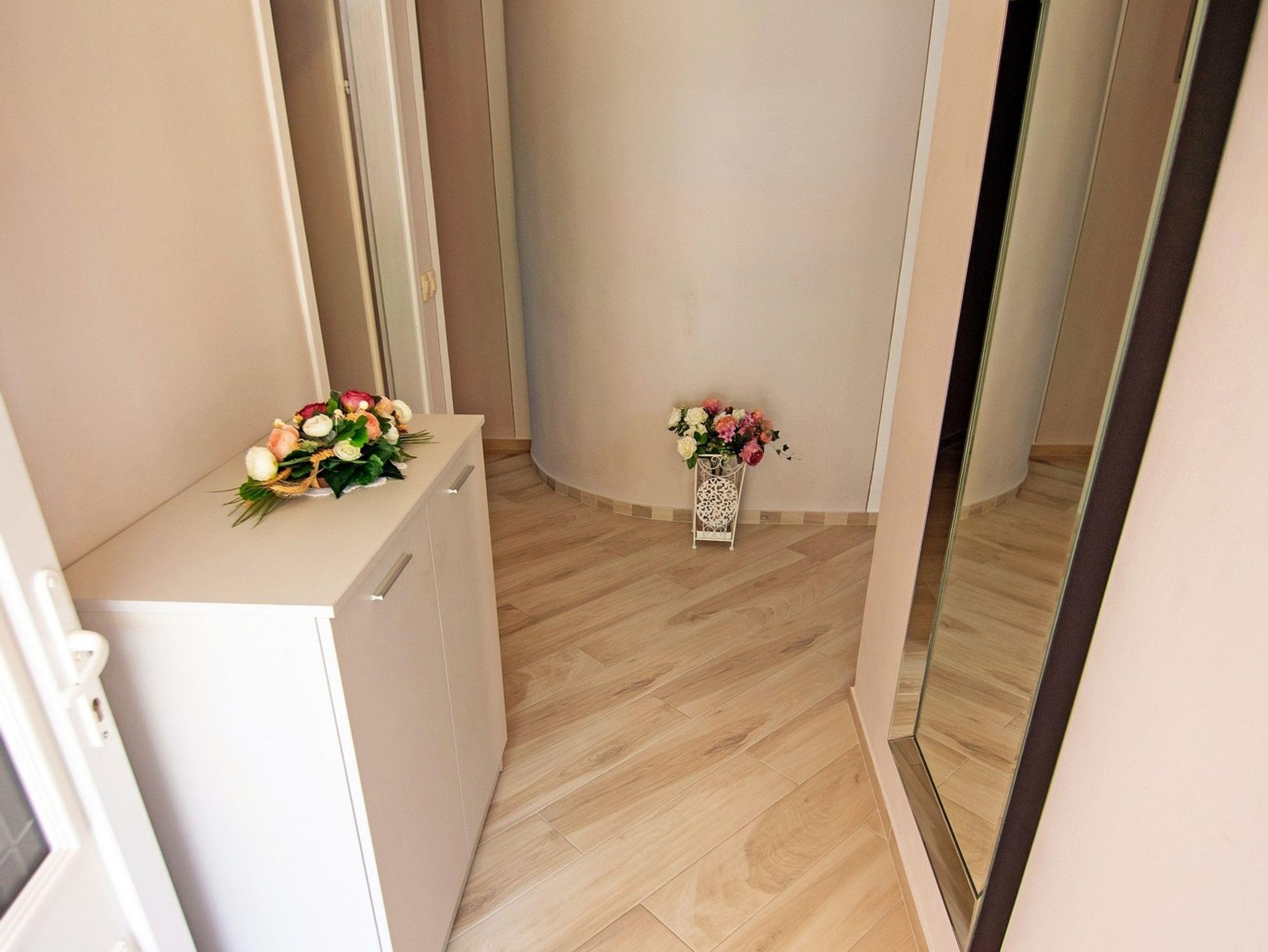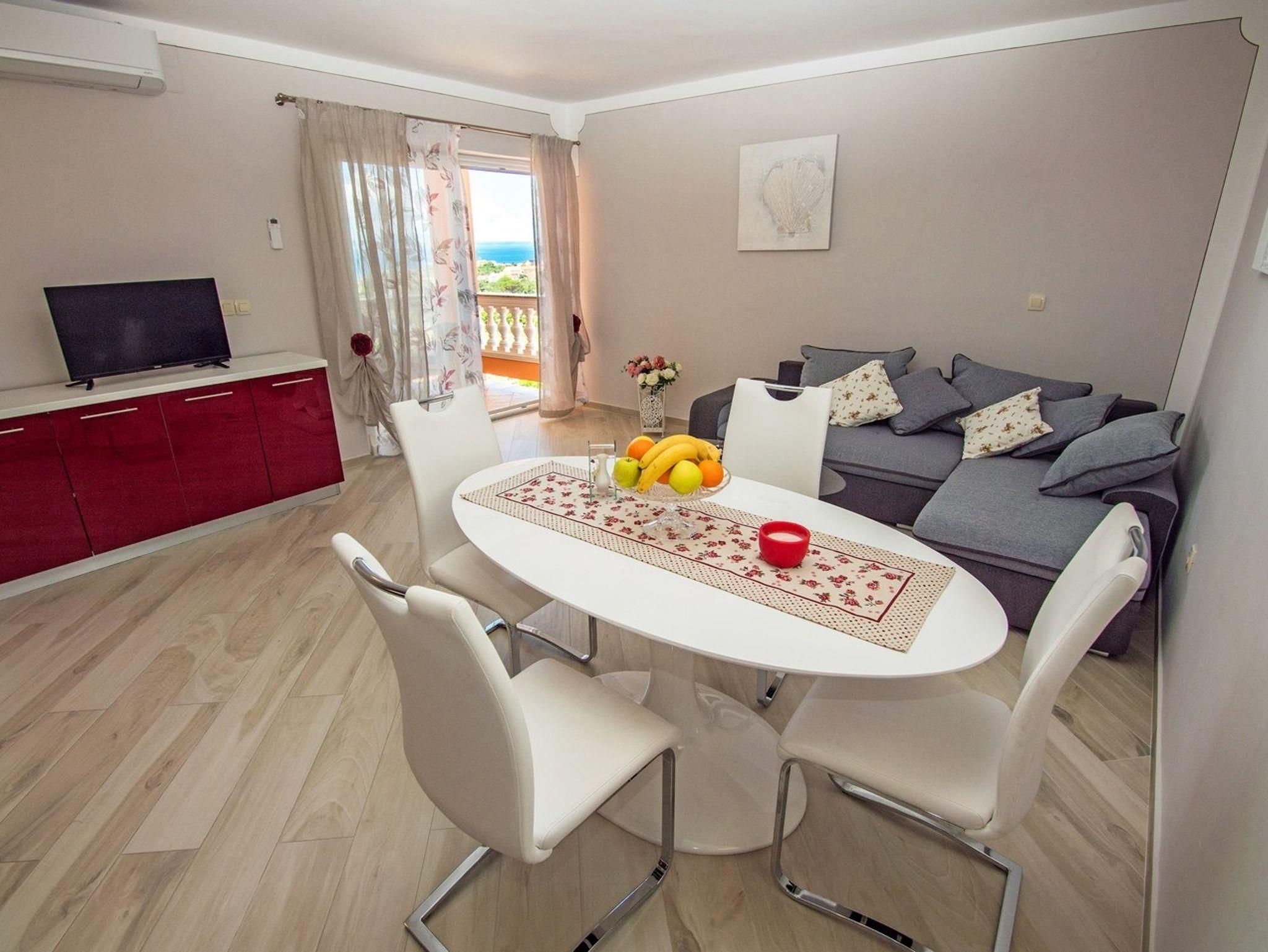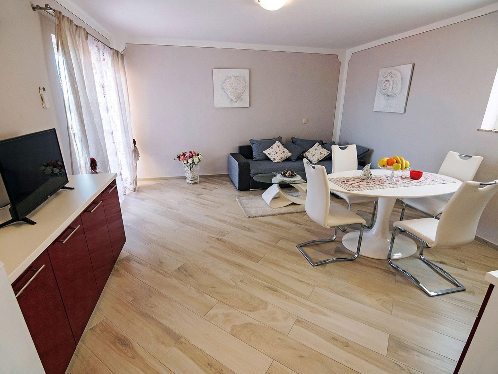 Ferienwohnung bietet Platz für 4 Gäste. Die Betten sind in Schlafzimmern, die es 1 gibt, und in Wohnzimmer, innerhalb einer Gesamtfläche von 52m2, angeordnet. Die Gäste haben einen eigenen Balkon zur Verfügung, auf der sie in warmen Sommernächten genießen können. Das Apartment bietet Meerblick. Es ist erlaubt, Speisen auf dem Gemeinschafts-Grill vorzubereiten. Während ihres Aufenthalts können Gäste das gemeinsam zur Nutzung stehende Schwimmbad benutzen. IM PREIS INBEGRIFFEN: Kurtaxe, Endreinigung, Klimatisierung, Pool, Parkplatz, Internet, Kinderbett, Bügeleisen, Föhn, Sonnenschirm, Liegestühle. VERBINDLICHE ZUSÄTZLICHE KOSTEN: Aufzahlung für Kurzaufenthalte (prozentualer Zuschlag pro Nächtigungsanzahl: 30% - 1, 20% - 2, 10% - 3). UNVERBINDLICHE ZUSÄTZLICHE KOSTEN: Frühstück (13,00 €, 50% Nachlass für Kinder zwischen 4 und 12 Jahren, Kinder bis 4 Jahre sind frei.), Bootsanlegeplatz (5,00 € pro Nacht), Zusatzbett (10,00 € pro Nacht). Die Verfügbarkeit zusätzlicher Dienstleistungen in Ihrem reservierten Termin und die Preise derselben (falls nicht aufgeführt) müssen im Voraus überprüft werden. Zusätzliche Dienstleistungen die in der Zahlungsaufforderung nicht aufgeführt sind werden direkt beim Vermieter bezahlt, angenommen der Gast nutzt auch diese.