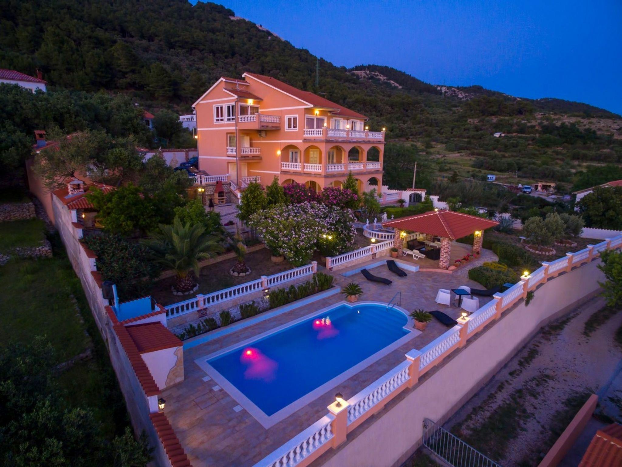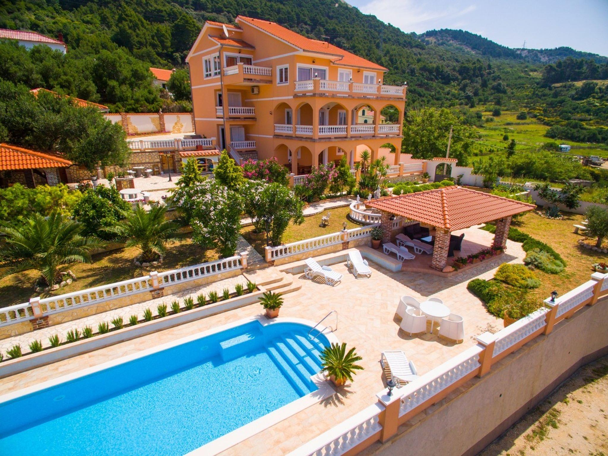 Umgebung des Objekts (Eingerichtet), Hof (1000m2, Kinderbereich, Sitzbereich), Parkplatz (Anzahl der Parkplätze: 4, Entfernung vom Objekt: im Hof), Pool: gemeinsam, Dimensionen: 8m x 4m x 1.5m, Wassertyp: Salzwasser, Grill: gemeinsam, Frühstück, WiFi Internet, Bootsanlegeplatz (Entfernung vom Objekt: 500 m, Bootsanlegeplatztyp: an der Küste), Föhn, Bügeleisen, Sonnenschirm, Liegestühle, Kinderbett