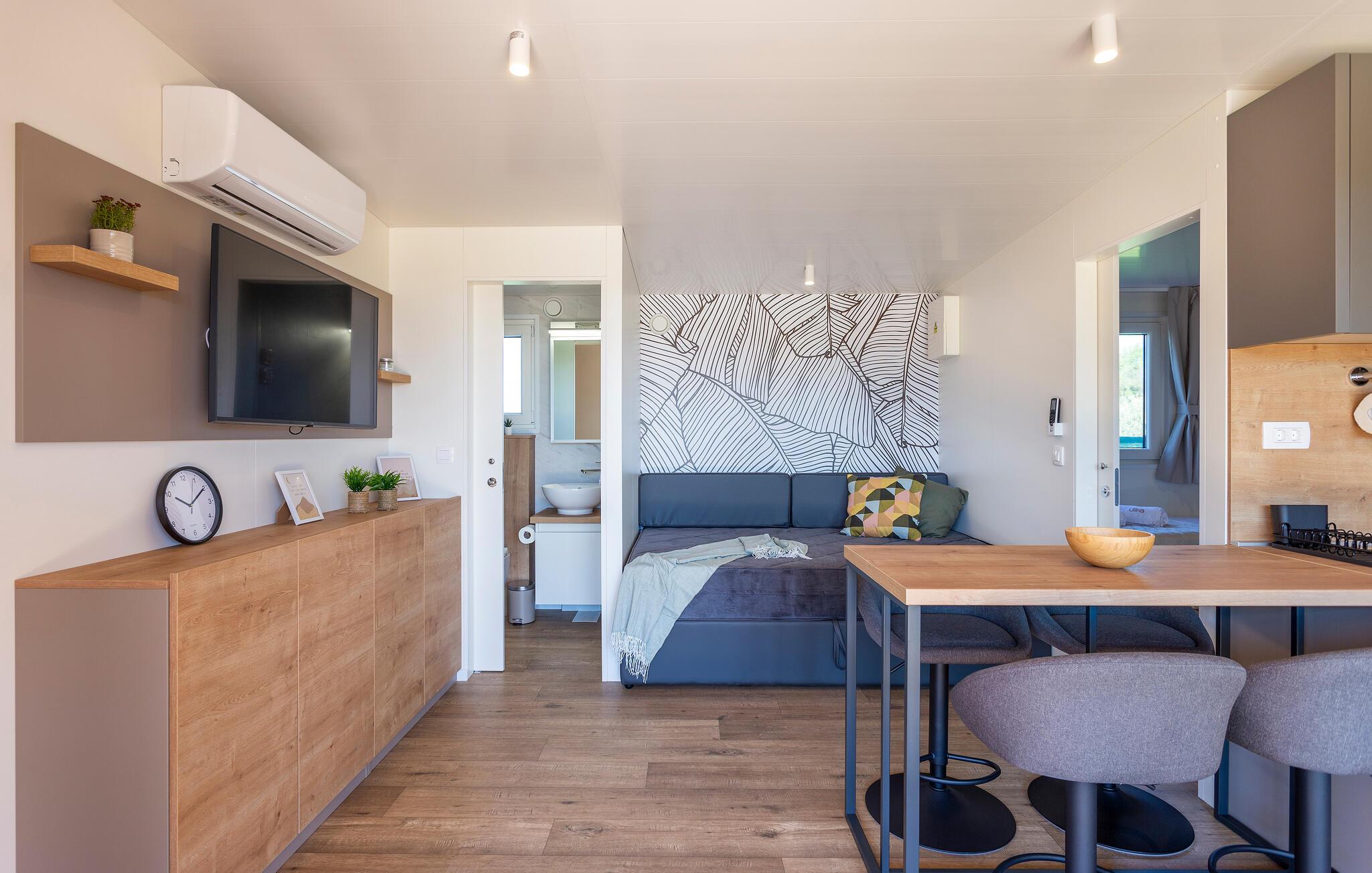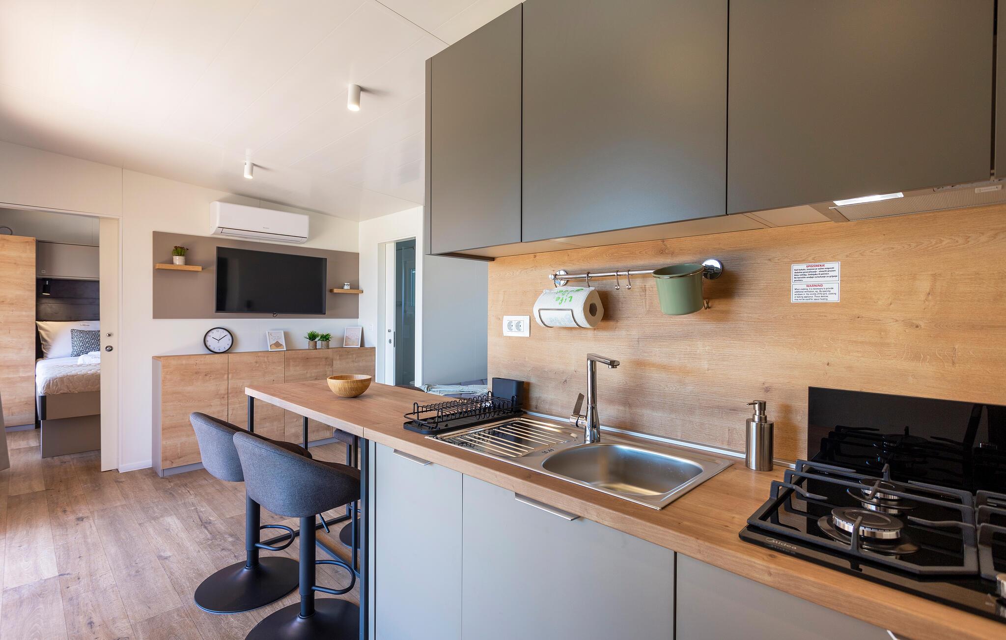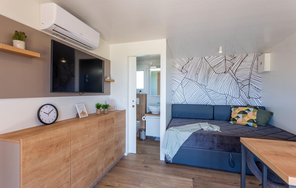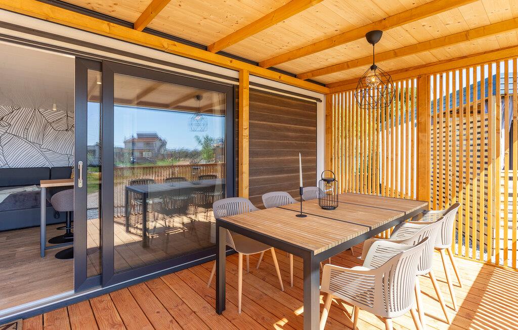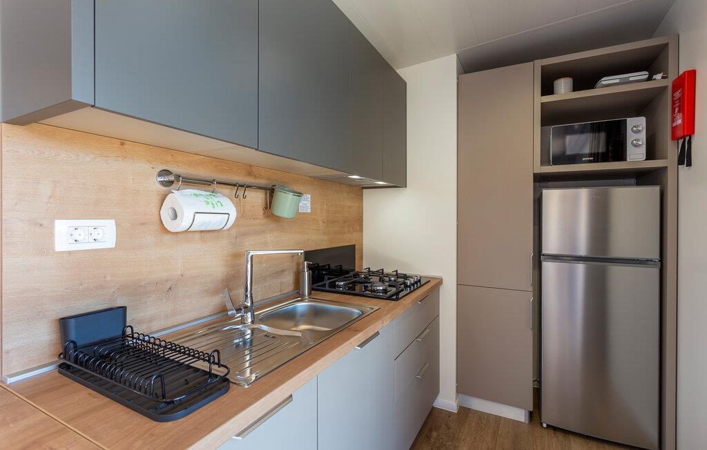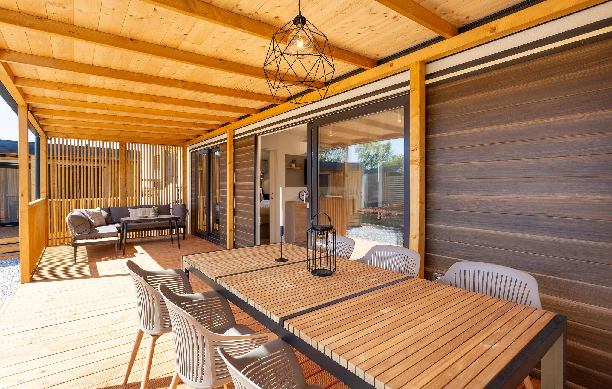 Stilvolle Einrichtung und eine tolle Wohlfühlatmosphäre empfängt Sie in diesem schönen Ferienhaus. Die Unterkunft ist ein wahres Platzwunder, in dem Design, Komfort und ein tolles Wohnkonzept auf Sie warten. Verbringen Sie einen Luxusurlaub auf diesem Campingplatz und genießen die Veranda wie ein zweites Wohnzimmer. Grillen, essen und entspannen Sie sich nach erlebnisreichen Tagen.
