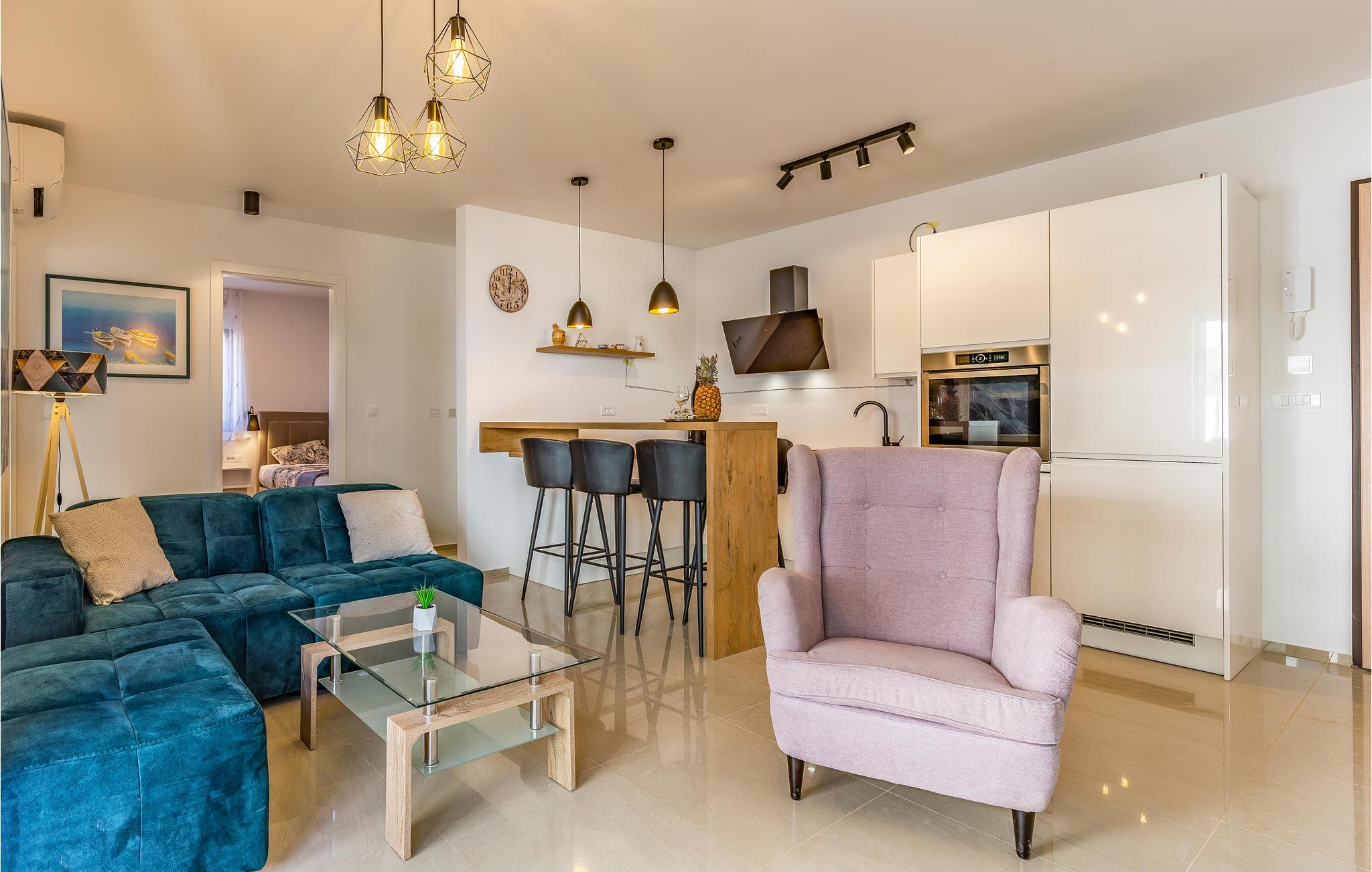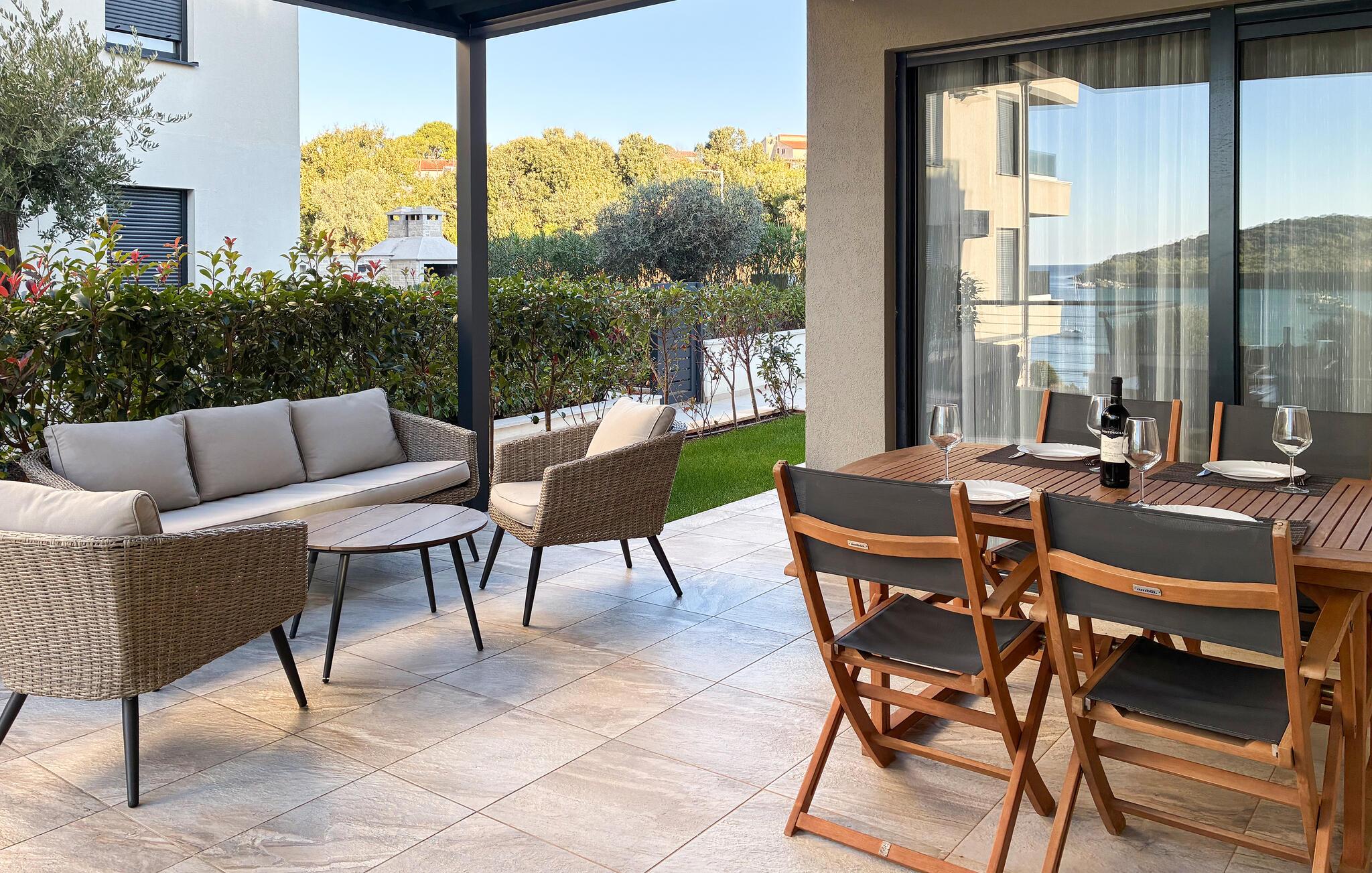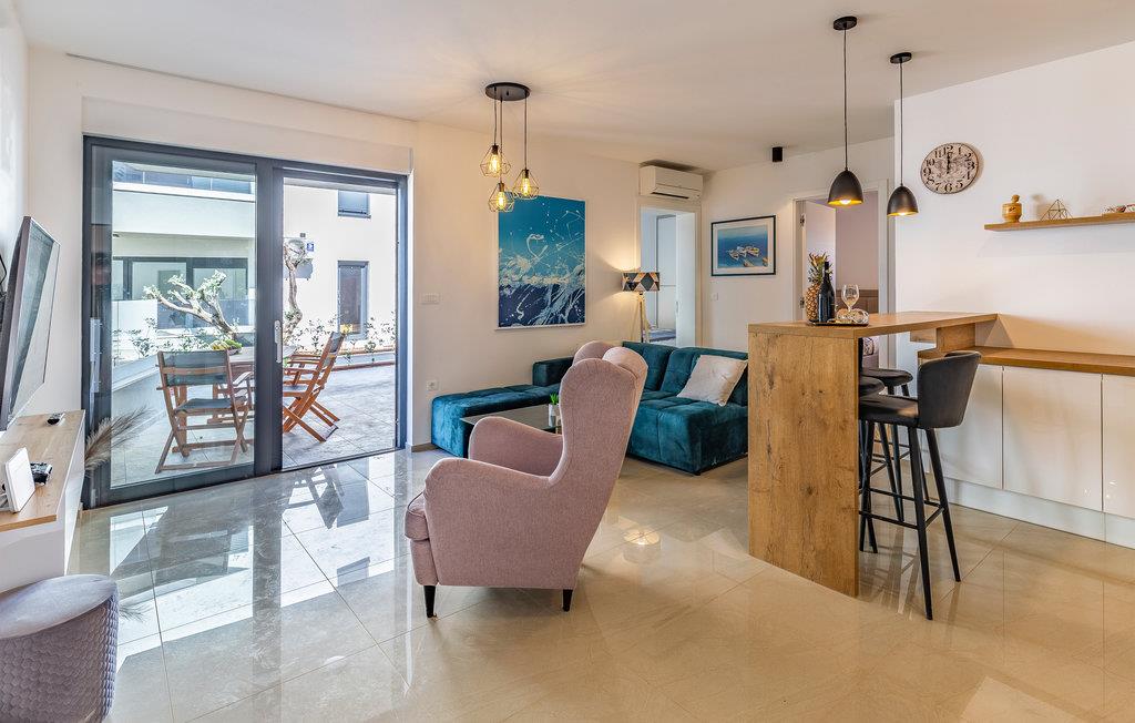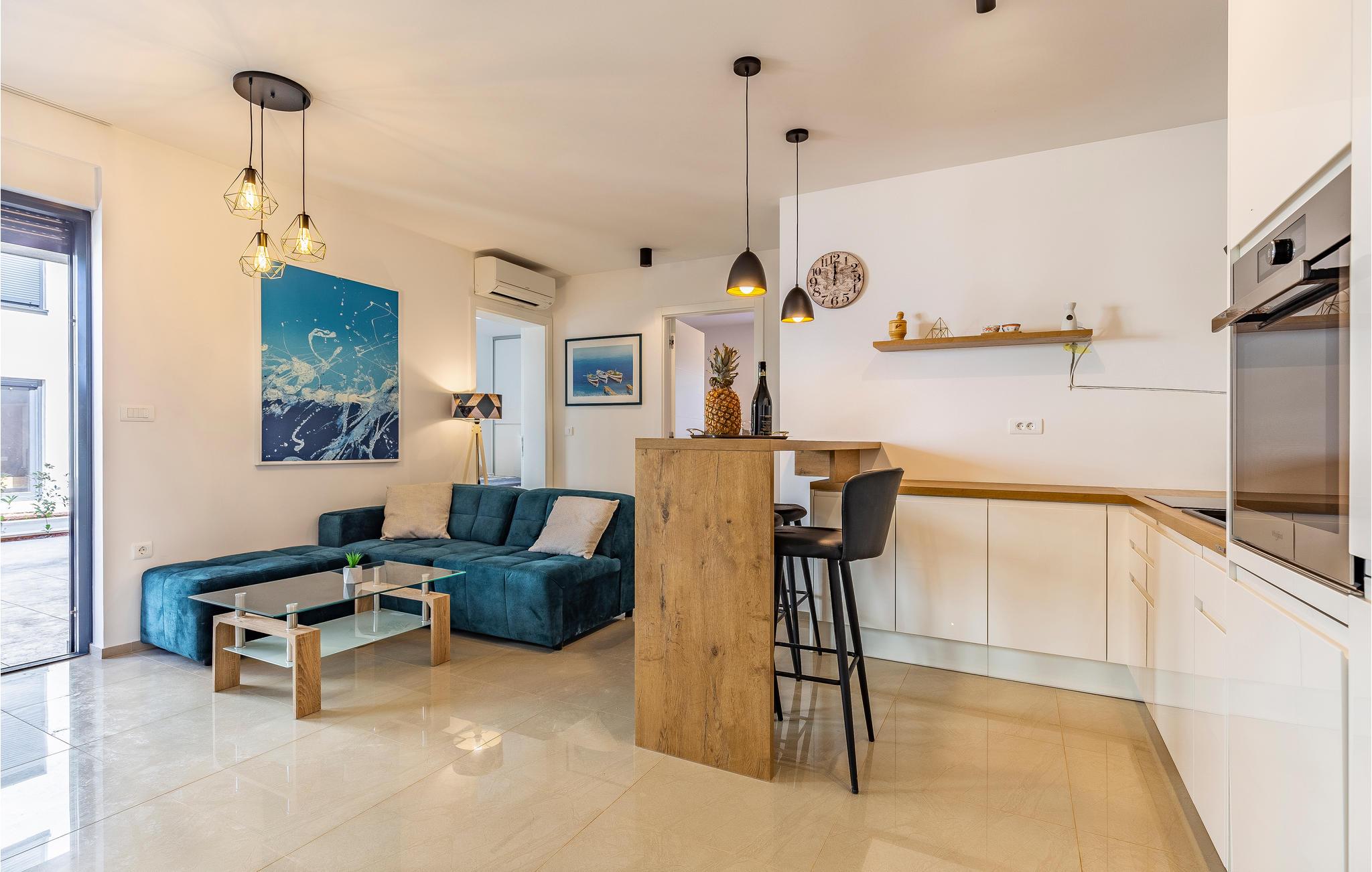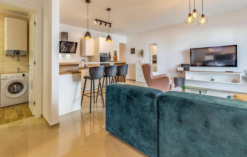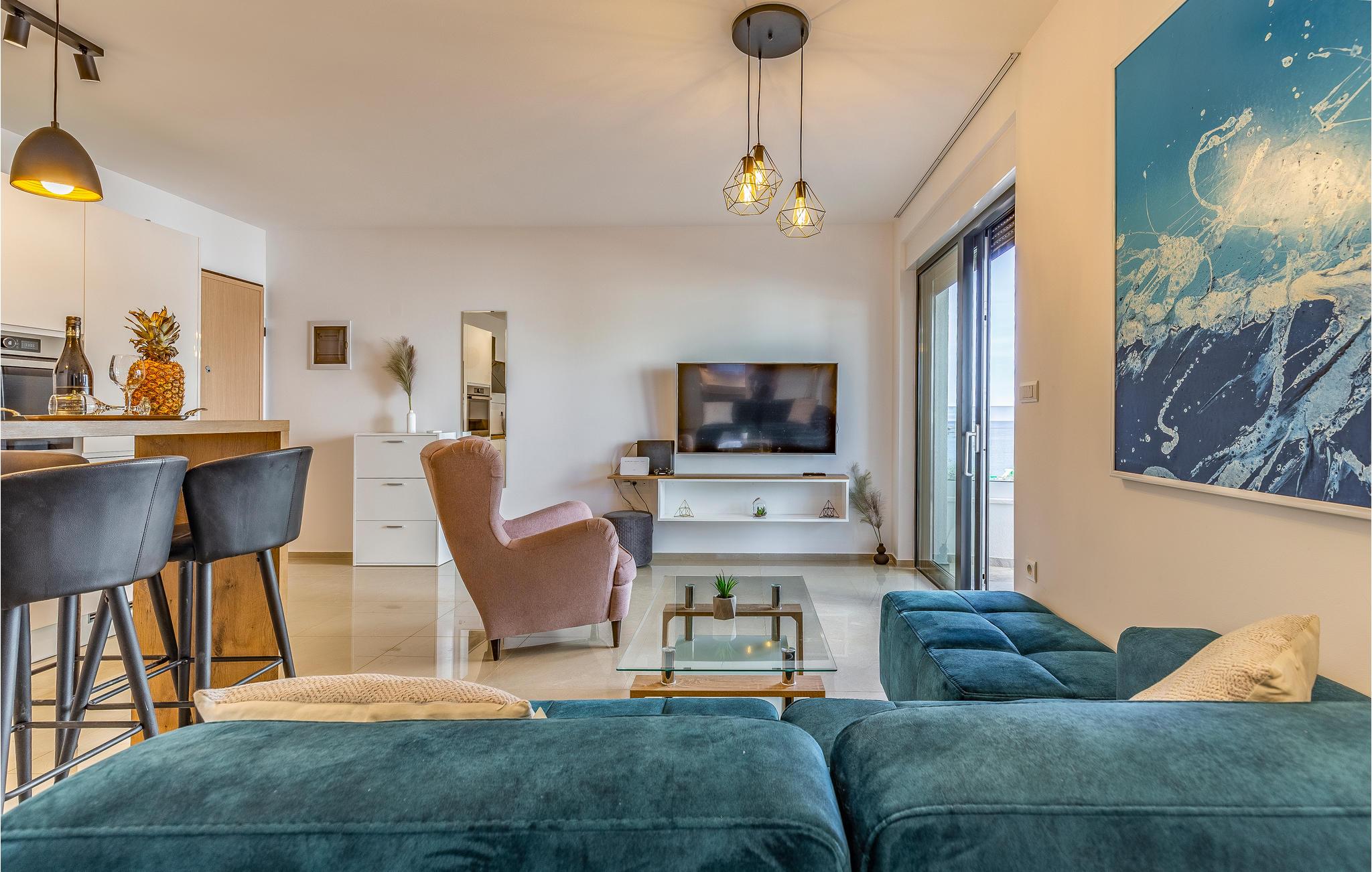 Diese Ferienwohnung liegt in erster Reihe zum Meer und bietet einen wunderschönen Meerblick von der Terrasse. Das Herz der Wohnung ist der helle Wohnbereich mit offener Küche und Sofa, wo Sie gut zusammen kochen und auf dem Sofa entspannen können. Ihnen stehen außerdem zwei Schlafzimmer zur Verfügung.