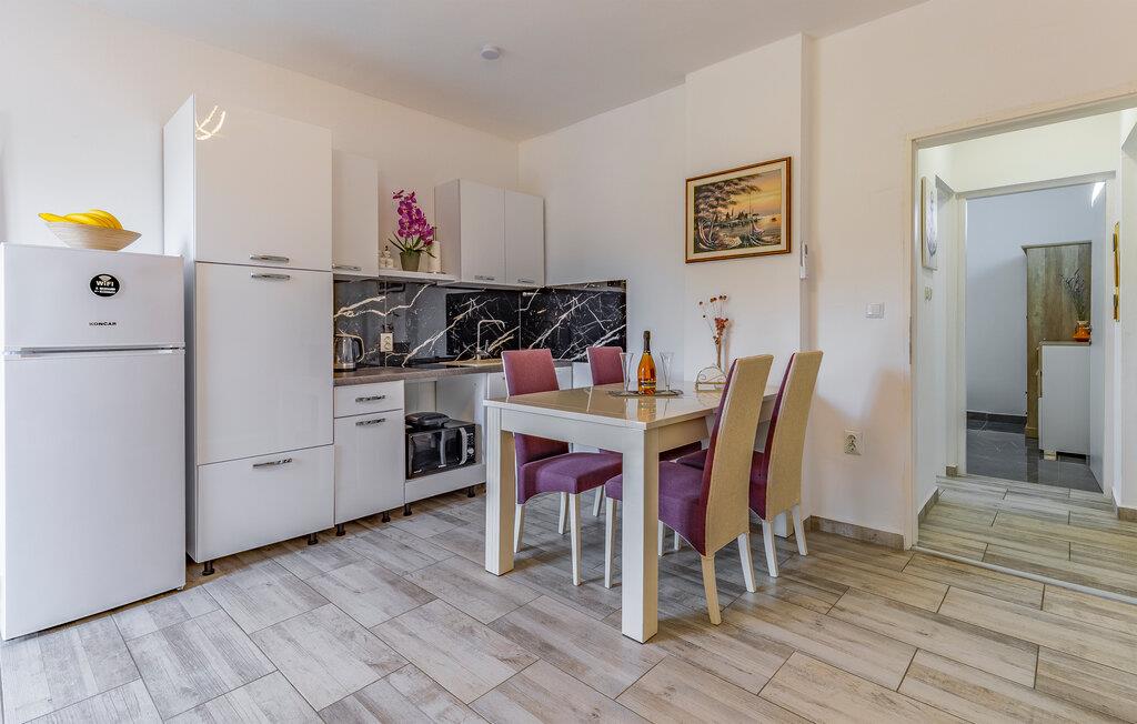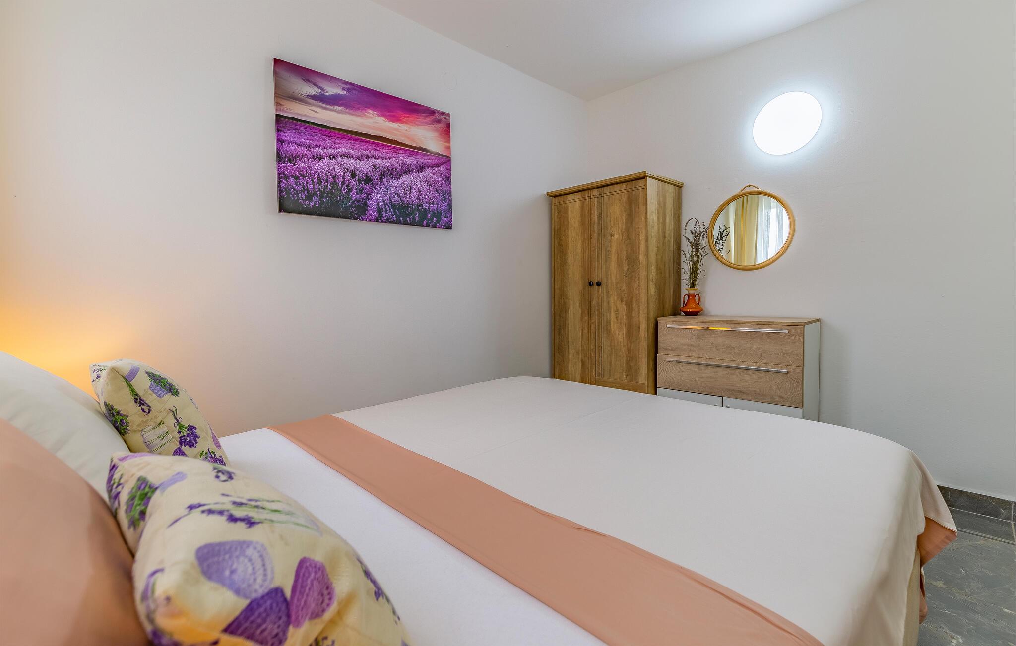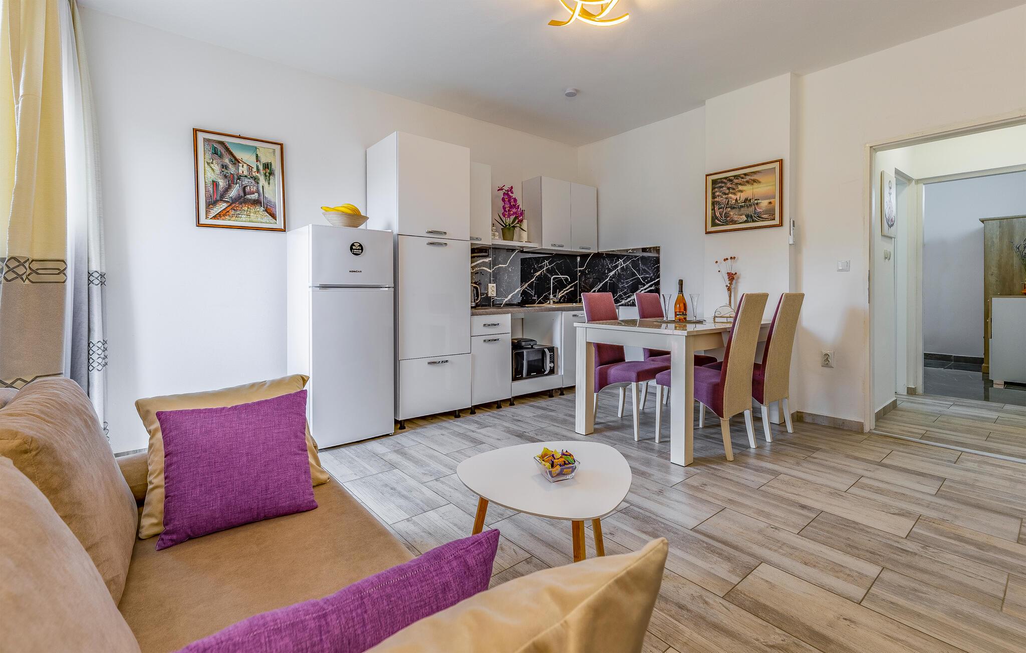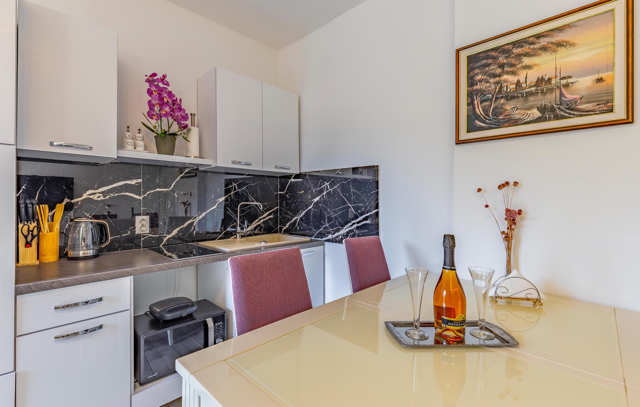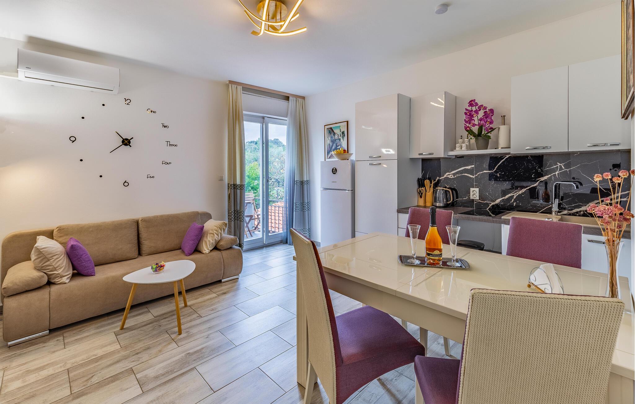Wenn Sie einen Urlaub nahe dem Meer planen, in dem auch Erlebnisse in der Umgebung nicht zu kurz kommen, ist diese Wohnung die richtige Wahl. Sie empfängt ihre Gäste nicht weit vom Strand und bietet mit einladenden Räumen und einer schönen Aussicht einen idealen Rahmen für Ihre Auszeit zu zweit. Machen Sie es sich nach einem aktiven Tag im Wohnzimmer bequem, essen Sie gemeinsam bei offener Terrassentür und plaudern Sie auf dem Sofa noch lange.