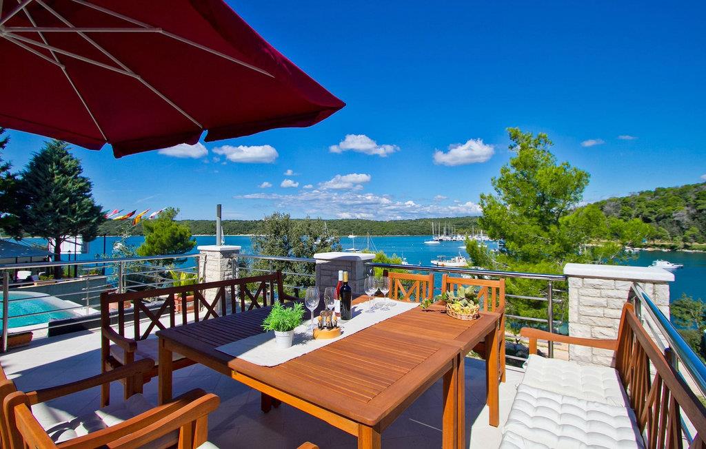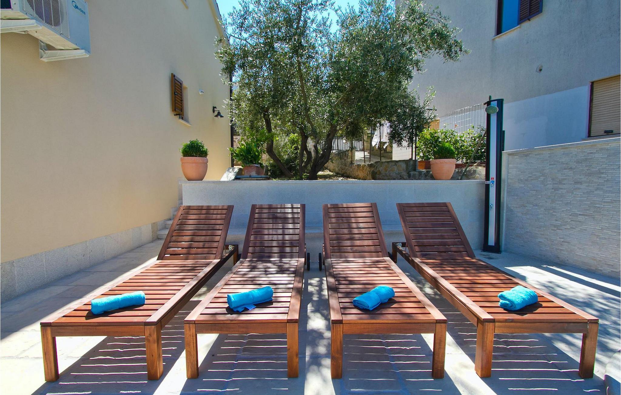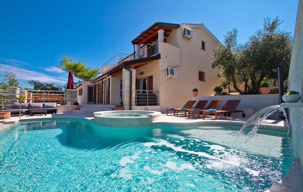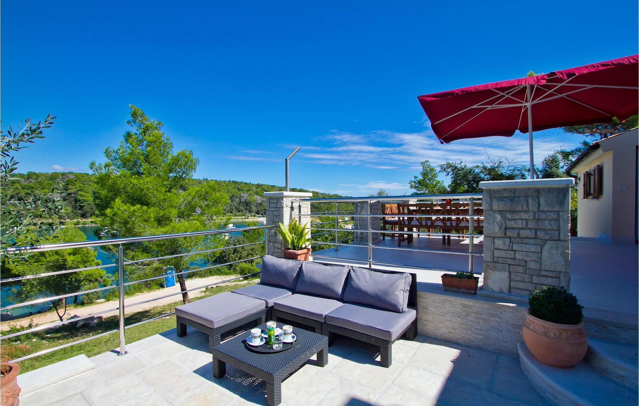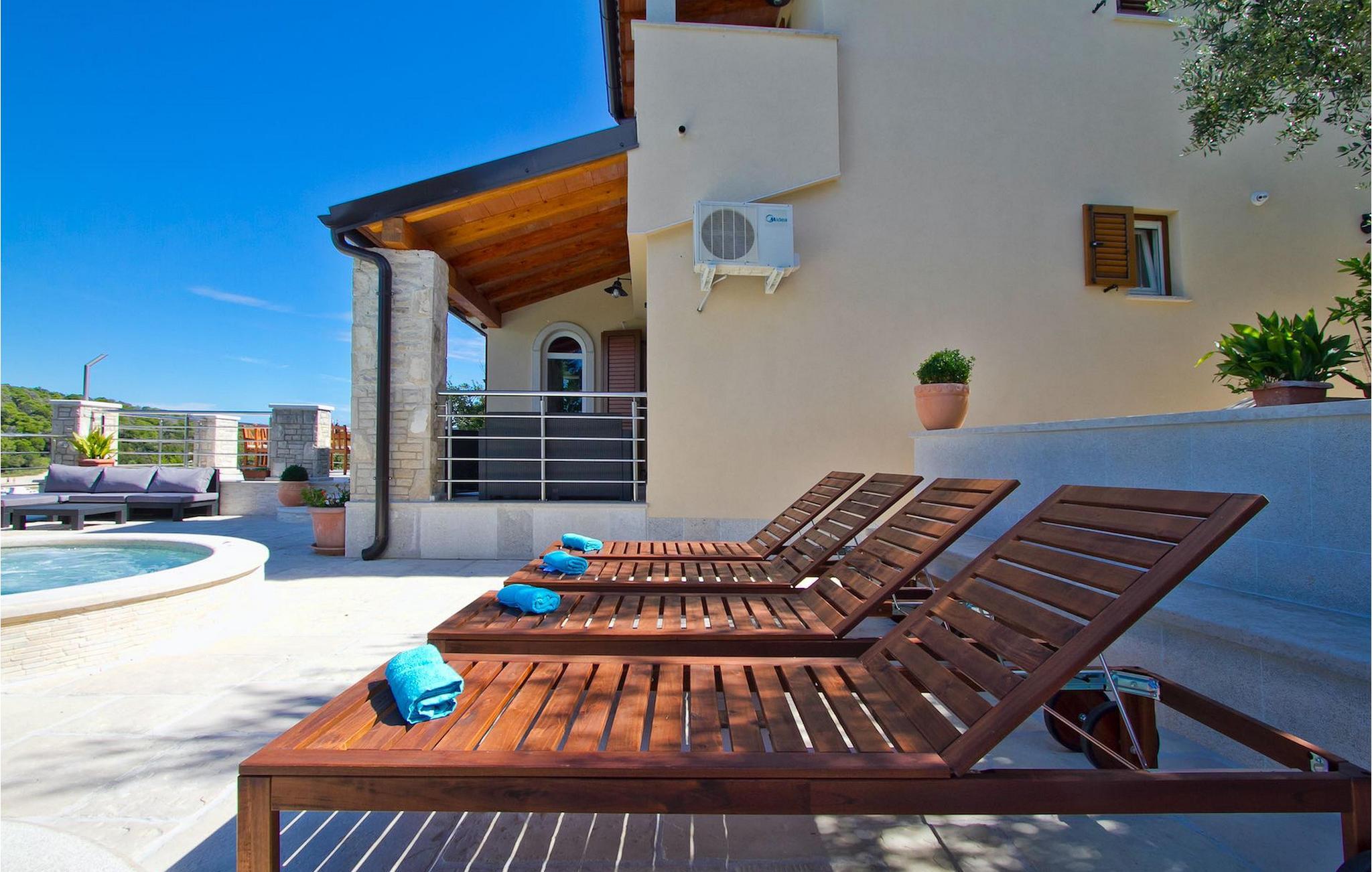 Die fünf geschmackvoll eingerichteten Schlafzimmer verteilt auf zwei Etagen bieten Platz für bis zu 8+1 Gäste. Der Innenbereich ist hell und luftig gestaltet, durch die Holzbalken trotzdem gemütlich. Das schicke Wohnzimmer, der Essbereich und die komplett ausgestattete Küche sind miteinander verbunden. Im Erdgeschoss befinden sich zwei Schlafzimmer mit Doppelbett, eines davon mit eigenem Bad mit Dusche, ein Badezimmer und eine Toilette. Im Obergeschoss finden Sie zwei Schlafzimmer mit Doppelbett und jeweils eigenem Bad mit Dusche sowie ein Einzelzimmer. Zudem verfügt ein Doppelzimmer im Obergeschoss über eine private Terrasse mit wunderschönem Meerblick. Der Außenbereich ist gut gestaltet und geräumig. Einige verschiedene Ebenen und getrennte Terrassen lassen Möglichkeiten, sich zurückzuziehen und die Privatsphäre zu genießen oder gemeinsame Stunden mit den Liebsten zu verbringen. Den wundervollen Pool werden Sie an heißen Sommertagen nur sehr ungern verlassen, denn hier lässt es sich mit dem fantastischen Blick auf die Bucht Soline mit Ihren Yachten und Fischerbooten und dazu einem kühlen Getränk in der Hand einfach prima entspannen! Falls Sie doch mal der Wunsch nach Strand überkommt, so ist dieser nur 30m entfernt. Wenn Sie Gruppenaktivitäten lieben, stehen Ihnen ein Tisch für Tischtennis und Kicker zur Verfügung.